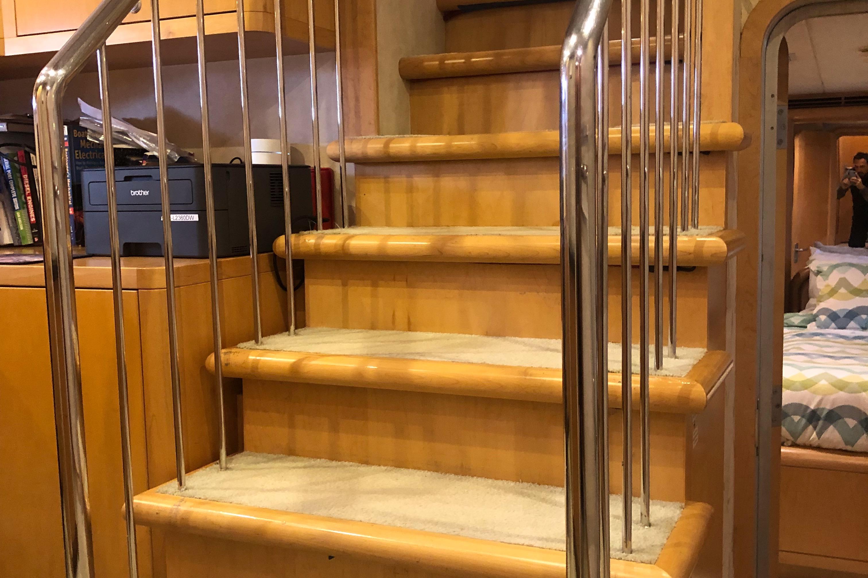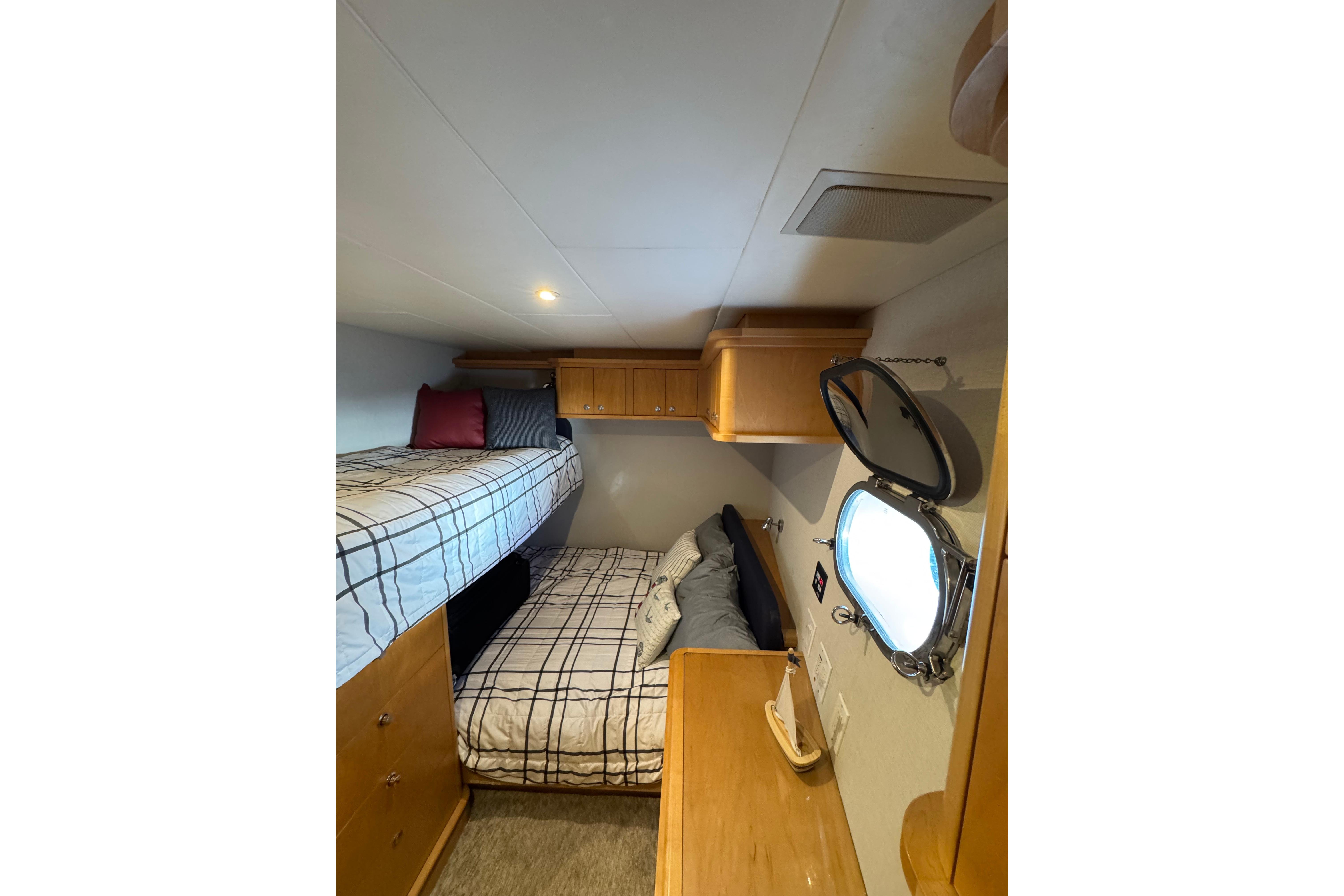 Flybridge access is by way of full stairs through a watertight door from the pilothouse to the sundeck and full stairs from the sundeck to the flybridge. Huge 27'x19' sun deck for parties and lounging in the sun. In 2009 the stainless steel railings were reinforced and custom crane and dinghy were added.