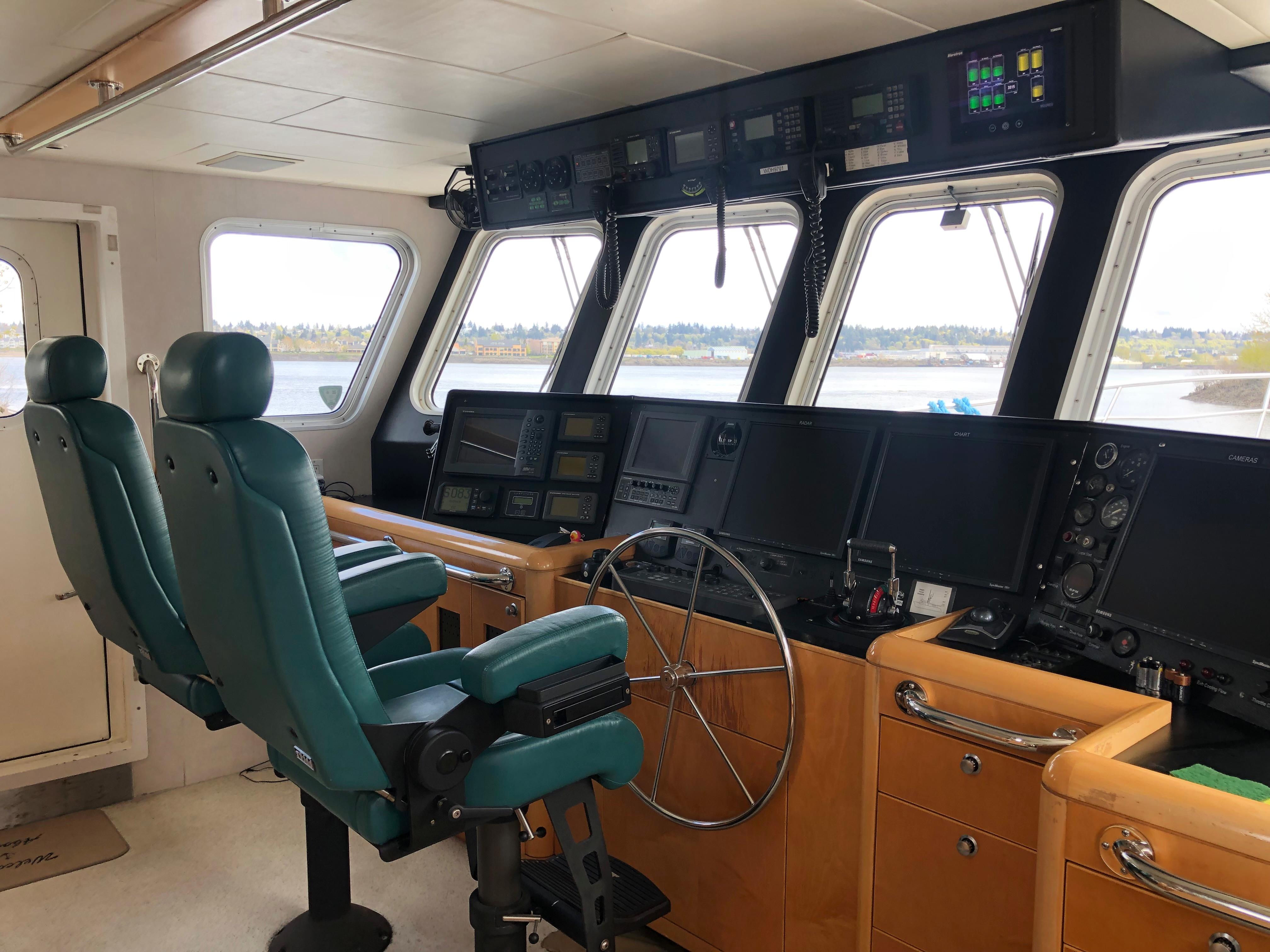 Entry to the pilothouse is up 2 steps from the galley/salon or from port or starboard watertight doors or from the flybridge. The pilothouse is every helmsman's dream: Panoramic windows, Stidd captain seats, pilot berth, settee for several guests, and electronics with redundancies.