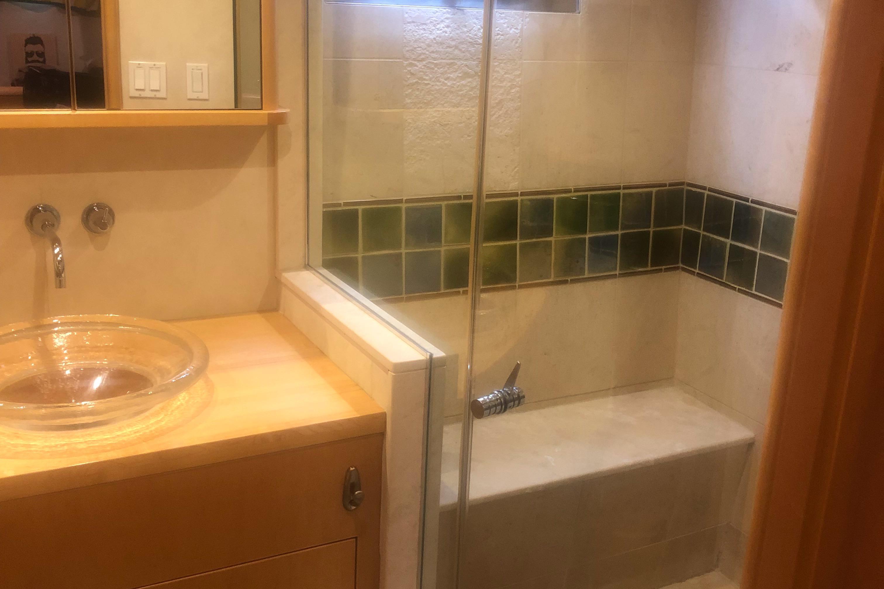 Watertight door from starboard side into galley. The salon is separated from the galley by the custom designed island. The two level island serves as casual dining for 3, as well as being set up as a separate work station. Picture window above the sink. The 3 bar stools are on unique slides that also provide flexibility for additional seating in the salon. Generous pantry and drawer stowage including drawers for pots and pans. Sole, walls, and backsplashes are ceramic tile with custom tile accents. Red lights for night operation.