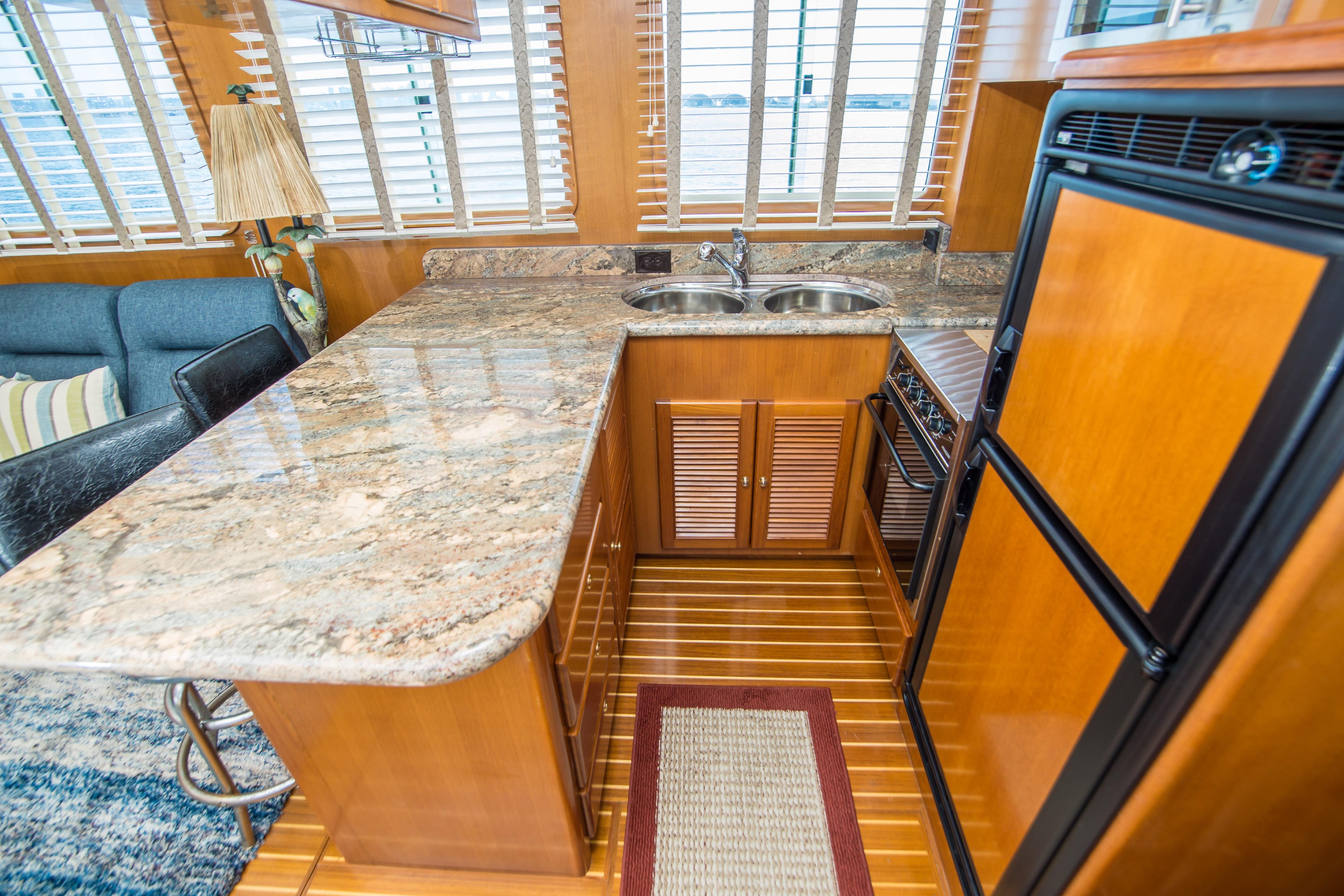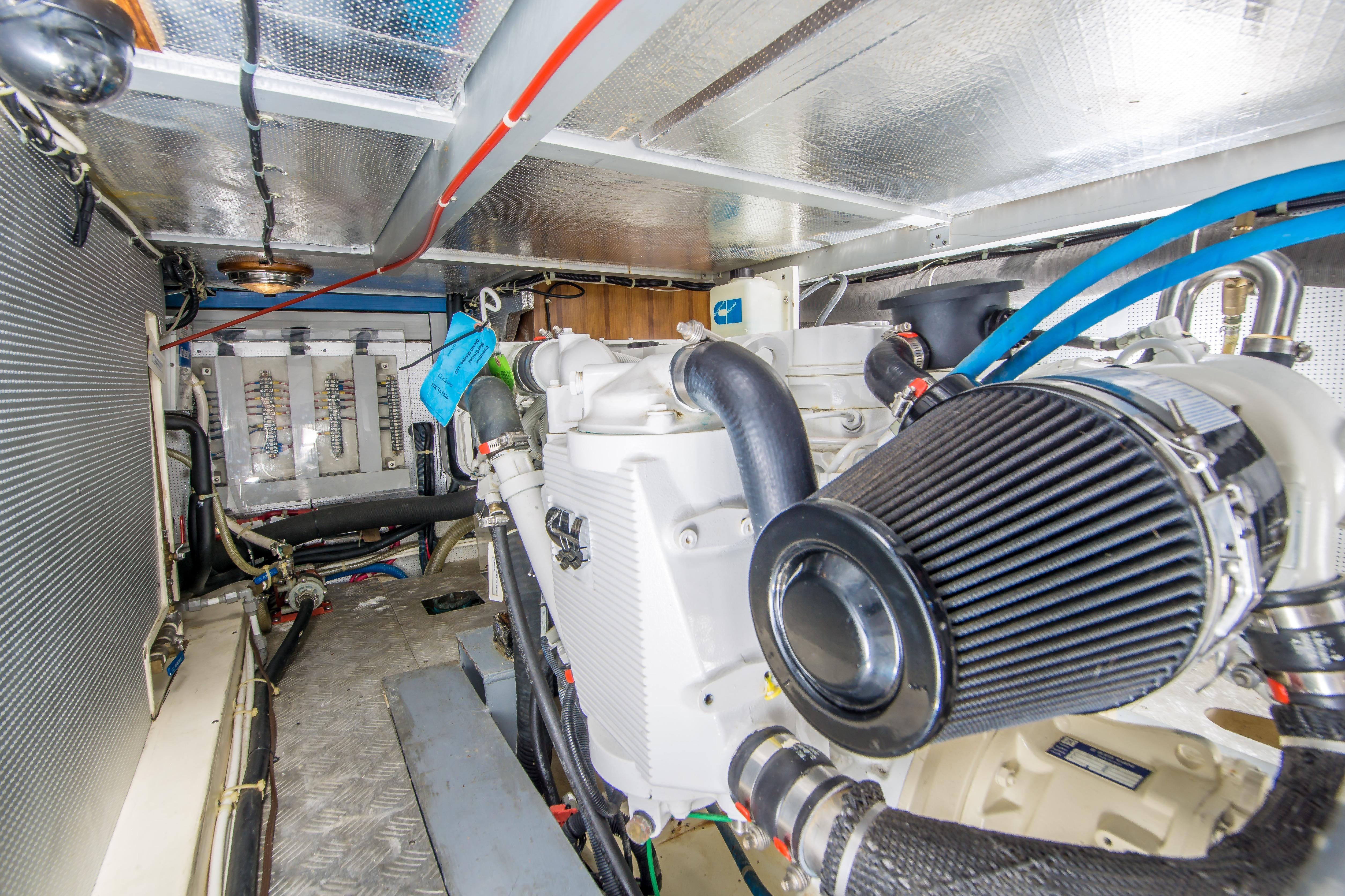The engine room is well laid out and all machinery is easy to access, including the Northern Lights generator with 115 hours. With bow and stern thrusters, she can be docked seamlessly and maneuver in tight quarters.