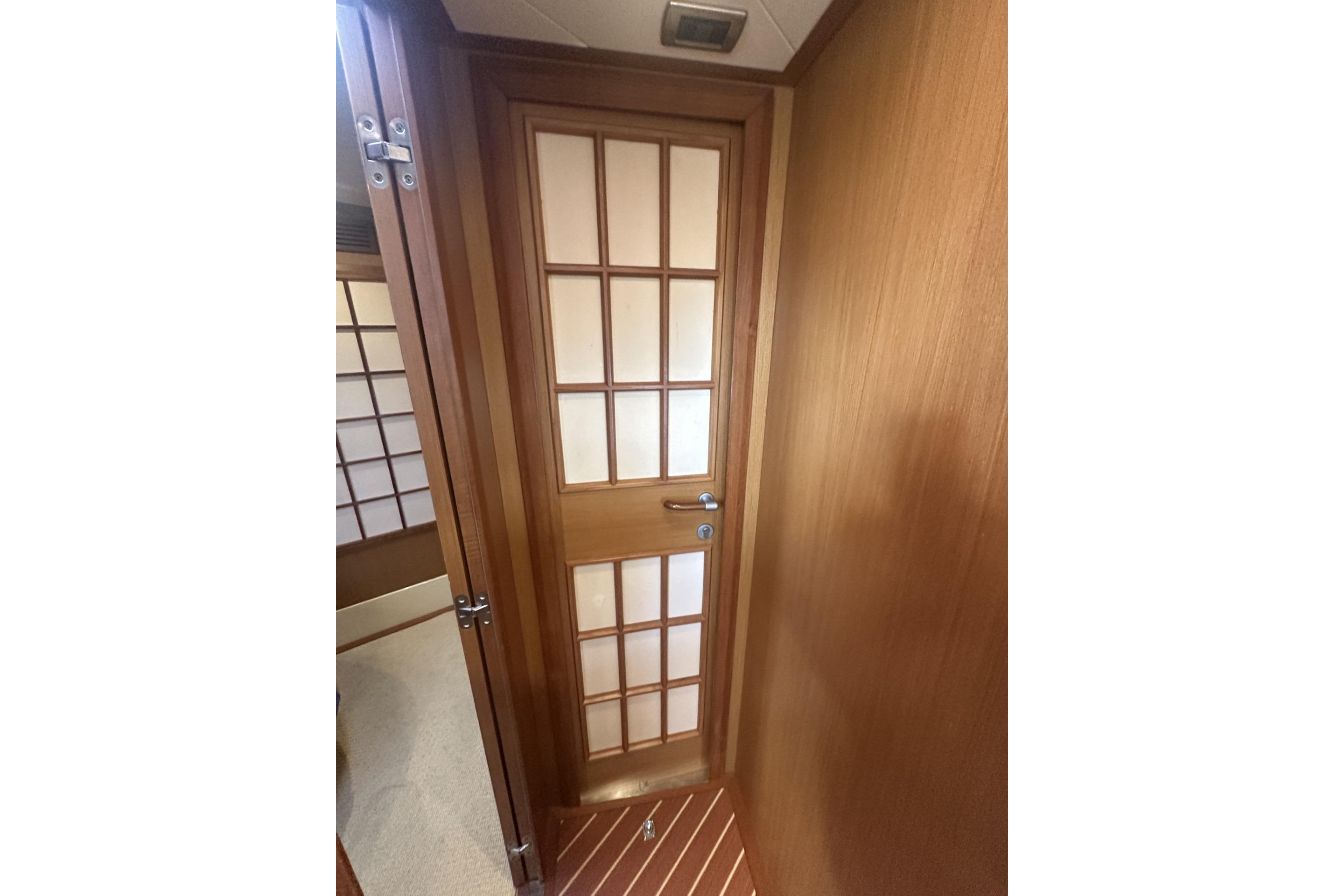 Primary Stateroom- Beautiful wood cabinetry with additional striking rich features of Shogi doors and accent windows.