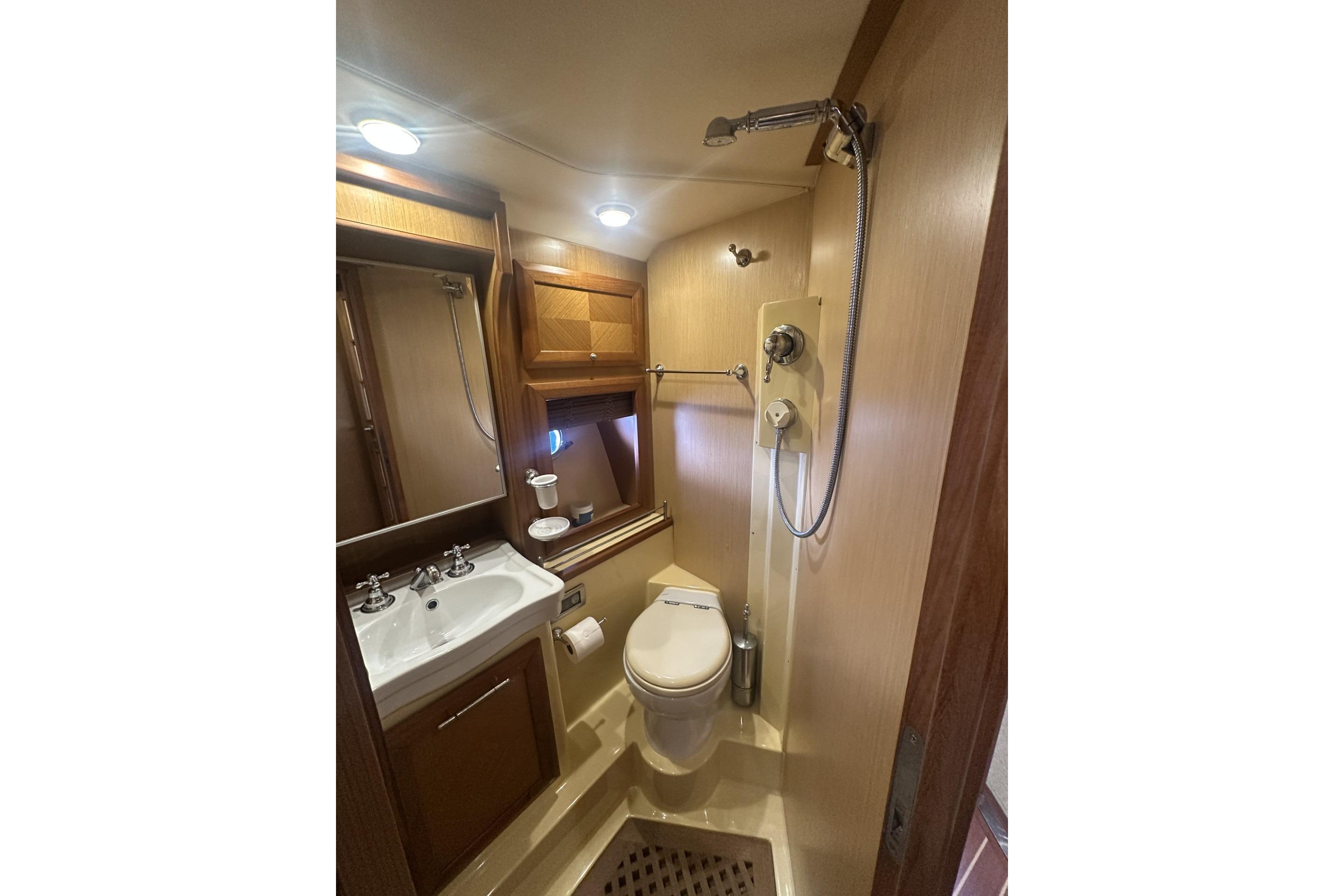 As the Primary head but a tad bit smaller the private ensuite head is attractively designed with a rich feel and great lighting. The shower is perfectly laid out with both a fixed and hand held showering option. The grated teak floor is a perfect fit and adds to the rich feel you get throughout this beautiful yacht.