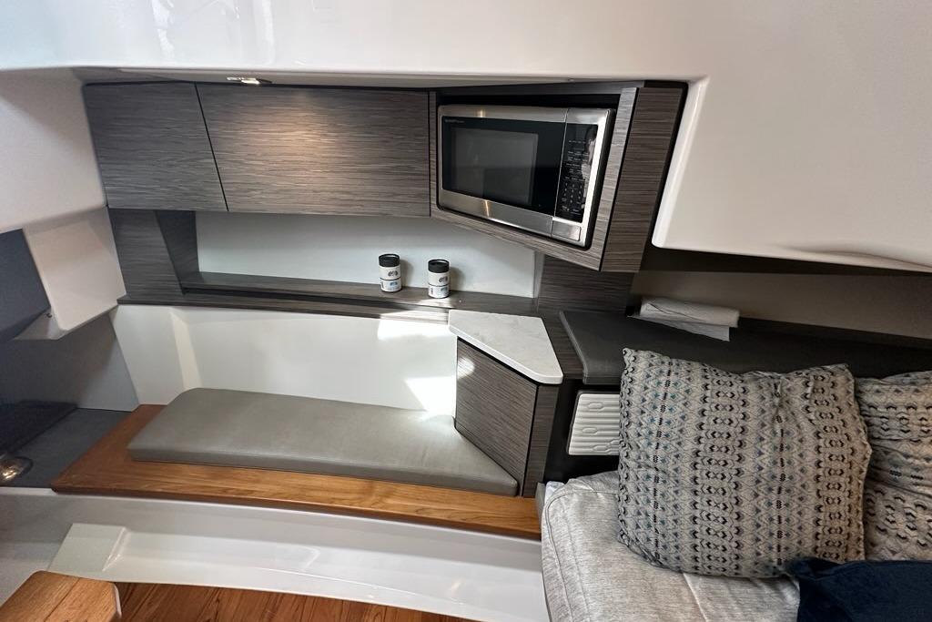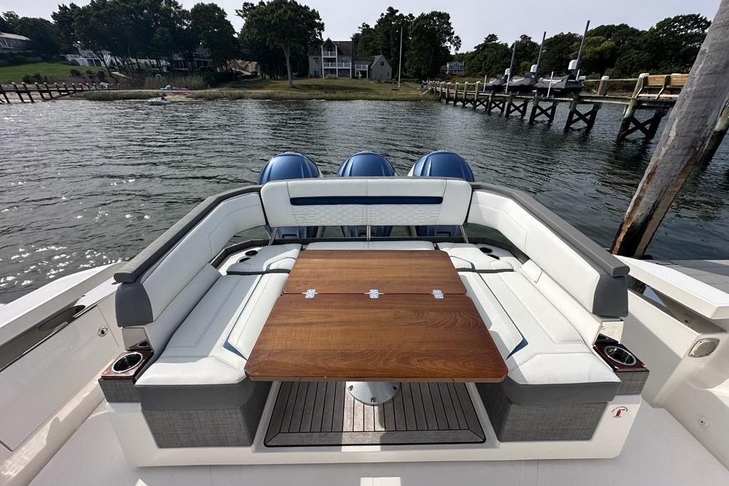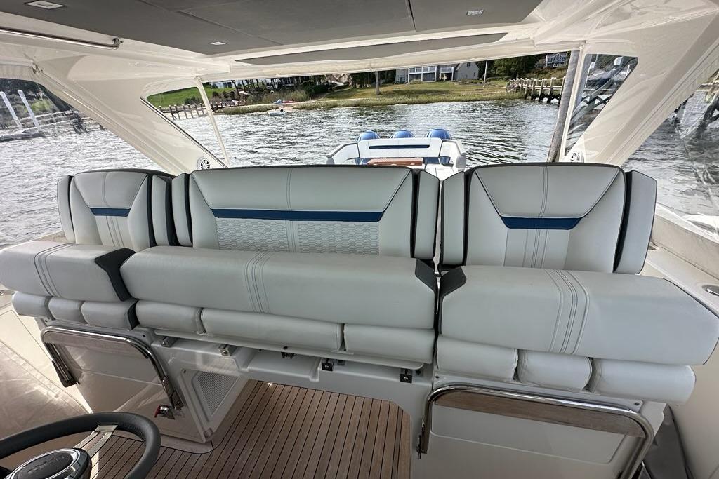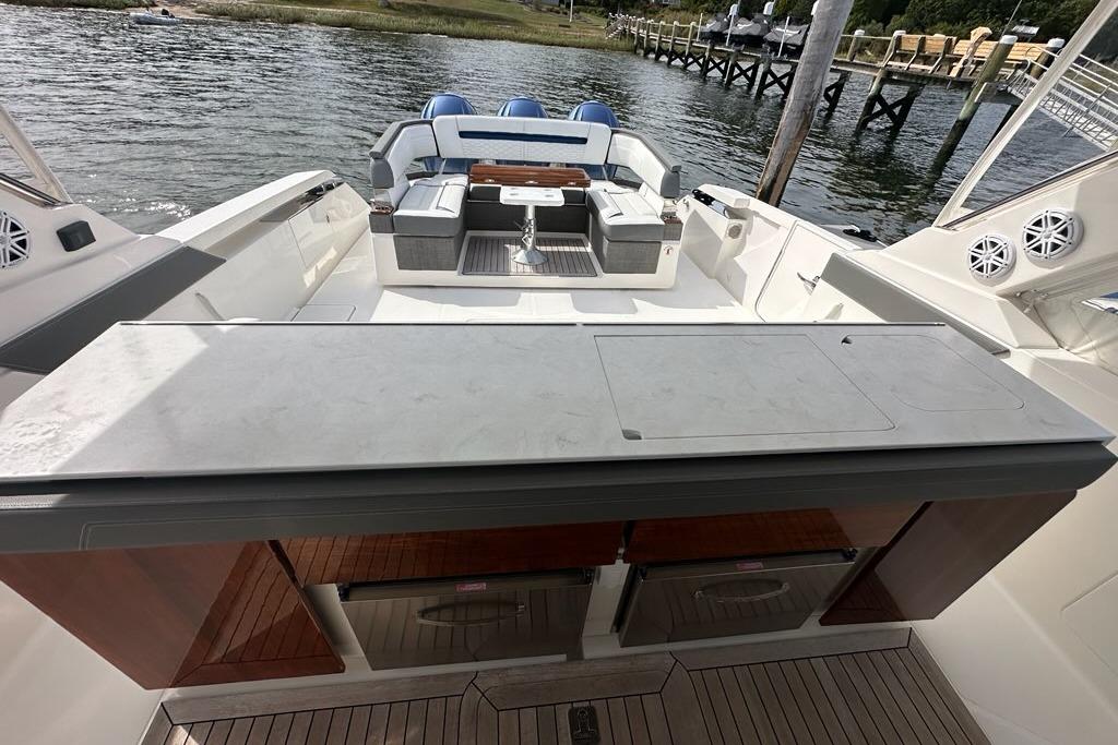 The sleek styling of the 43 LS is best complemented by power and performance. Yamaha® power combined with glass cockpit integrated electronics including Garmin® Marine navigation systems provide comfort and control at the helm. Optional Yamaha® helm master joystick steering offers an additional level of command at the dock or underway. A fuel capacity of 400 gallons combined with a top speed over 50 mph gets you to your favorite port of call fast, giving you more time to enjoy with family and friends.