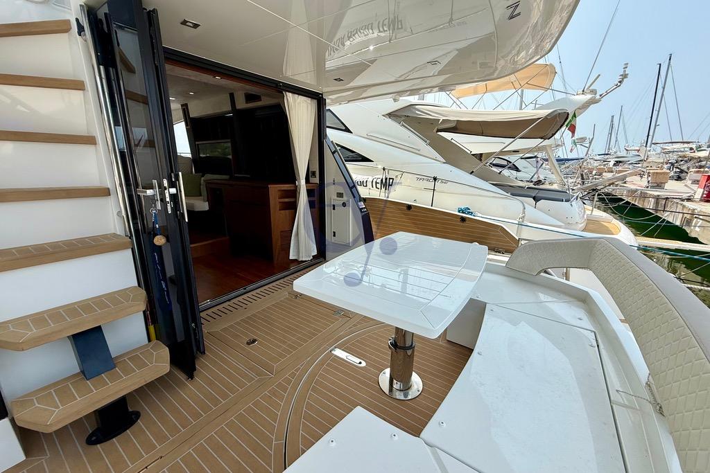Anchor - Auto Dynamic Trim Interceptor (Zipwake) - Water pump - 6 Batteries (2025) - Battery charger - Outdoor shower - 2 Stern thrusters - Tender garage - Platform (hydraulic teak, 500kg) - Automatic bilge pump - Entry door - Teak (synthetic) cockpit - Swimming ladder (integrated into the platform) - Cockpit table (folding) (can be converted into a sundeck) - Folding saloon table - Air conditioning (Webasto hot/cold) - BBQ/Grill - Water heater (dual system) - Wooden interior