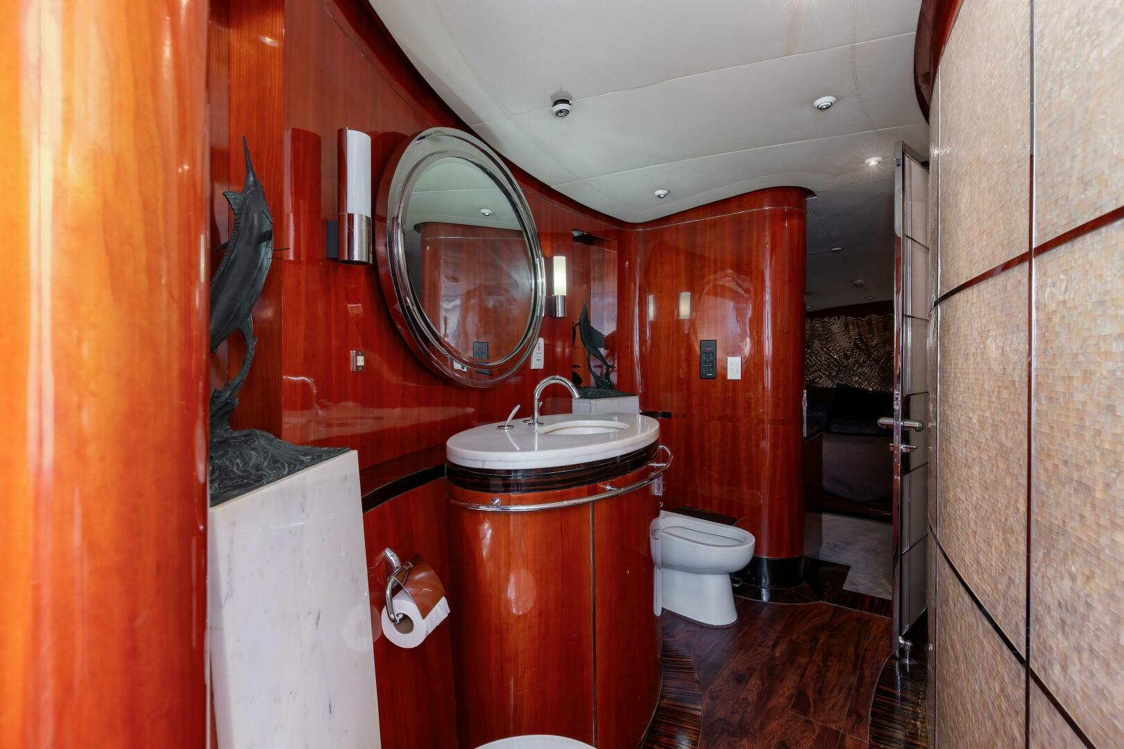 The cabin interior is arranged with guest's stateroom and crew's quarters along the port wing. The guest stateroom is fitted with an island berth, private head, a locker and a companionway privacy door. The Crew's quarters are fitted with over/under berths, a locker, a head and companionway privacy door. Crew's head can also be accessed through a companionway door. The cabin egress steps have a locker fitted with a clothes washer and dryer. The master stateroom's private head, master stateroom with an island berth, a settee, built-in cabinetry with a cold plate refrigerator and a privacy companionway door are along the starboard wing. The Up-cabin's companionway steps are the salon.