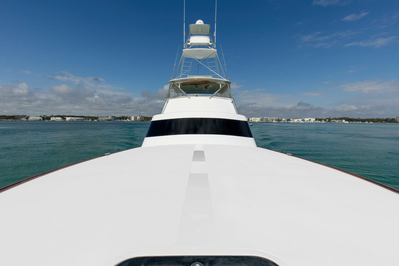 This beautiful Ebony 65 Convertible, custom built 2004 twin diesel power has everything needed for the fishing enthusiast. Including a cored fiberglass hull, decks and flybridge. Her modified-V hull has a raked stem with a deep-V entry, sharp chines and a continuing deep deadrise to the nearly square stern. Her decks have non-skid surfaces. The aft open cockpit is set up for the serious fisher. The flybridge, over the salon, is fitted with a center helm control console with a hide-away hydraulic activated electronics pod. Seating is provided by cushioned seating with a drink table forward and two pedestal mounted helm chairs aft. The Forward bridge cowling has a cold plate refrigerator and sink with single freshwater faucet. Weather protection is provided by a fiberglass hardtop in the tower with a clear vinyl U-zip enclosure. A tuna t owner is fitted over bridge.