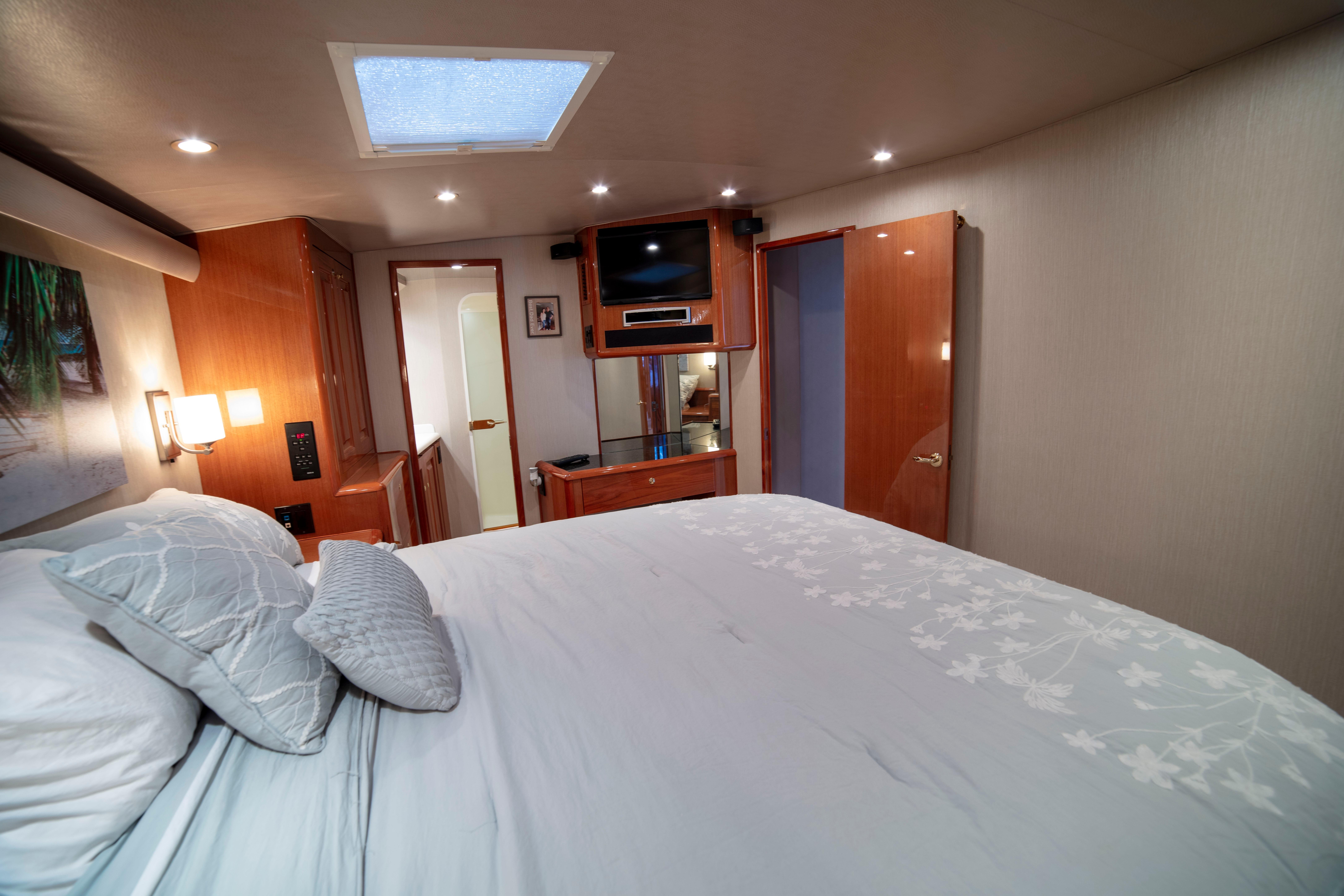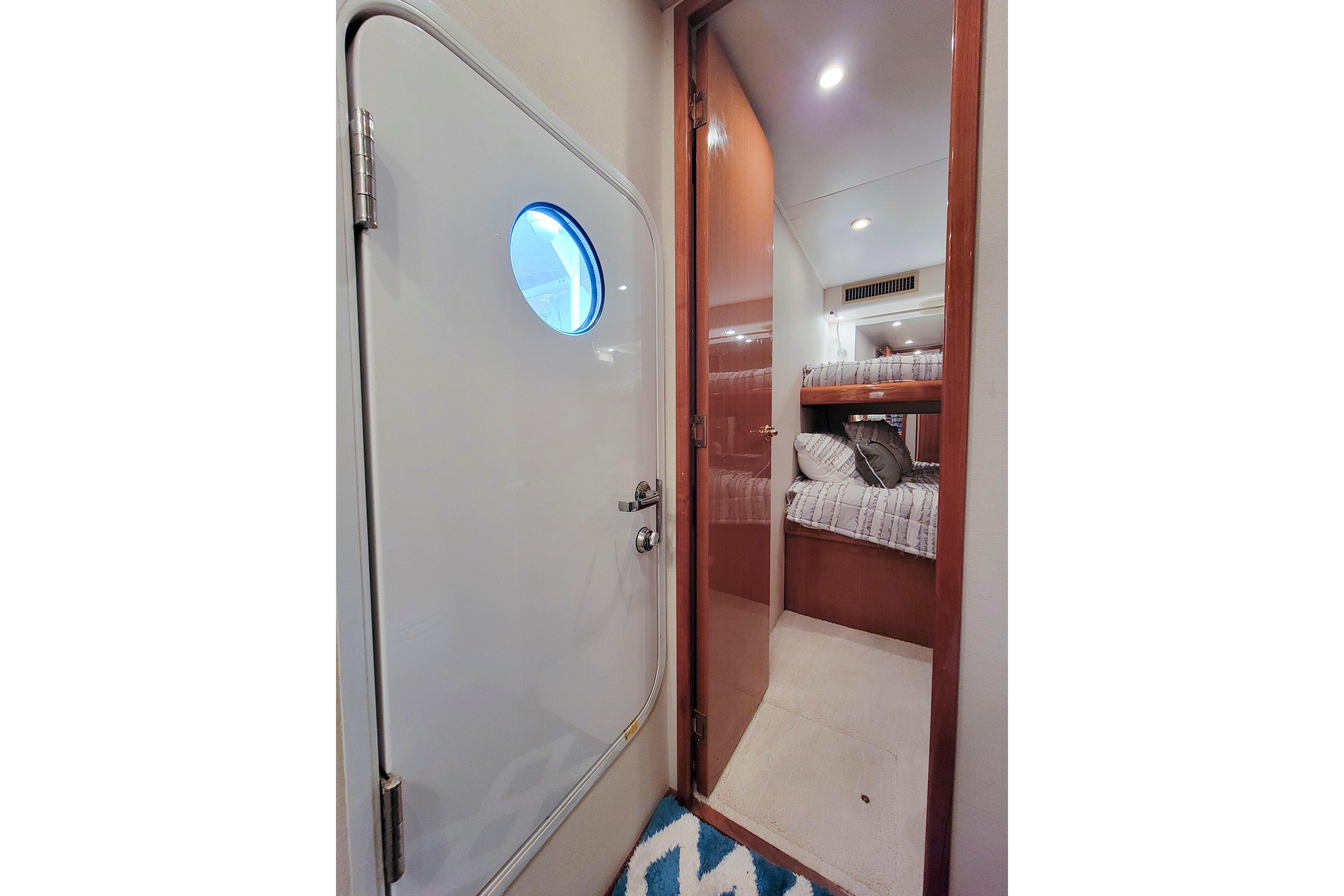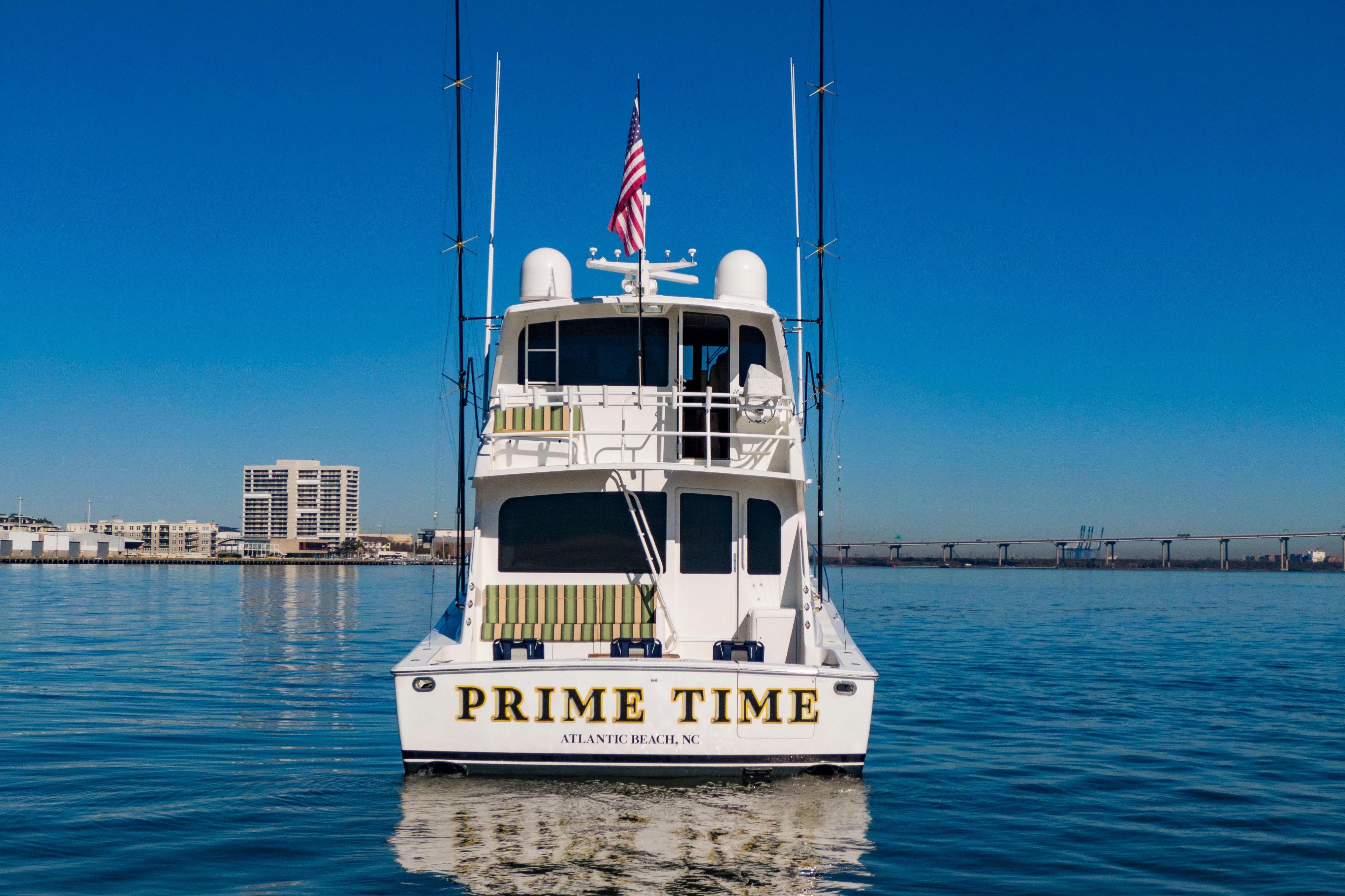 The highlight of PRIME TIME is her enclosed bridge helm and additional salon area. This allows the captain, owner, and guest to enjoy time on the water regardless of the weather conditions. PRIME TIME also features the upgraded 4 stateroom, 4 head layout. As you enter the main salon, the door is offset to Starboard to maximize interior space. The Salon features a large U-shaped sofa to Port with deep storage underneath the seating area. Great space to store tackle and gear. To Starboard is the ship's electrical panel, entertainment area, ice machine, and spiral staircase. Forward of this is the fully equipped galley and dinette as well as a large pantry. Moving below deck, the laundry center is to Starboard, and access to crew stateroom and engine room via crew access door is to Port. The master stateroom is to Port with an ensuite head. Forward is the VIP Stateroom with an additional crossover berth and ensuite head. The additional (upgraded room) is to Starboard which features a single birth with guest head.