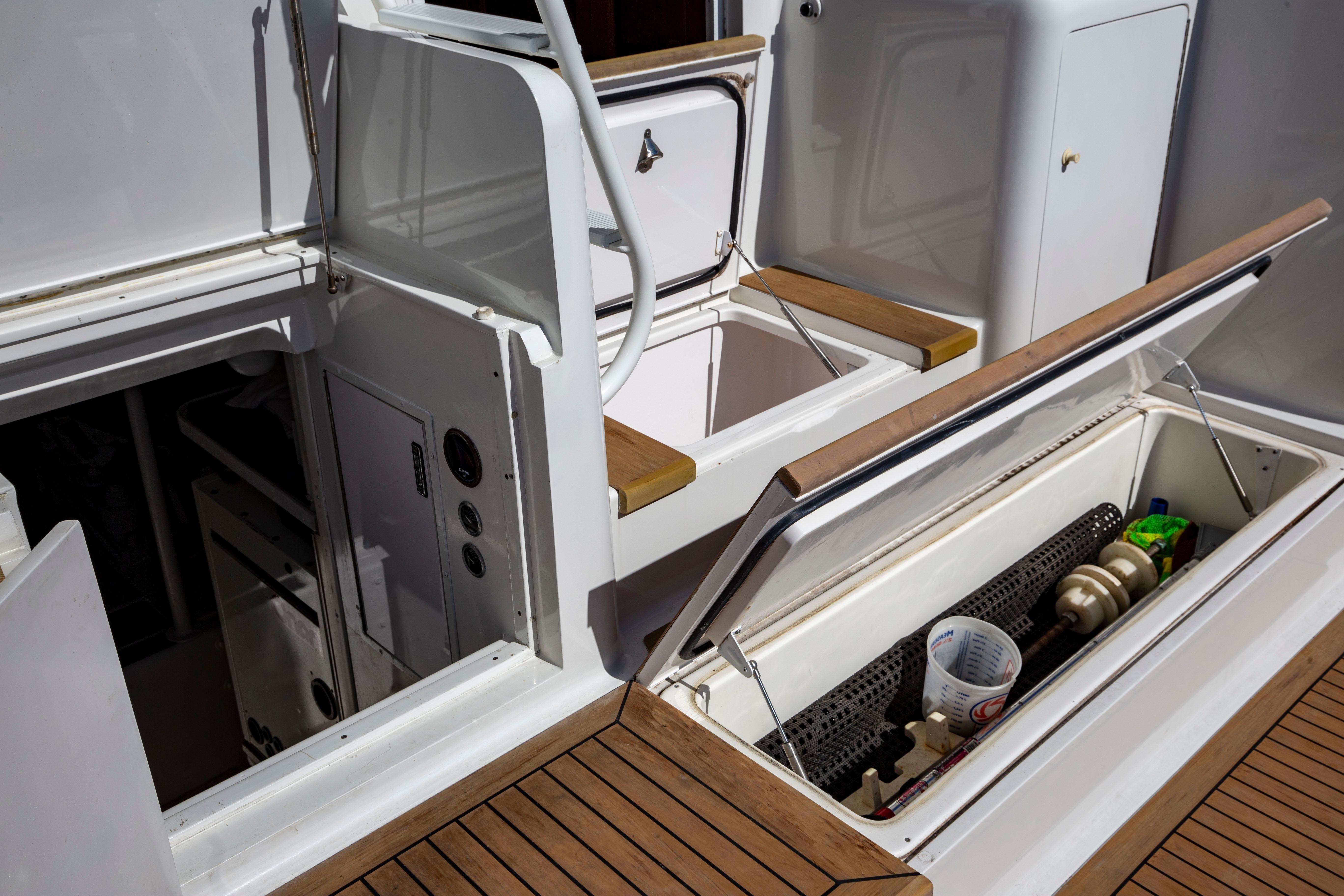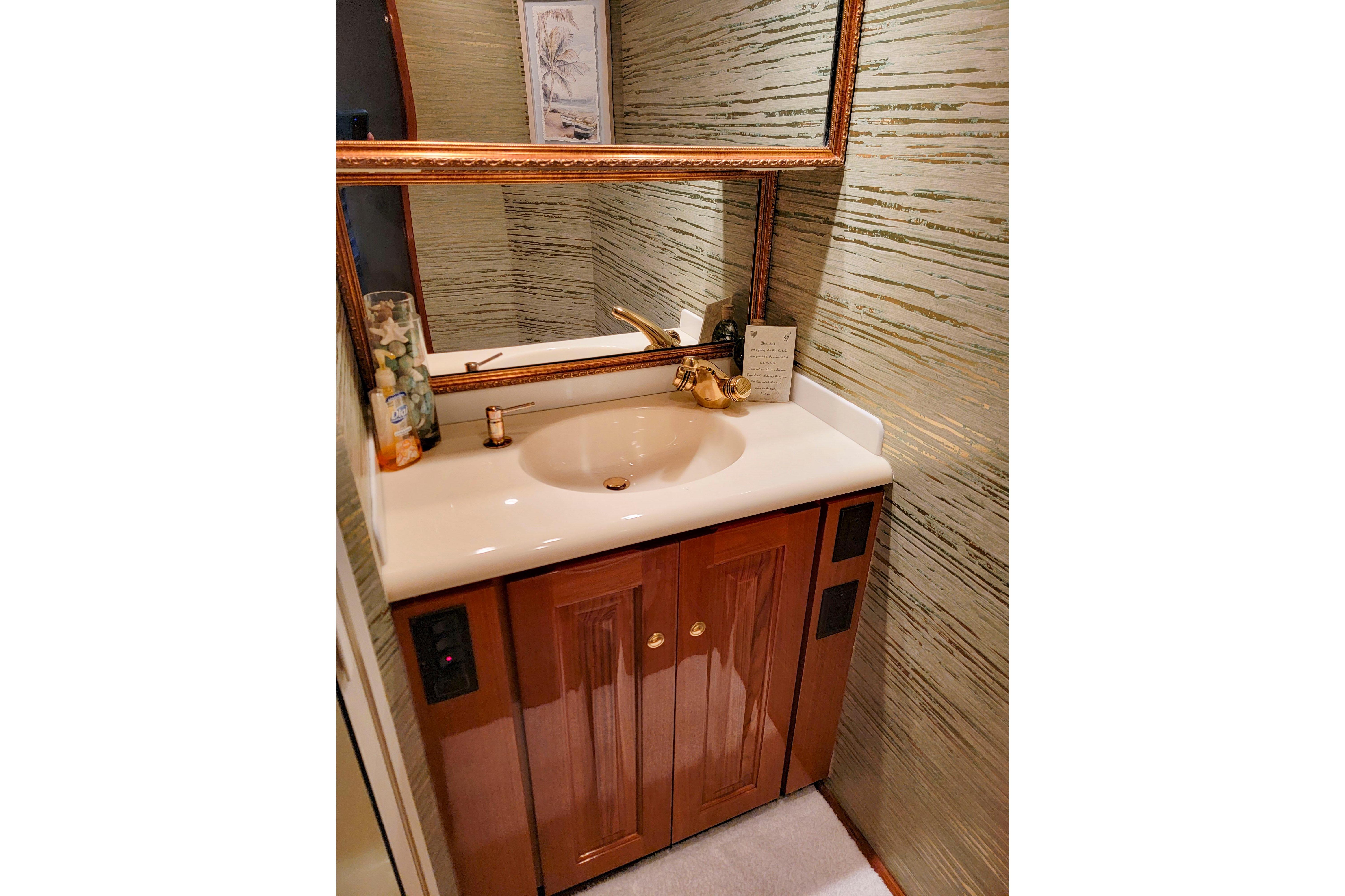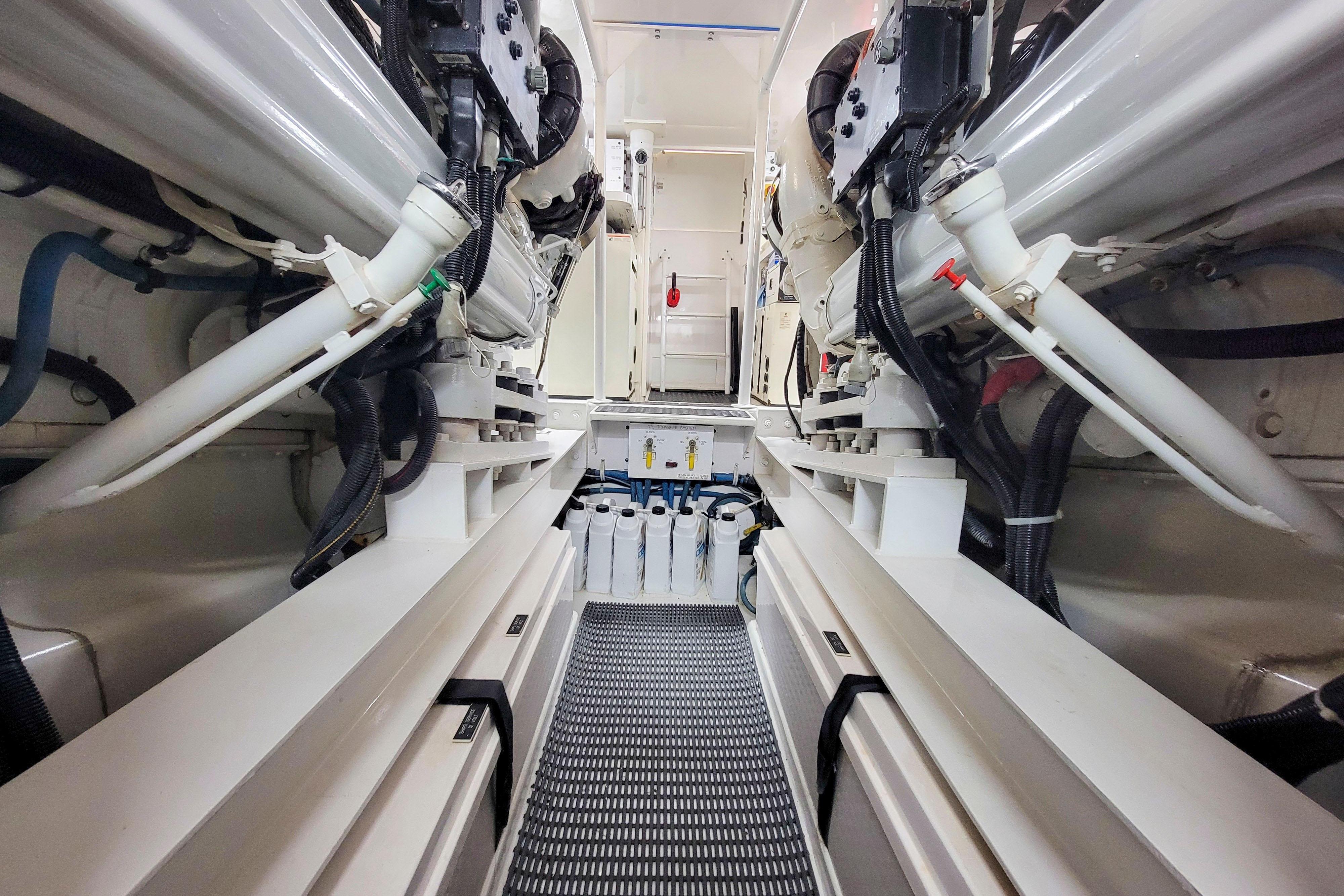 The highlight of PRIME TIME is her enclosed bridge helm and additional salon area. This allows the captain, owner, and guest to enjoy time on the water regardless of the weather conditions. PRIME TIME also features the upgraded 4 stateroom, 4 head layout. As you enter the main salon, the door is offset to Starboard to maximize interior space. The Salon features a large U-shaped sofa to Port with deep storage underneath the seating area. Great space to store tackle and gear. To Starboard is the ship's electrical panel, entertainment area, ice machine, and spiral staircase. Forward of this is the fully equipped galley and dinette as well as a large pantry. Moving below deck, the laundry center is to Starboard, and access to crew stateroom and engine room via crew access door is to Port. The master stateroom is to Port with an ensuite head. Forward is the VIP Stateroom with an additional crossover berth and ensuite head. The additional (upgraded room) is to Starboard which features a single birth with guest head.