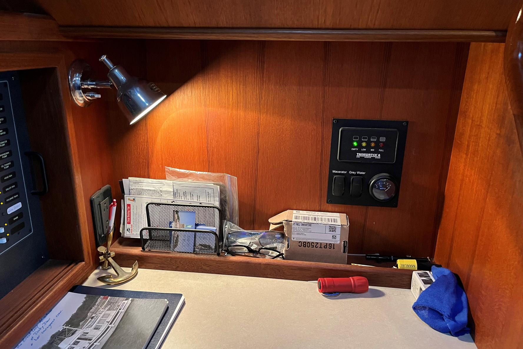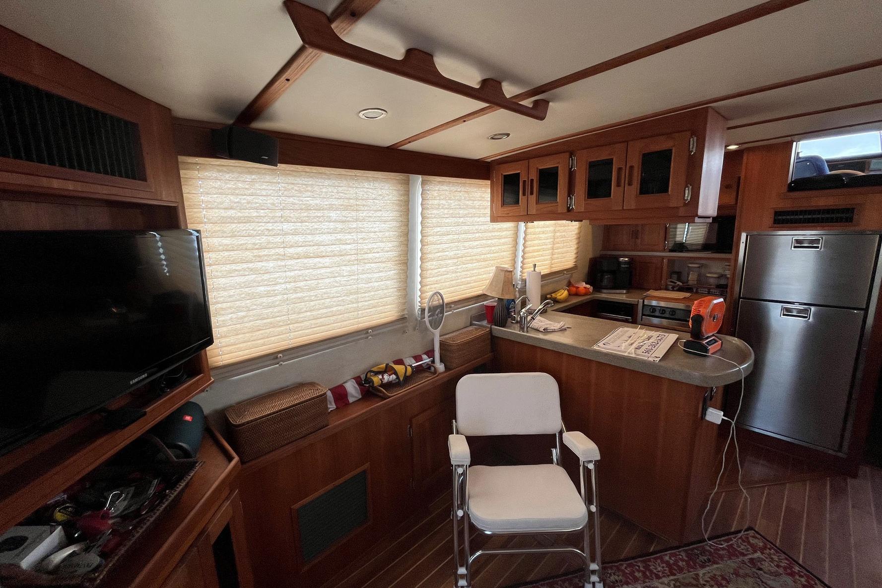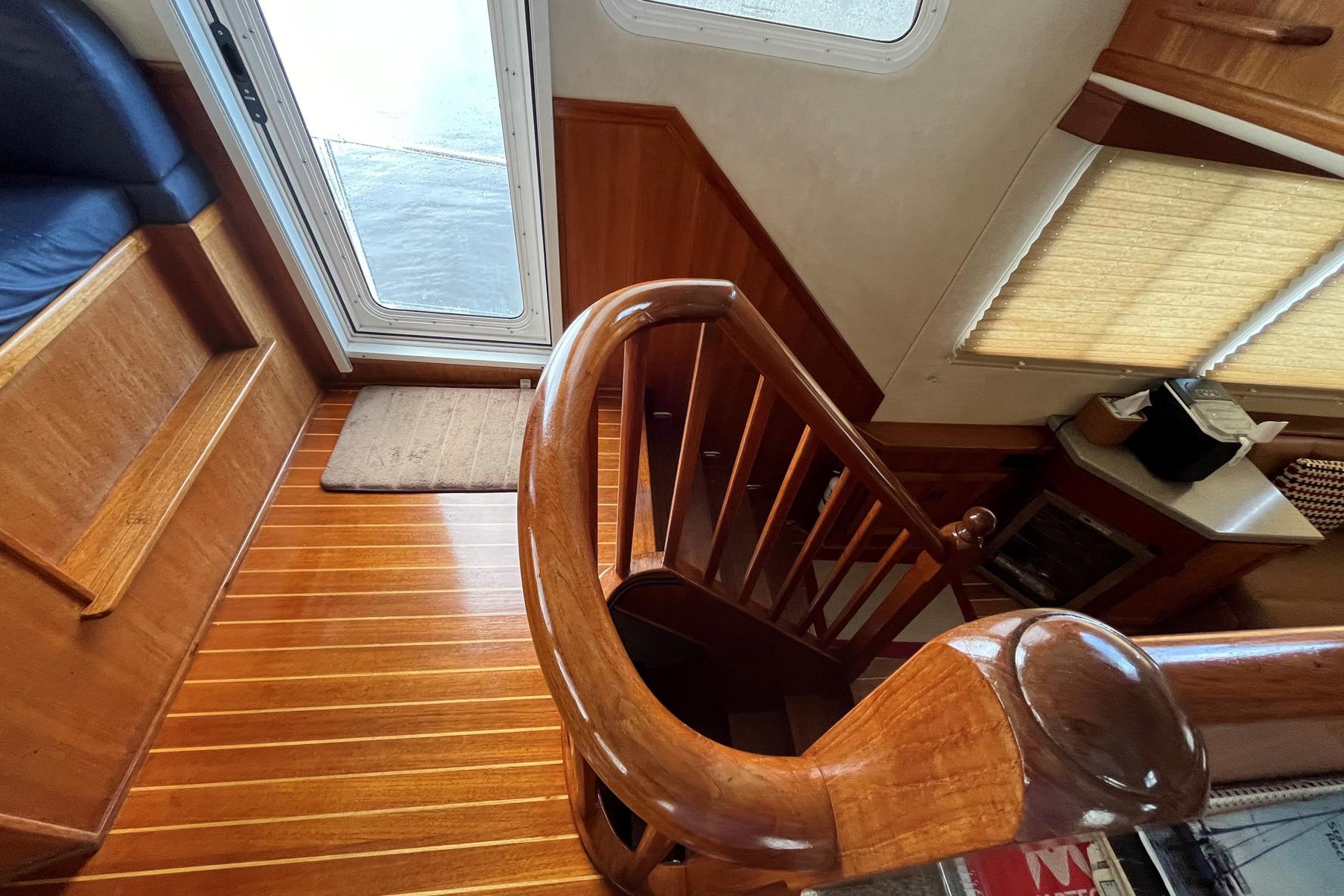 The bridge includes a substantial chart table, offers a 360-degree view, and provides direct access to the deck.