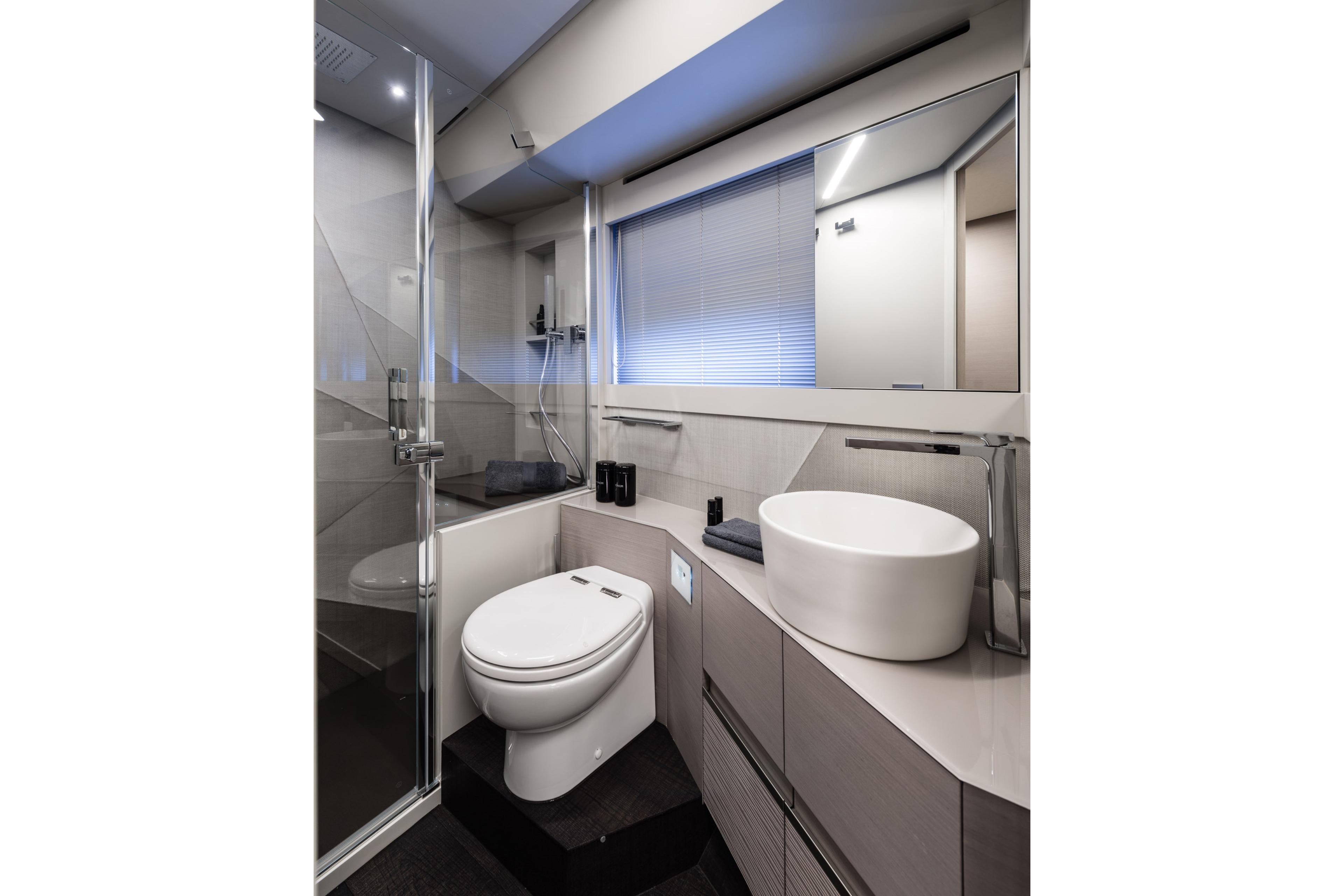 The spatial ergonomics is maximal thanks to volumes that blend technology and performance in perfect proportions. The open spaces allow the boat to be filled with pleasure and light, such as the large lounge characterized by the front openable windows and the dark glass sliding roof. The new, much larger rectangular portholes allow air and natural light to permeate the rooms below decks.
