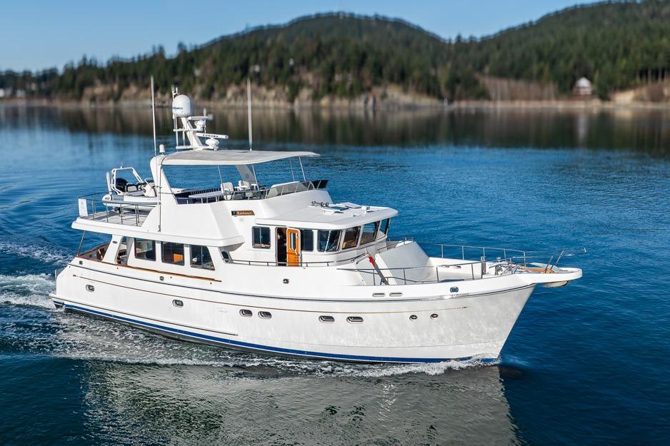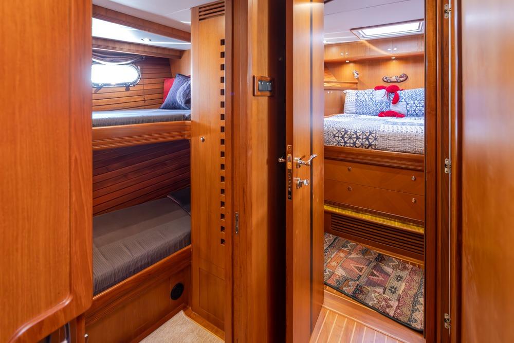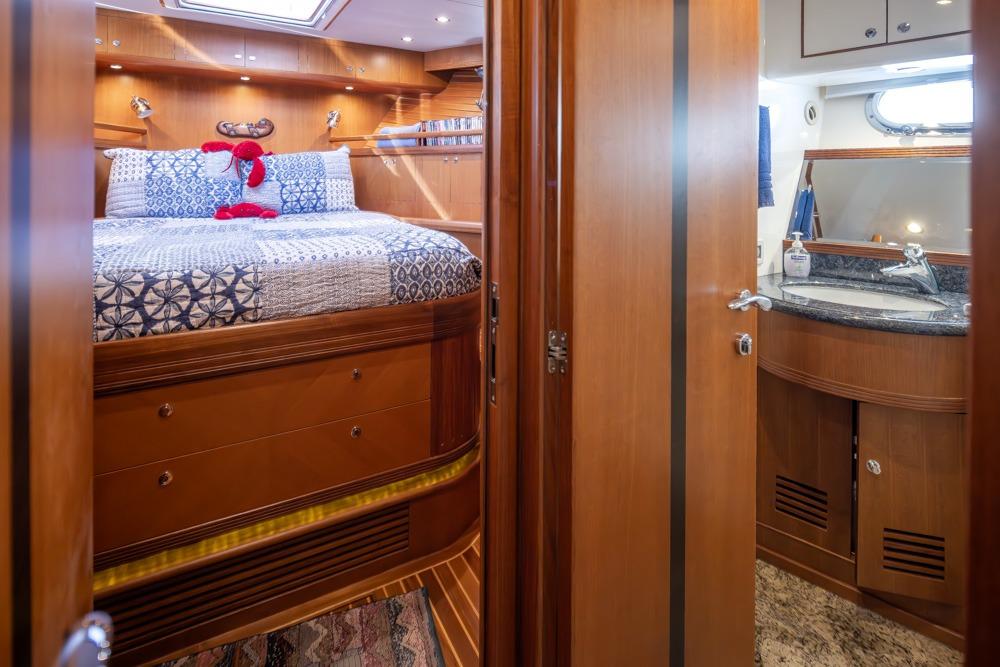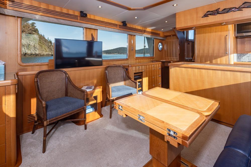 In the pilothouse you will find a well designed electronics package that is in easy reach from the dual Stidd Helm Chairs. Behind the helm, there is a L-shaped settee with a teak table, a wonderful place to sit while cruising or having dinner at anchor.
