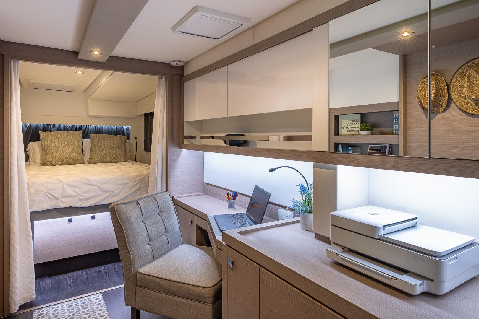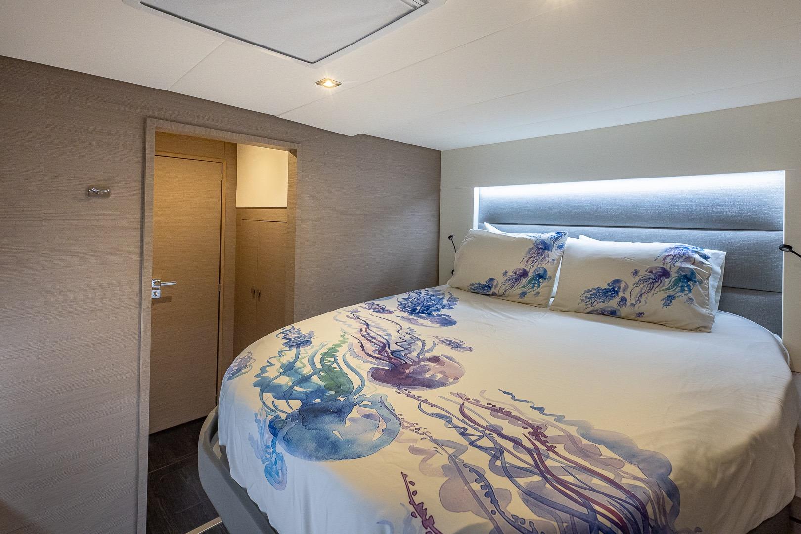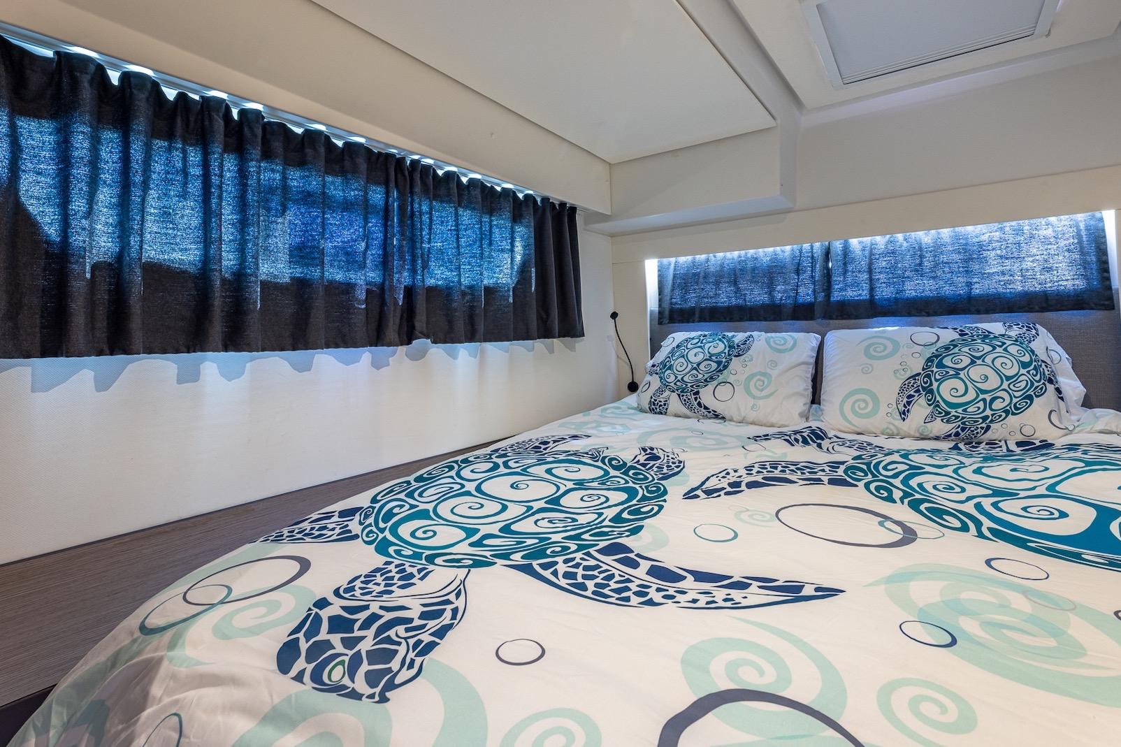 Owner stateroom takes entire port hull with blackout curtains, custom cabinetry, walk-in shower, and upgraded Casper Memory mattress