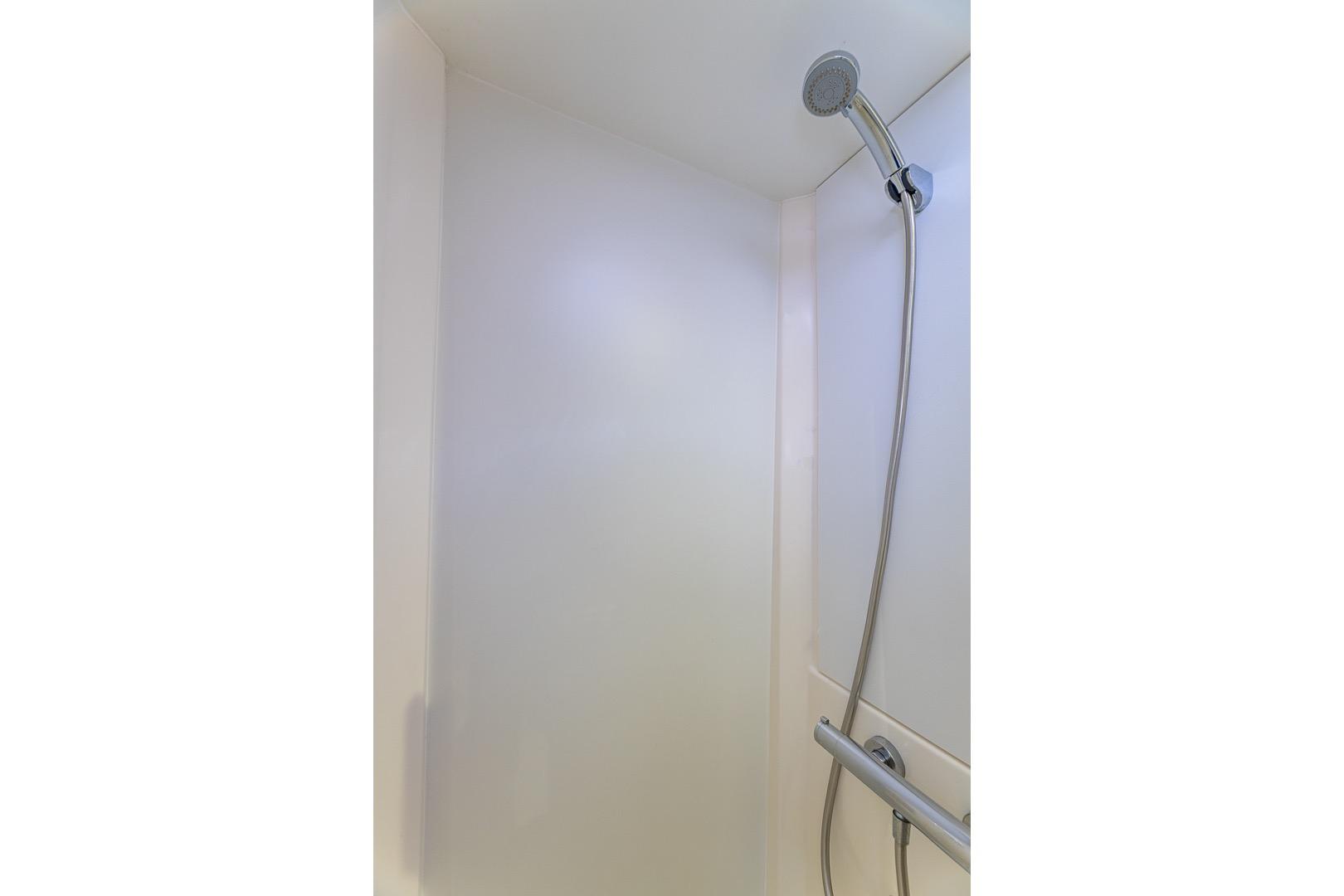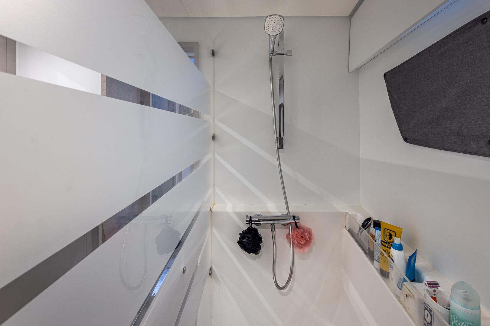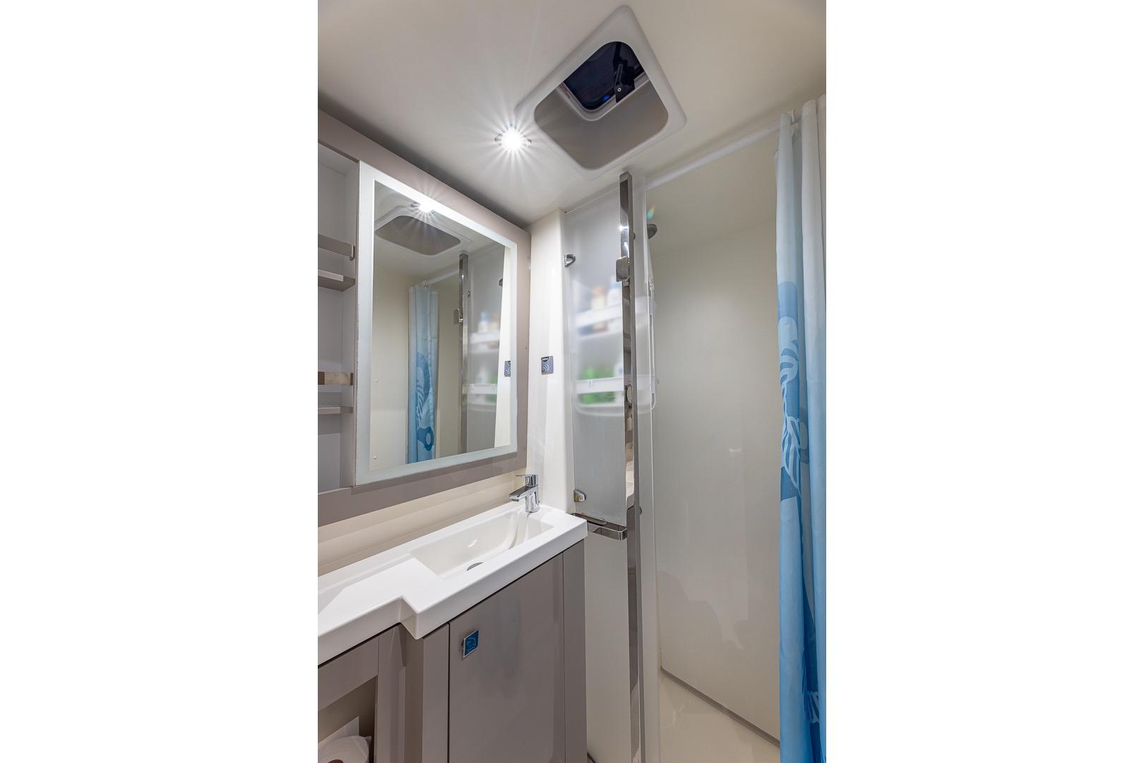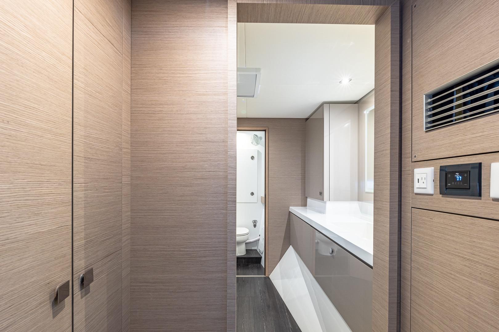 Owner stateroom takes entire port hull with blackout curtains, custom cabinetry, walk-in shower, and upgraded Casper Memory mattress