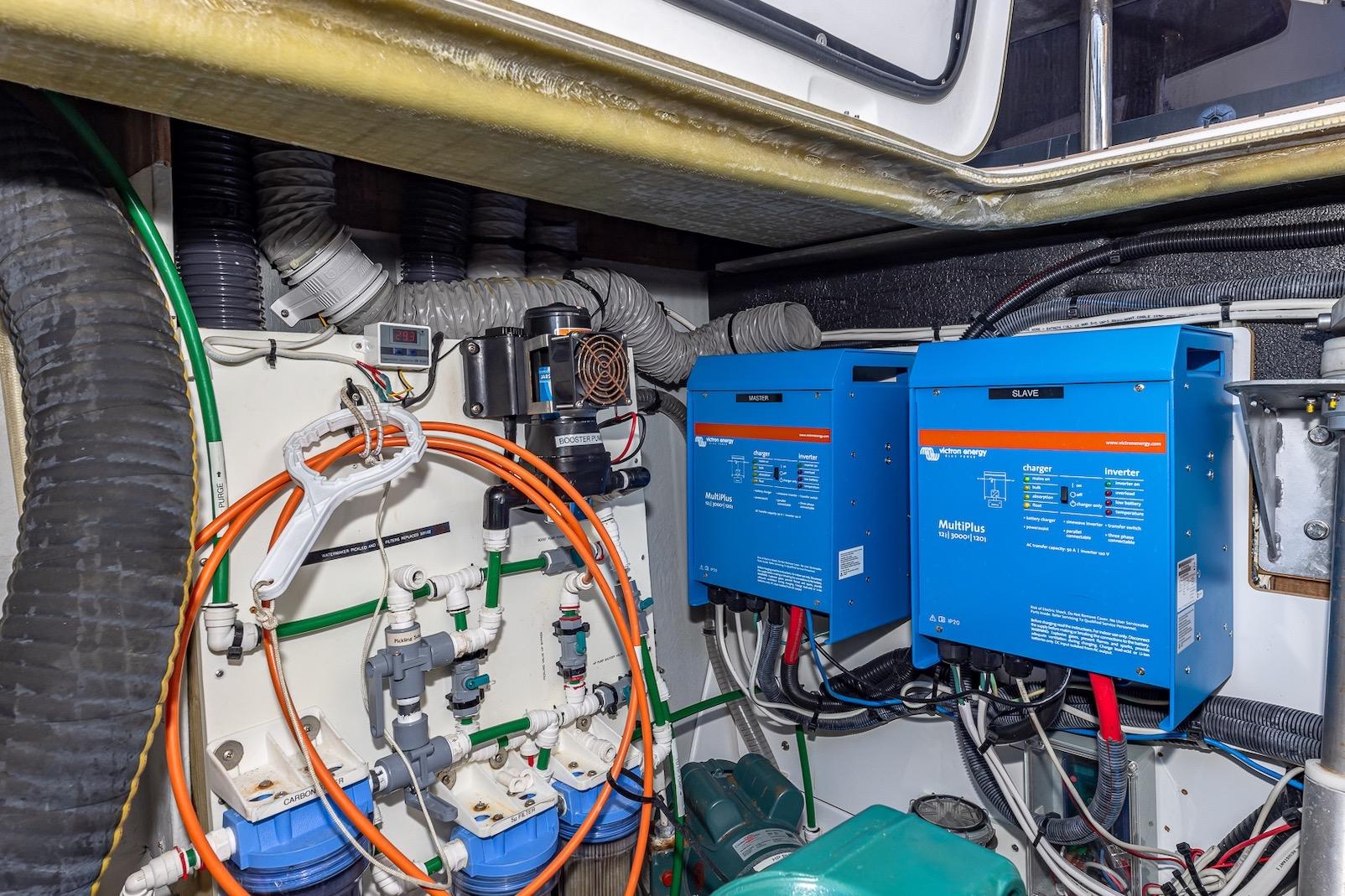 Extensive backup and replacement parts including 2x engine exhaust elbows, chartplotter, auto pilot EDU, oil & fuel filters, watermaker filters, wind instruments, water pumps, cabin fans, inline exhaust fans, steering chain, and much more