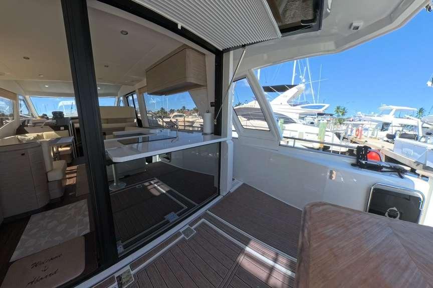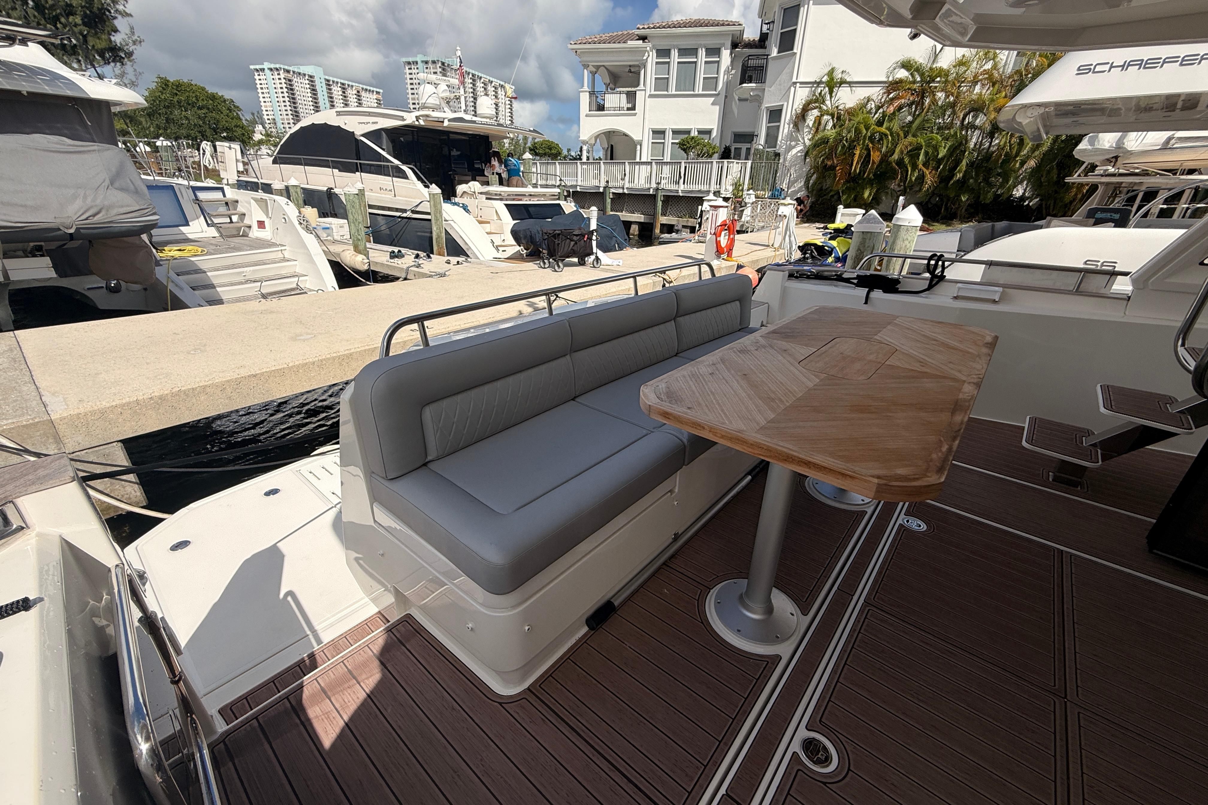 - Flybridge: Features a second helm station, a U-shaped lounge, a comfortable navigation seat, and a foldable natural teak table with cup holders. An additional galley with a refrigerator, electric grill, and sink is also on the flybridge.