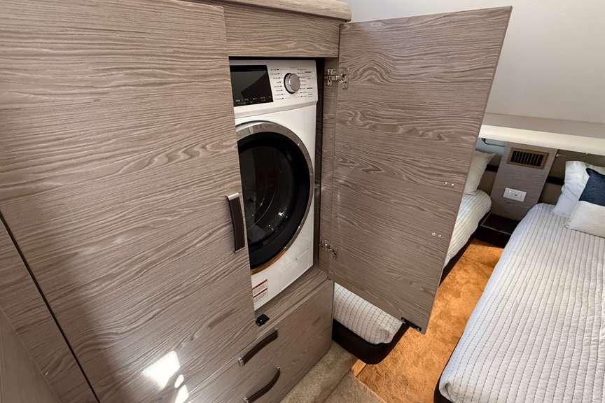 - Appliances: The galley is fully equipped with an electric oven/microwave, a 224 L refrigerator with a separate freezer, and two electric cookers. The boat also has a 7 kg washing/drying machine and an ice maker on the flybridge.