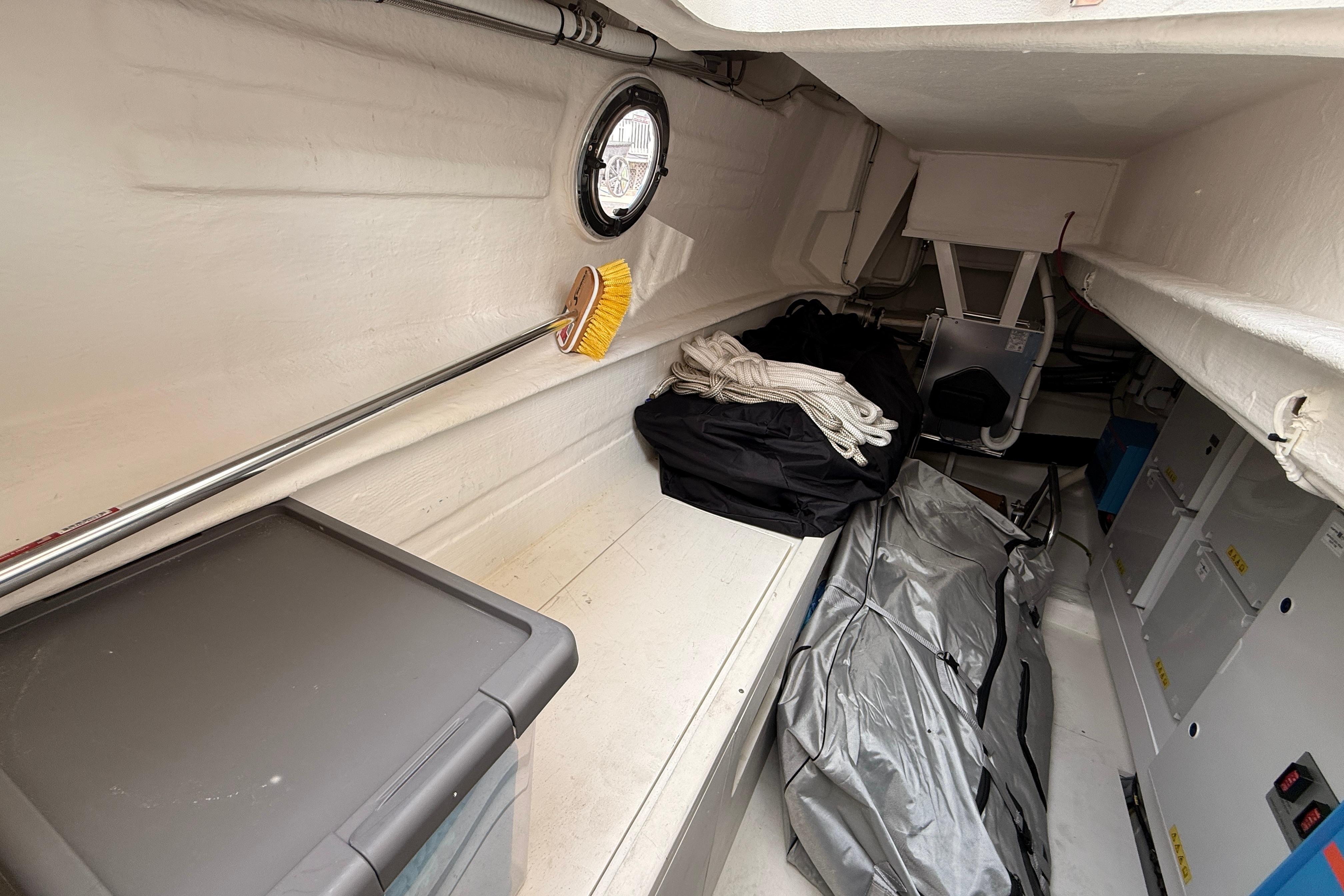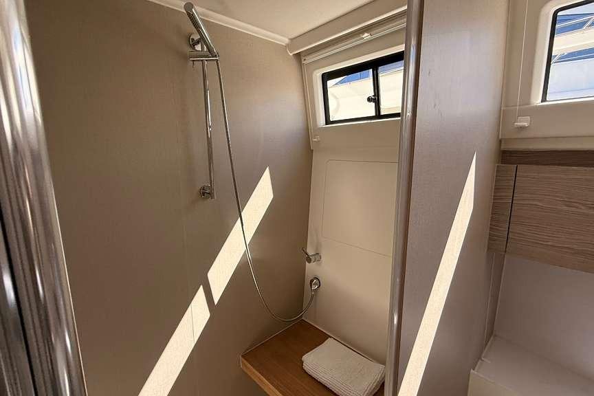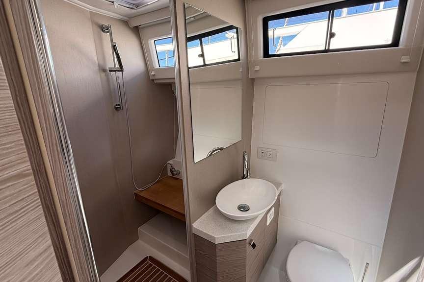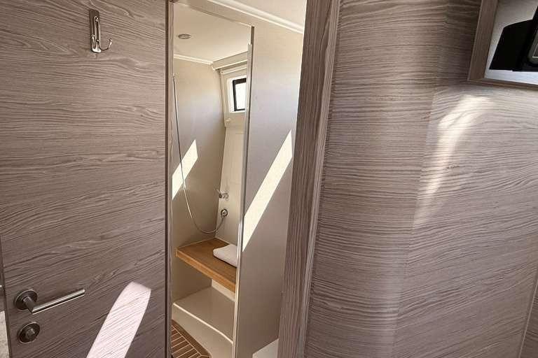 - Water Systems: A 56 L/h watermaker is installed for producing fresh water. The boat has a total of 660 L in fresh water tanks, along with a chain and anchor wash-down system and a stern shower.