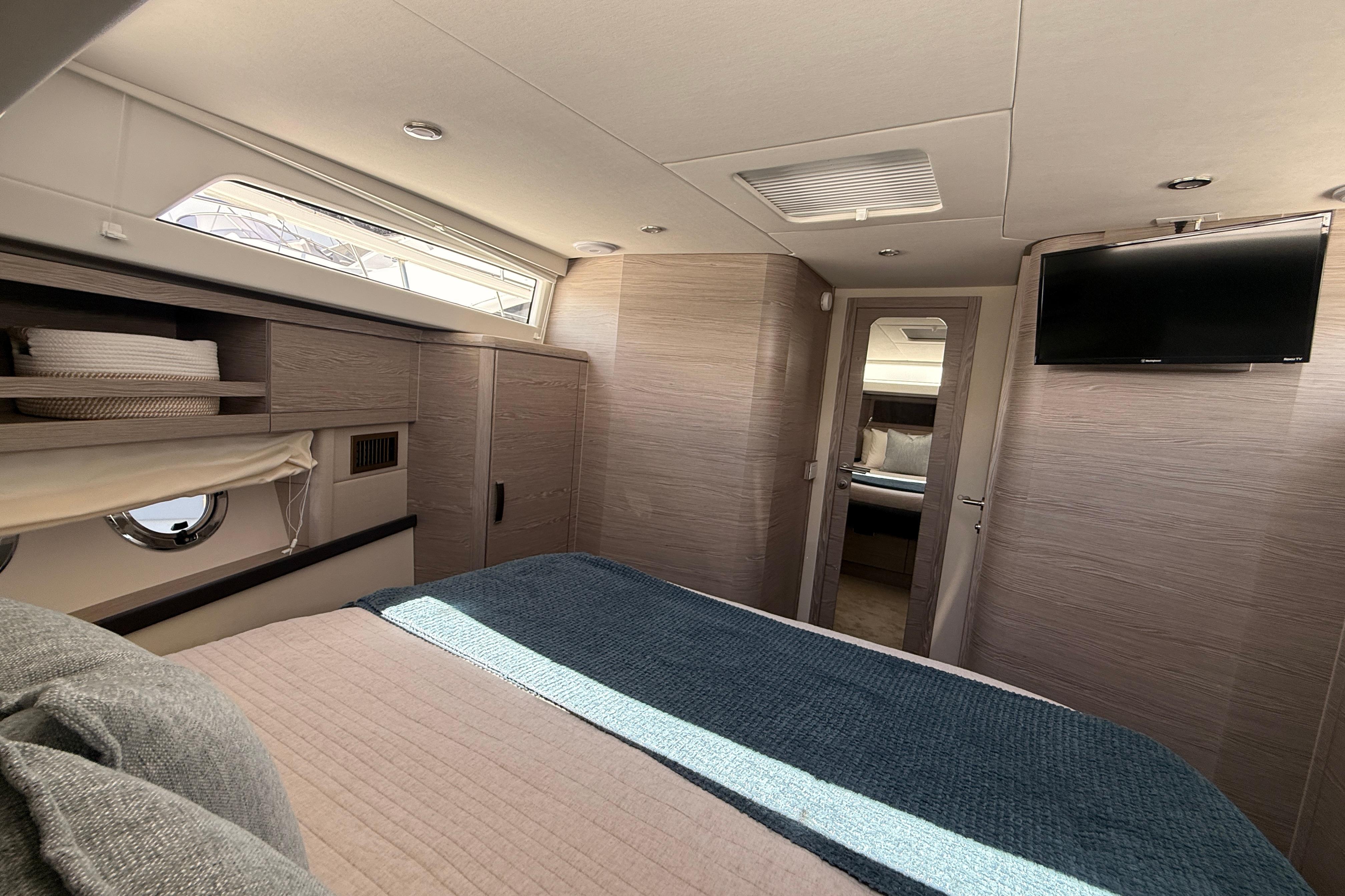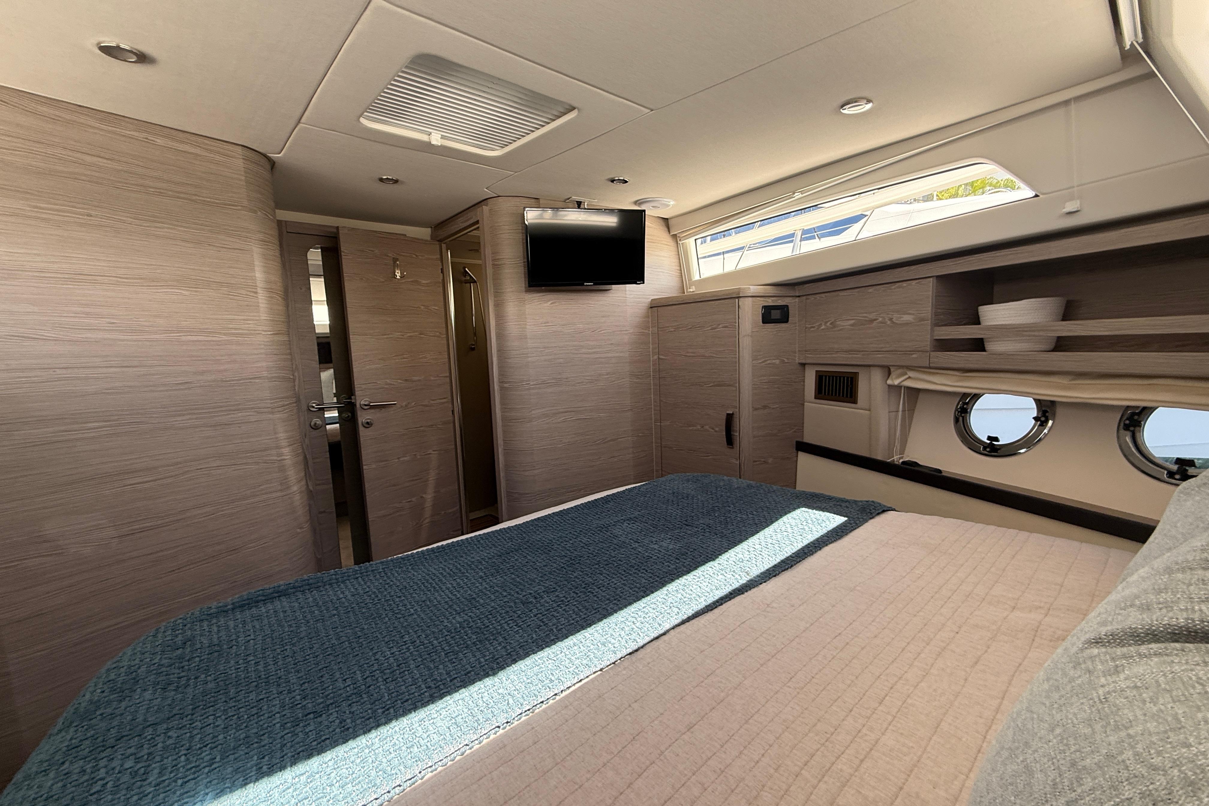 - Communication & Monitoring: A Simrad RS100-B VHF with integrated AIS and a flybridge handset is standard. The boat also features a four-camera monitoring system for the bow, stern, and engine room.