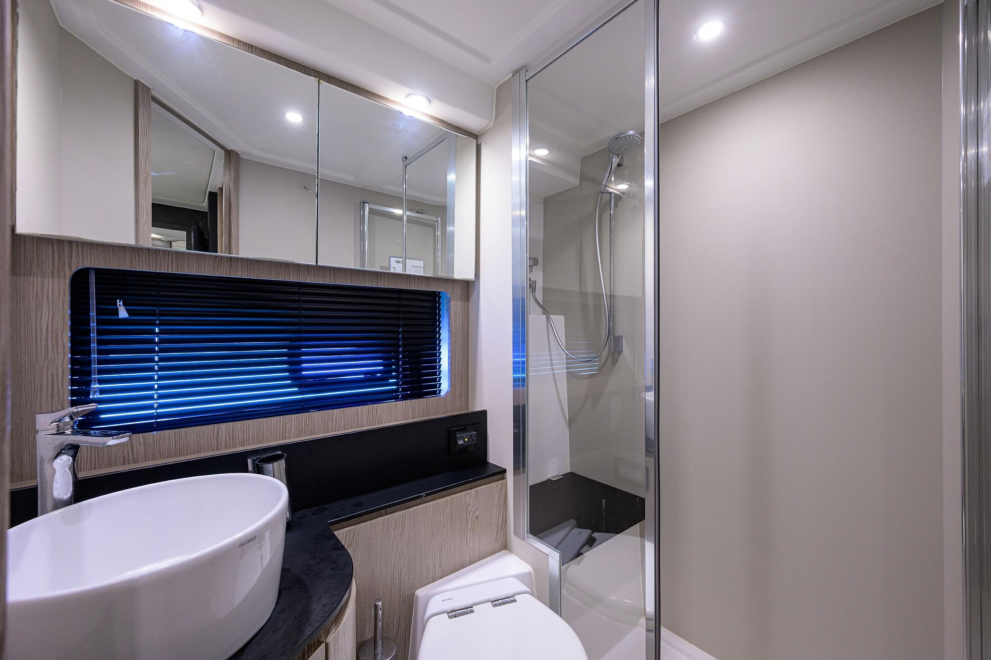 - Separate shower stall in tempered glass with seat and storage unit