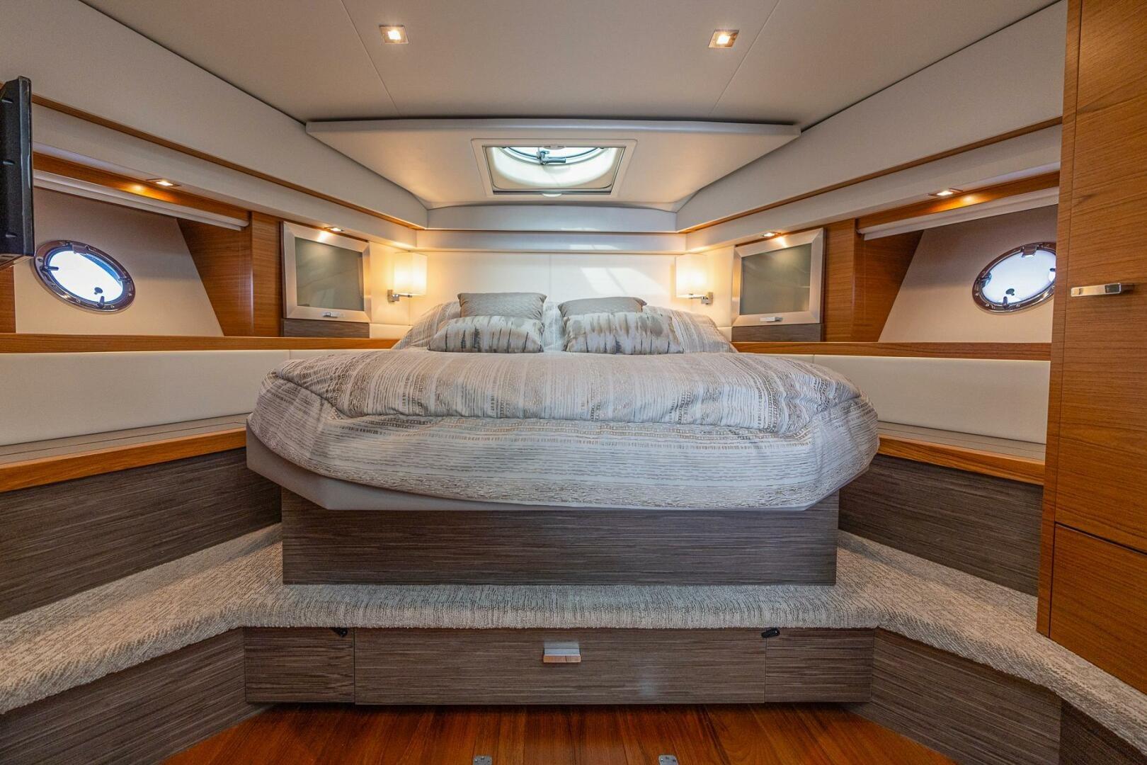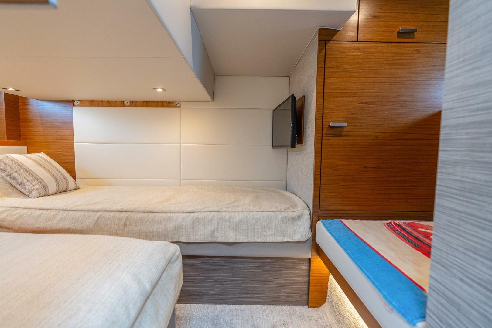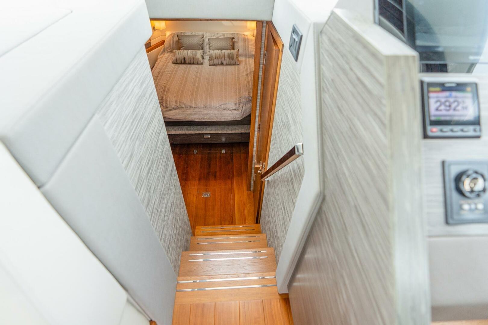 The flybridge is a true highlight – offering a commanding view at the helm with ample seating and a wet bar for hosting in style. The cockpit flows seamlessly into the salon with a sliding glass door, creating an indoor-outdoor social space ideal for sunset cruises or weekend getaways.