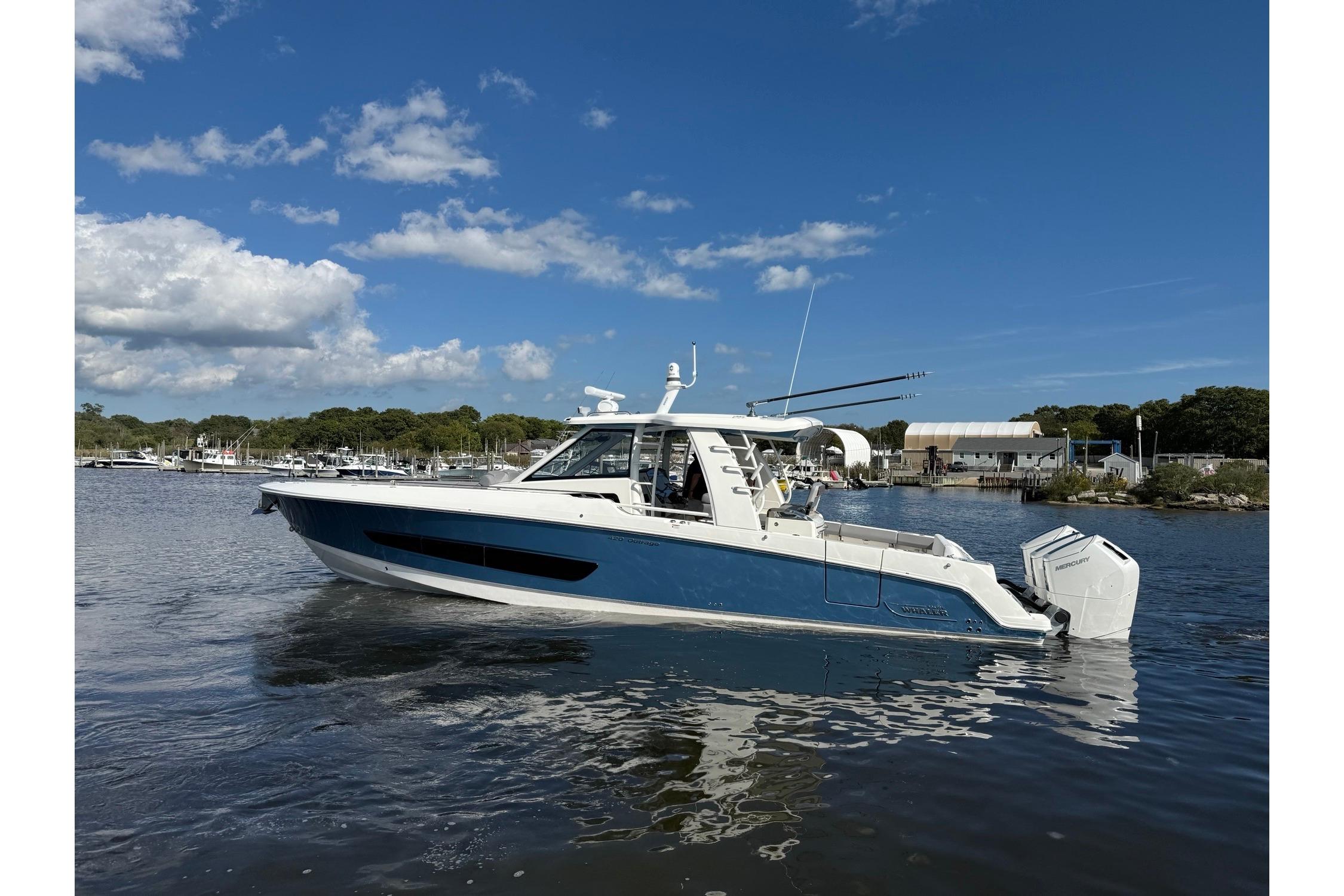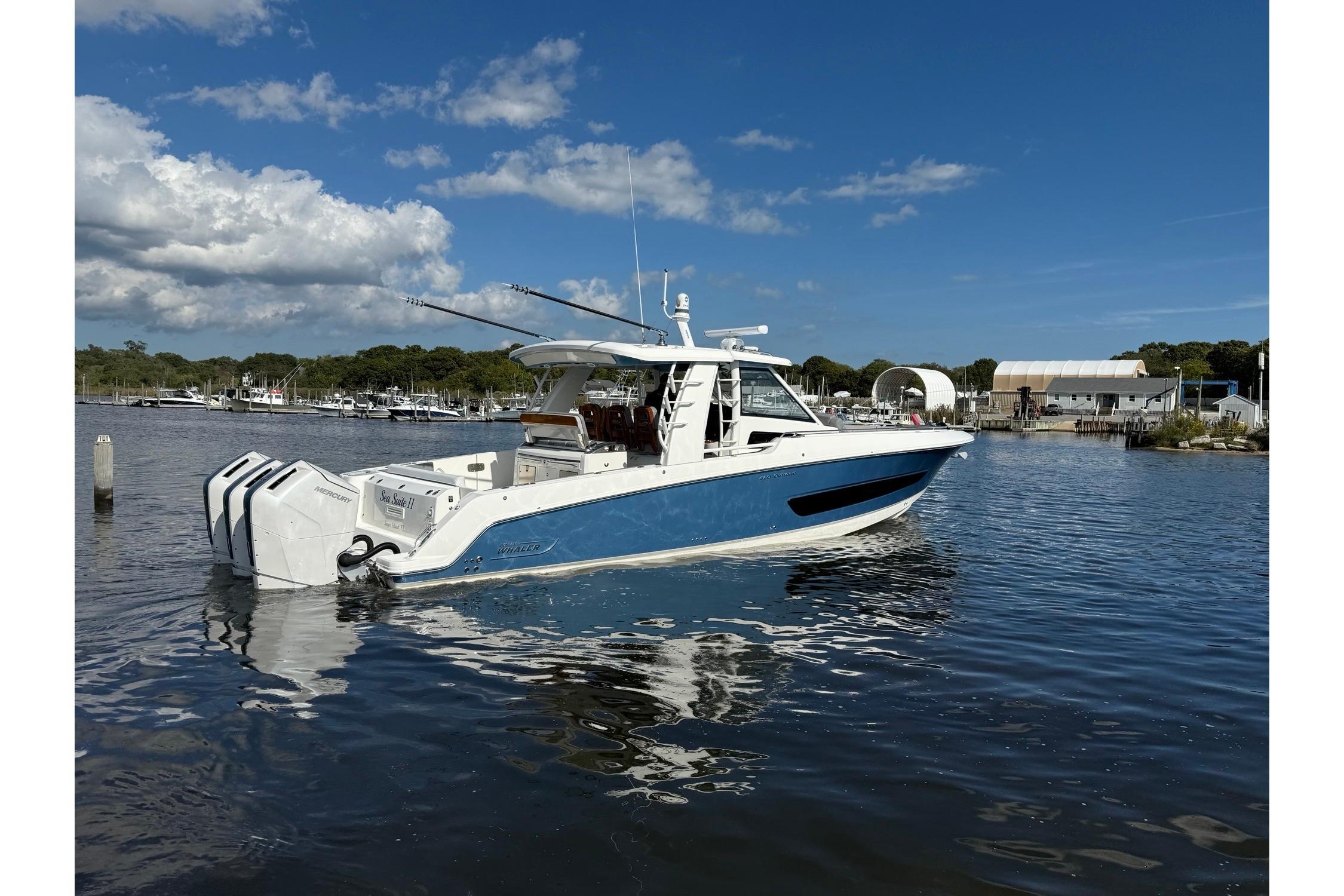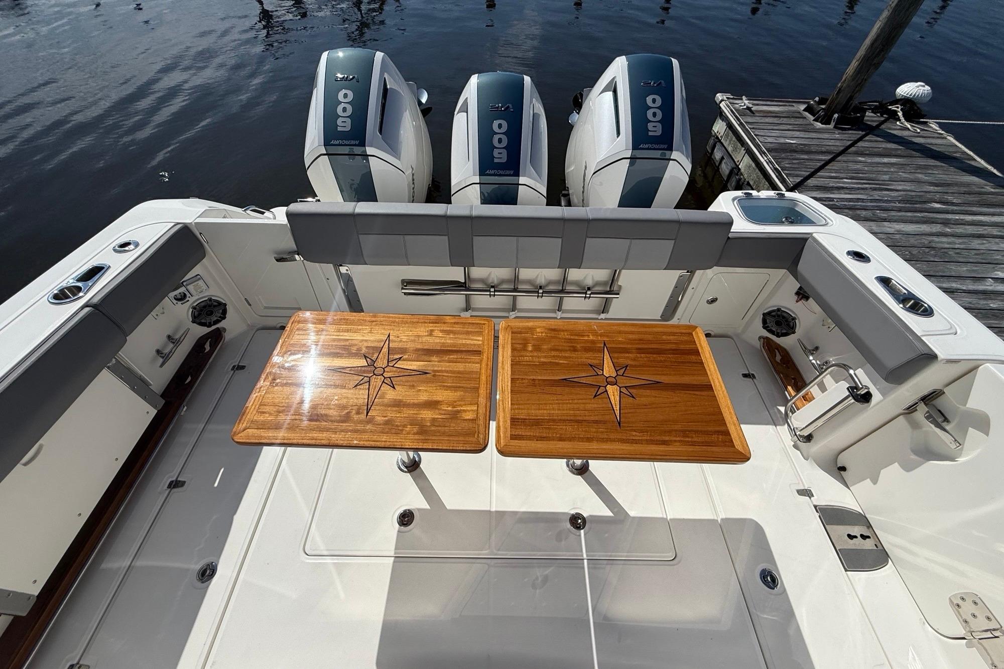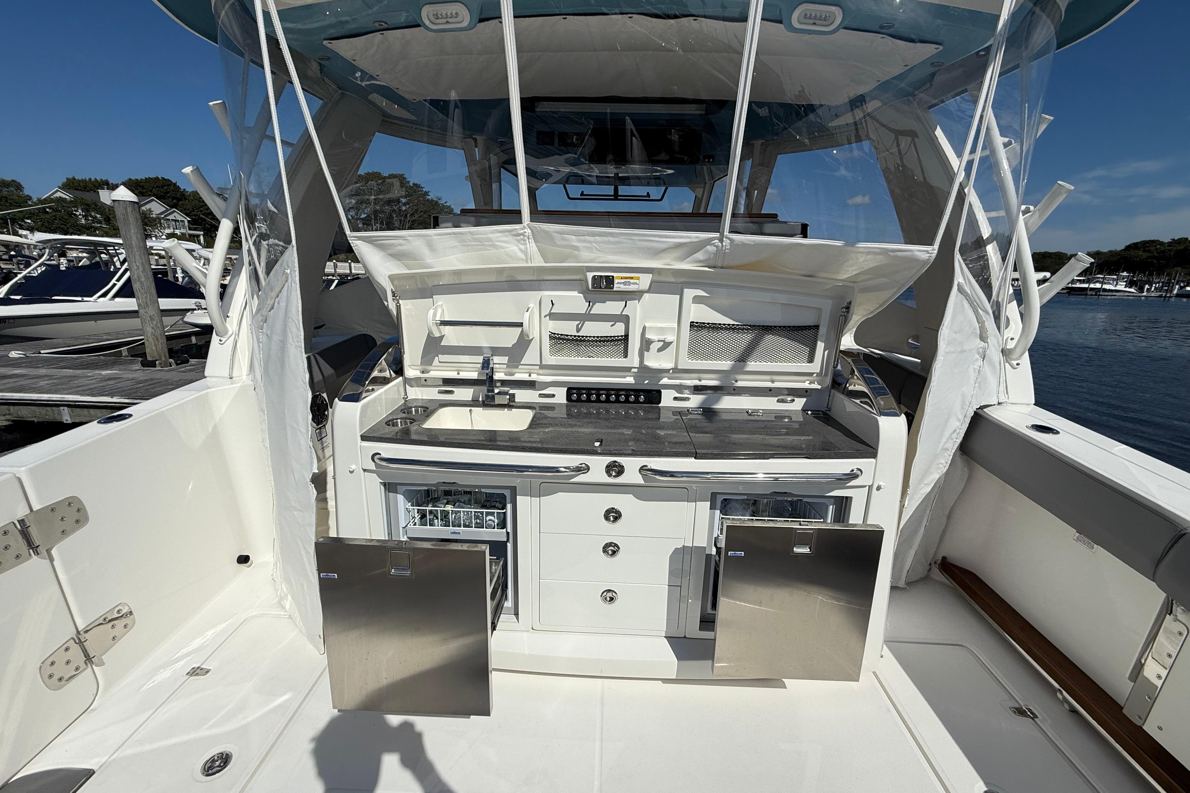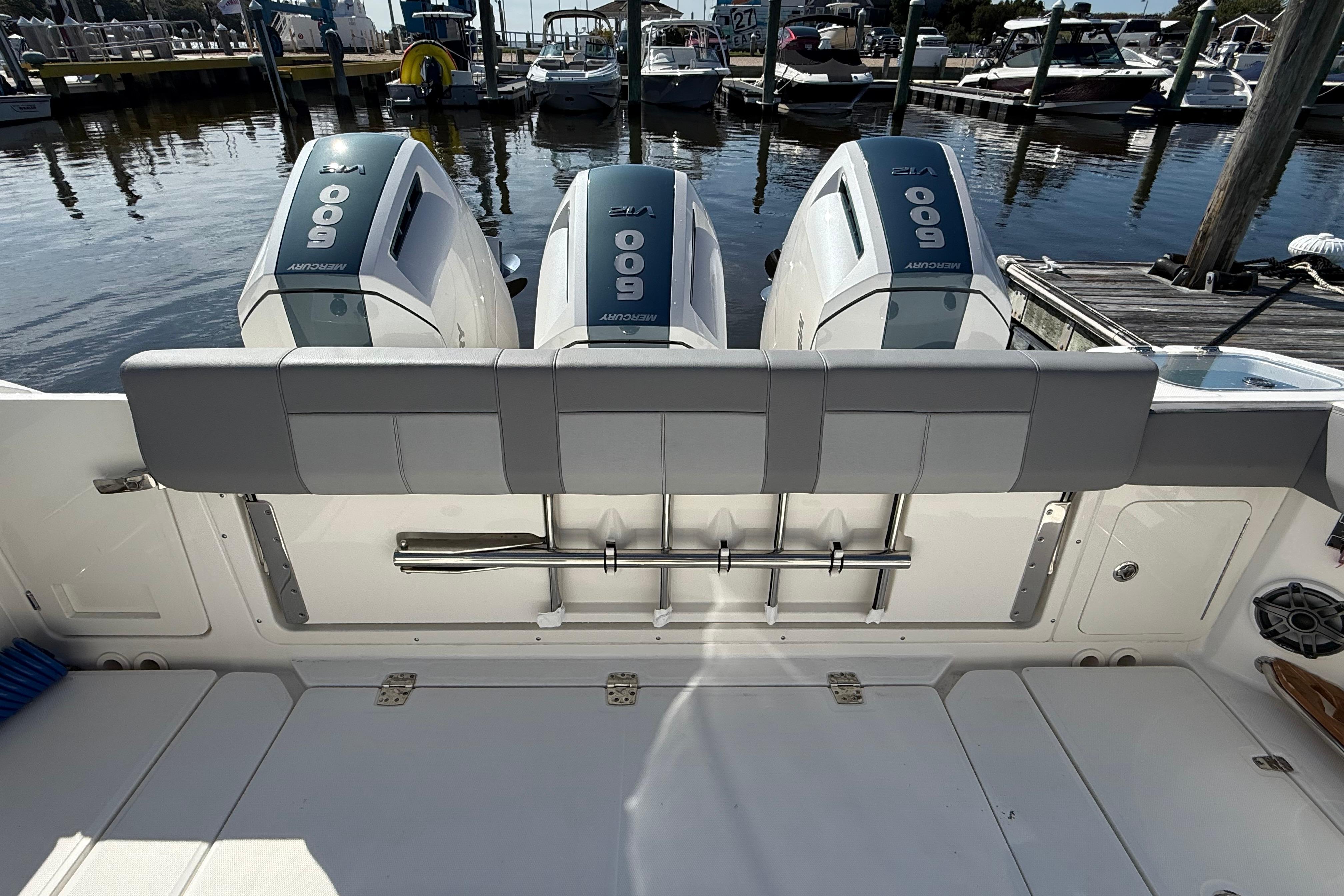 FEATURES: SK6 Seakeeper Gyroscopic stabilizer, Diesel generator (Domestic), Abaco blue hull, Chrome graphics, TRANSOM-Blue LED underwater lighting, electric trim tabs w/ indicator, boarding ladder, (5) rod holders, pull-out hot & cold shower, acrylic transom door, 12v dc receptacle (Elec. Reels + downriggers), AFT COCKPIT- SS fender holders, full coaming bolsters, Sea grey exterior upholstery package, SS toe rails w/ high gloss Teak shelves, fold away stern bench seat, aft port corner livewell, port side molded fiberglass boarding / dive door, stbd side cockpit fold out bench seat, aft bilge storage, port & stbd insulated in-floor storage/fishboxes w/ pumpout & chiller system, (2) cockpit tables, Summer Kitchen Leaning post- 120V outlet, cutting board, center drawer storage, (2) drink holders, electric grill, freshwater hot/cold sink, 12V outlet, SS grab rail, port & stbd refrigerators w/ SS drawer, solid surface countertop, storage lid w/ tool holders, storage nets & leader holders, and leaning post cushion on fwd side of prep station that converts to 3-person bench seat w/ high gloss Teak back, mid-ship raw water washdown, HARDTOP- White powder coated frame, Abaco Blue underside, integrated ladder access to hardtop portside, deluxe radial outriggers, (6) rod holders, full tempered glass windshield & side glass, sunroof, lockable electronics box, UPPER COCKPIT- helm & companion bolster style seats (3) with fold-down armrests (center seat is electrically actuated) (port & stbd seats rotate to face aft), High loss helm seat backs & armrests, port side passenger fold-down footrest, footrest molded into console w/ Teak covers, fold-down standing platform, Cast SS steering wheel w/ knob & tilt helm, Compass, windshield defogger w/ remote shutoff control, 18,000 BTU aicr conditioning reverse cycle, (2) A/C vents, High Gloss Teak at helm, lockable glove box w/ 12V receptacles & USB charging port, lockable acrylic sliding entry door, CABIN- hardwood cabin sole, 12,000 BTU air conditioning, skylight w/ integrated shade system, central vacuum system, console side windows w/ (2) opening port lights w/ shades, Natural tones interior package, convertible double berth w/ filler cushion, wood table that lowers to support filler cushion, convertible pull-out settee, 120V receptacle port side, 12V USB charging ports, 28” flatscreen HDTV, GALLEY- dedicated dish storage in pull-out drawer & cabinet above sink, microwave, SS hand rail, refrigerator / freezer, sink w/ faucet & solid surface countertop, HEAD- electric vacuflush toilet w/ ob discharge & dockside pumpout, enclosed shower, vanity w/ sink & storage, mirror, BOW- forward console lounge w/ fold-down armrests (4) drink holders, backrests & removable cushion, bow table w/ filler, forward port & stbd seats w/ folding backrest, & (4) drink holders w/ stereo remote & 12V receptacle on port side, freshwater anchor washdown, anchor windlass w/ 400’ rode & chain, SS anchor, (18) lines, (9) life jackets, (3) fenders, (2) Marine power cords, (2) fire extinguishers, & signal horn