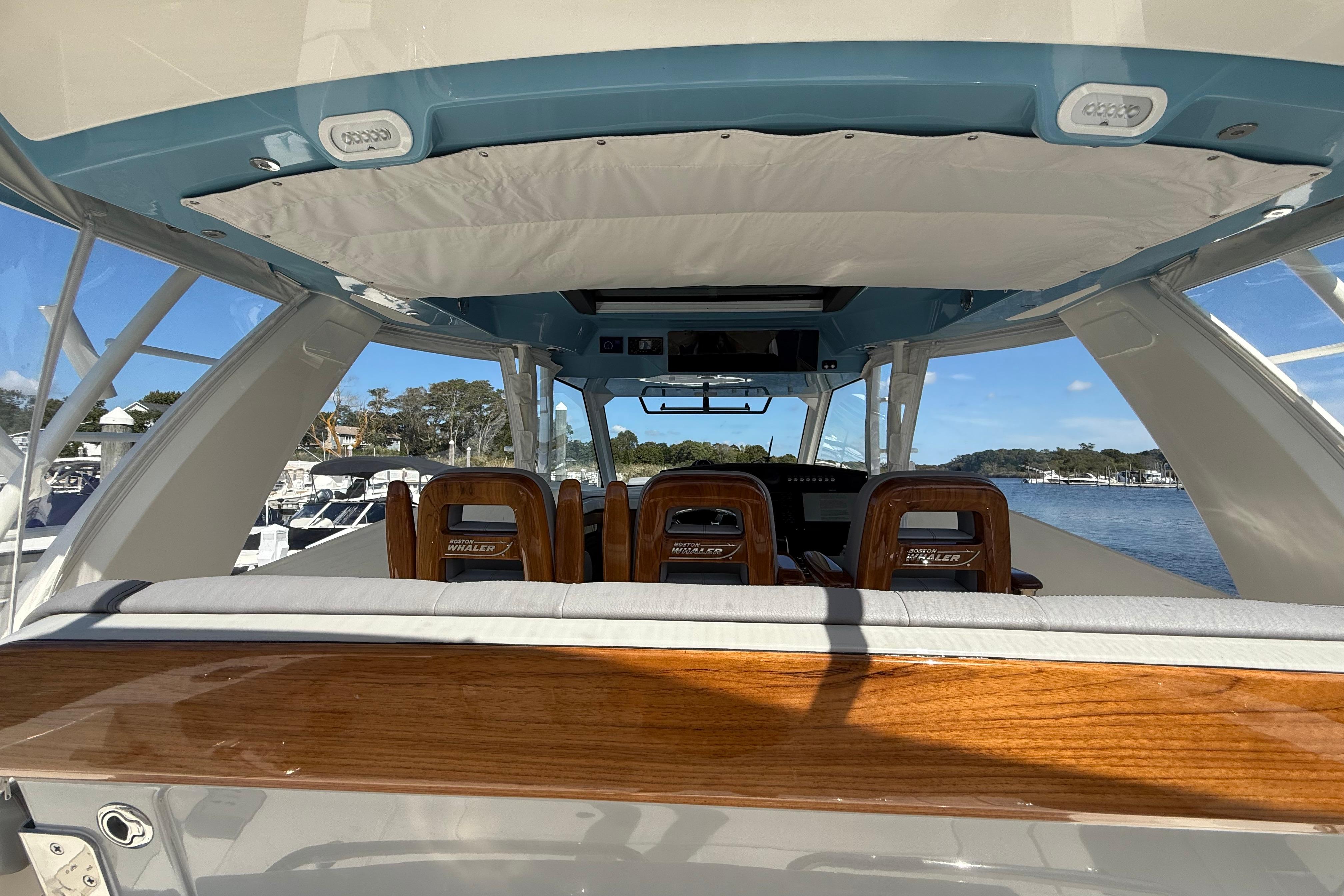 - Sunshade for cockpit – telescoping polished stainless steel frame retracts and deploys electrically (black Sunbrella canvas)