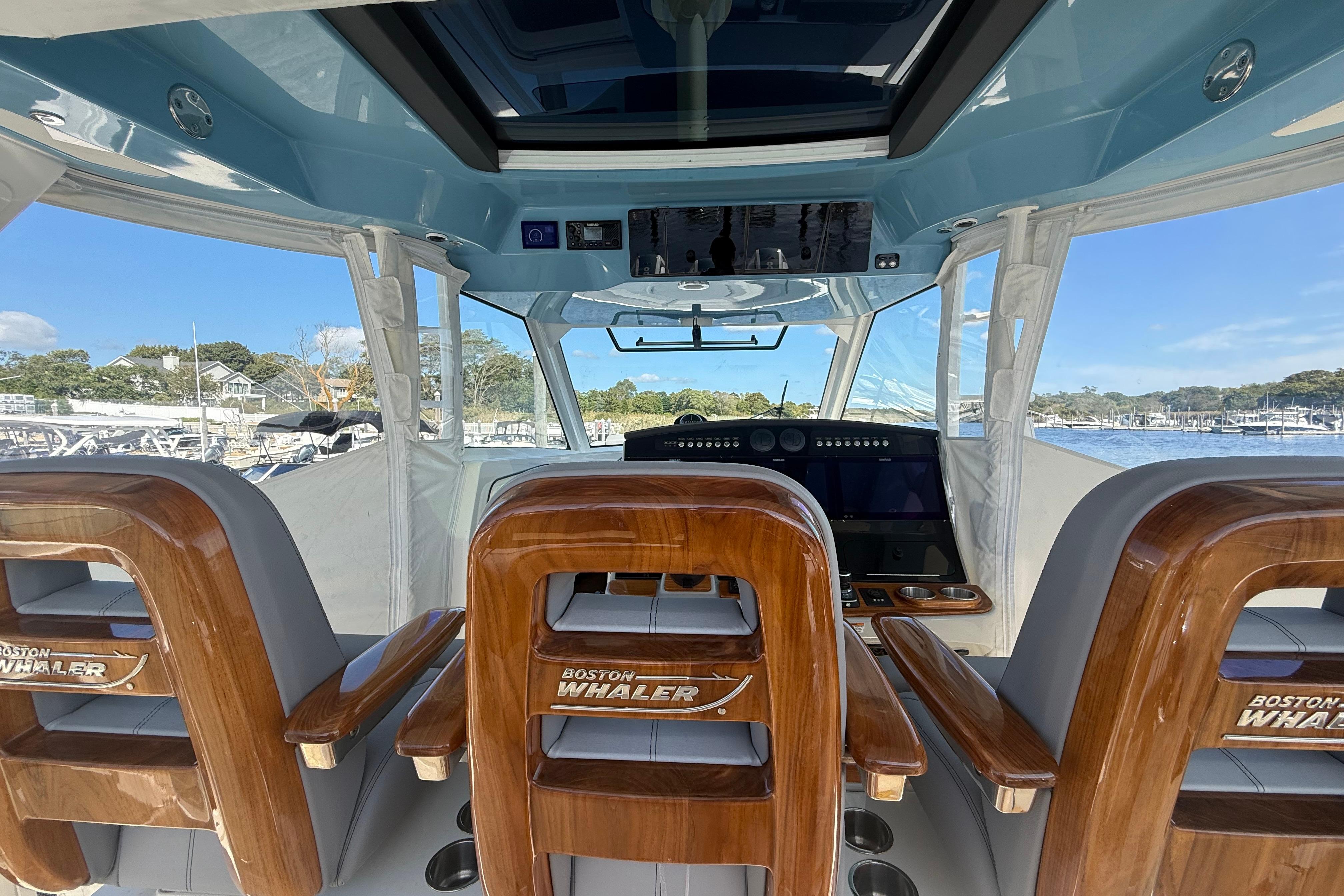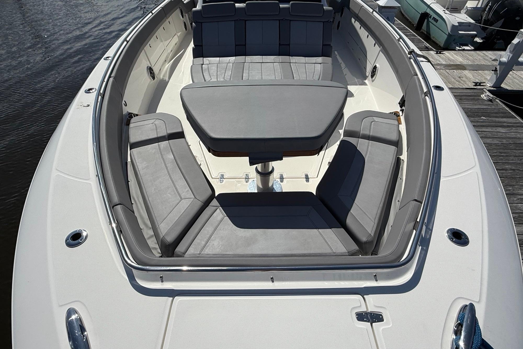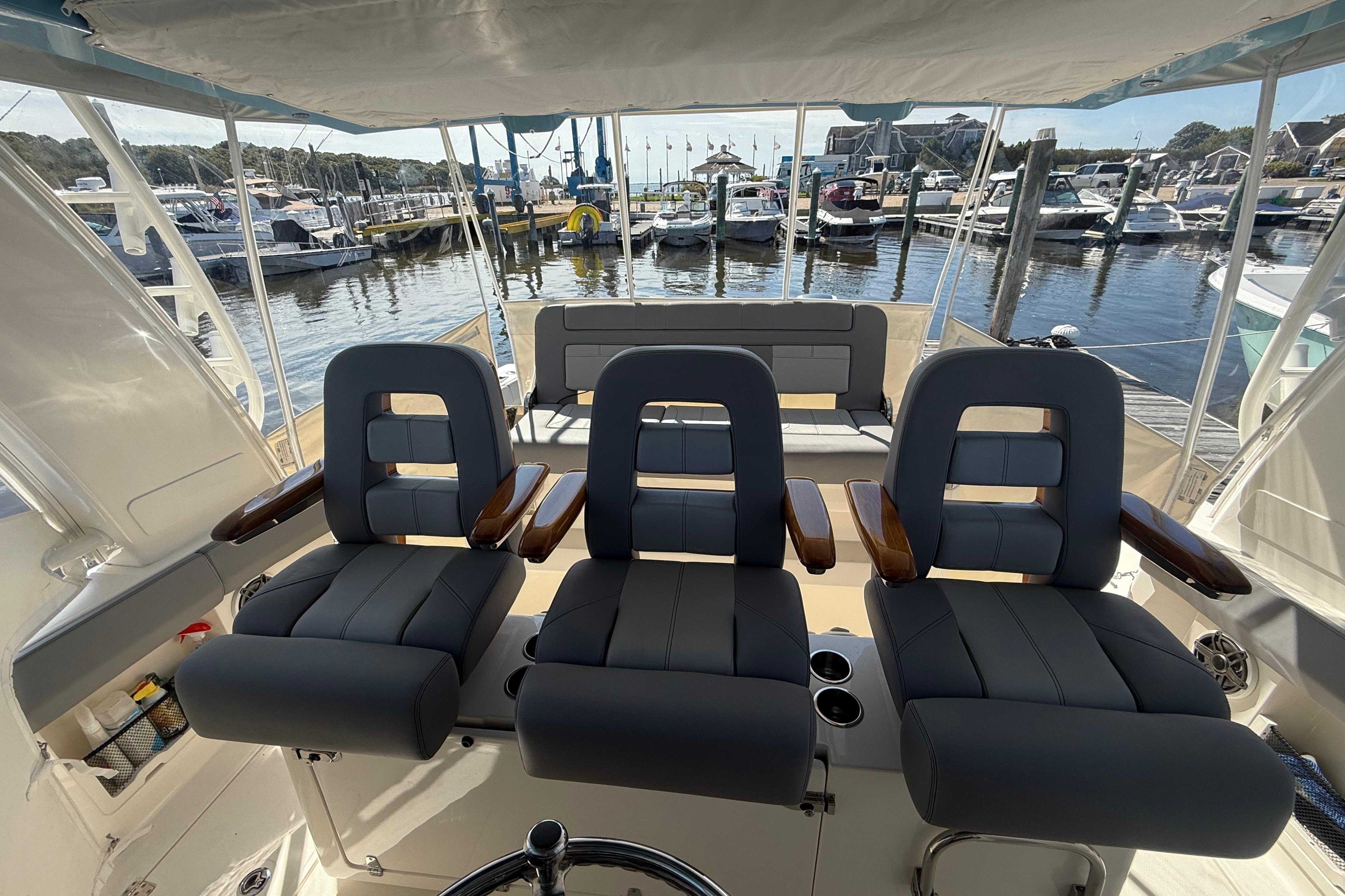 - Helm and companion bolster style seats (3) with fold-down armrests (center seat is electrically actuated) (port and starboard seats rotate to face aft)