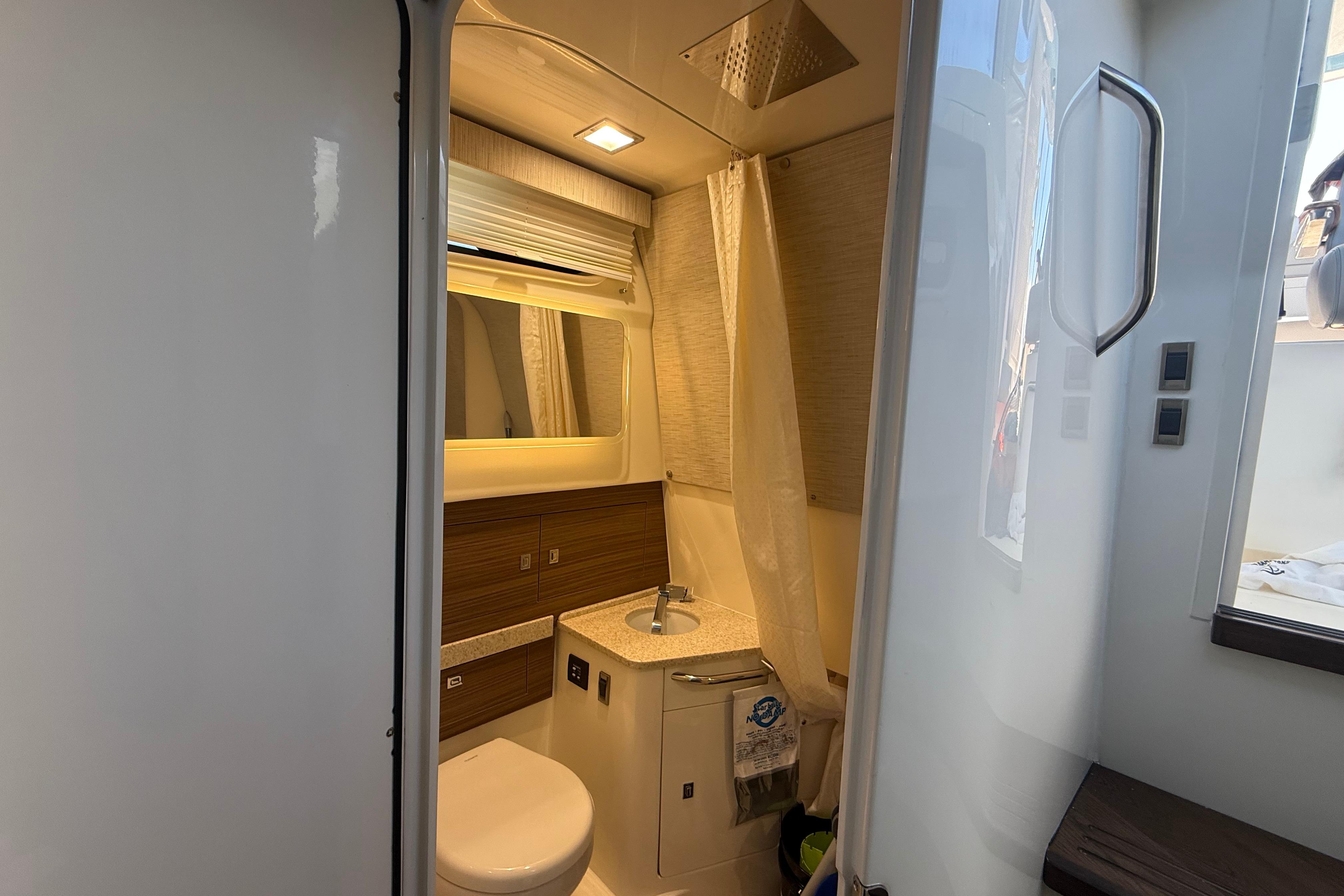 - Electric Vacu-Flush® toilet, holding tank with vent filter, overboard discharge, dockside pump-out and tank level indicator