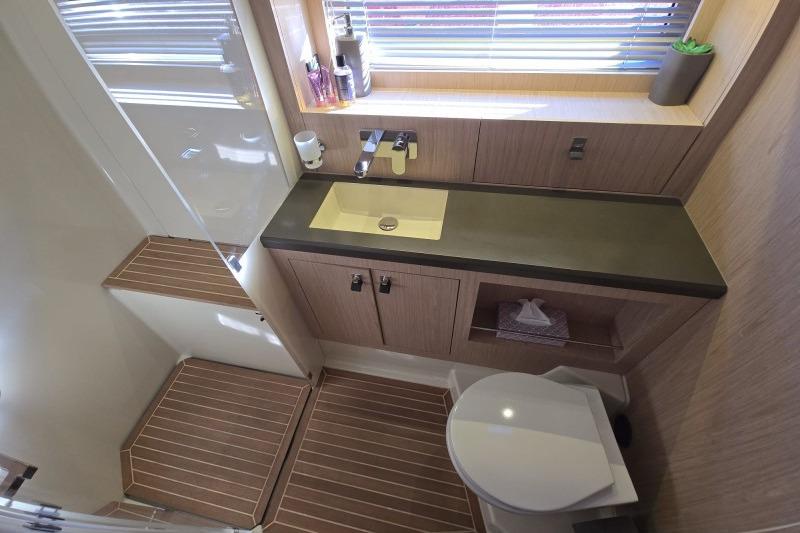 Le cockpit immense et la plateforme arrière de 5 m² invitent à la convivialité, tandis que l’intérieur signé Andreani Design offre lumière, volumes généreux et finitions haut de gamme. Garage à annexe, aménagements sécurisants et confort raffiné en font un yacht marin et rassurant.