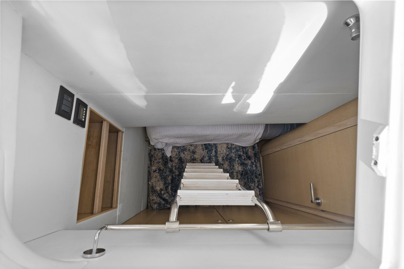 Below deck, the master suite spans the yacht’s full beam, flooded with natural light from large hull-side windows. The VIP stateroom forward features an island queen bed and ensuite bath, while the guest stateroom amidships offers comfortable twin accommodations. A dedicated crew cabin with private head access further complements this vessel.