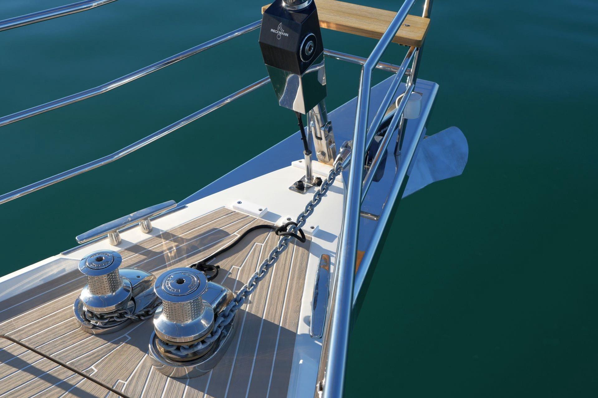 Large sail locker below foredeck with stowage space for fenders, mooring lines and sails with electric forced ventilation