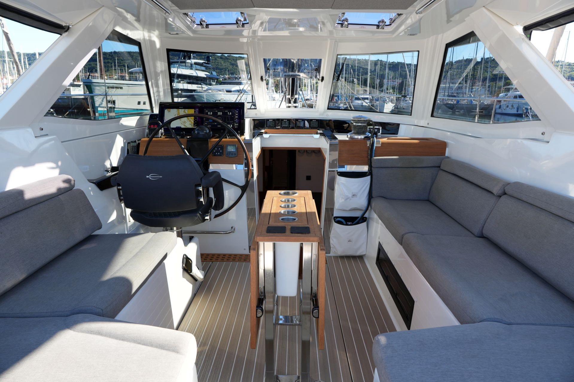 Deep, well-protected cockpit with helm station, carbon fibre steering wheel, large instrument console and pilot seat to port