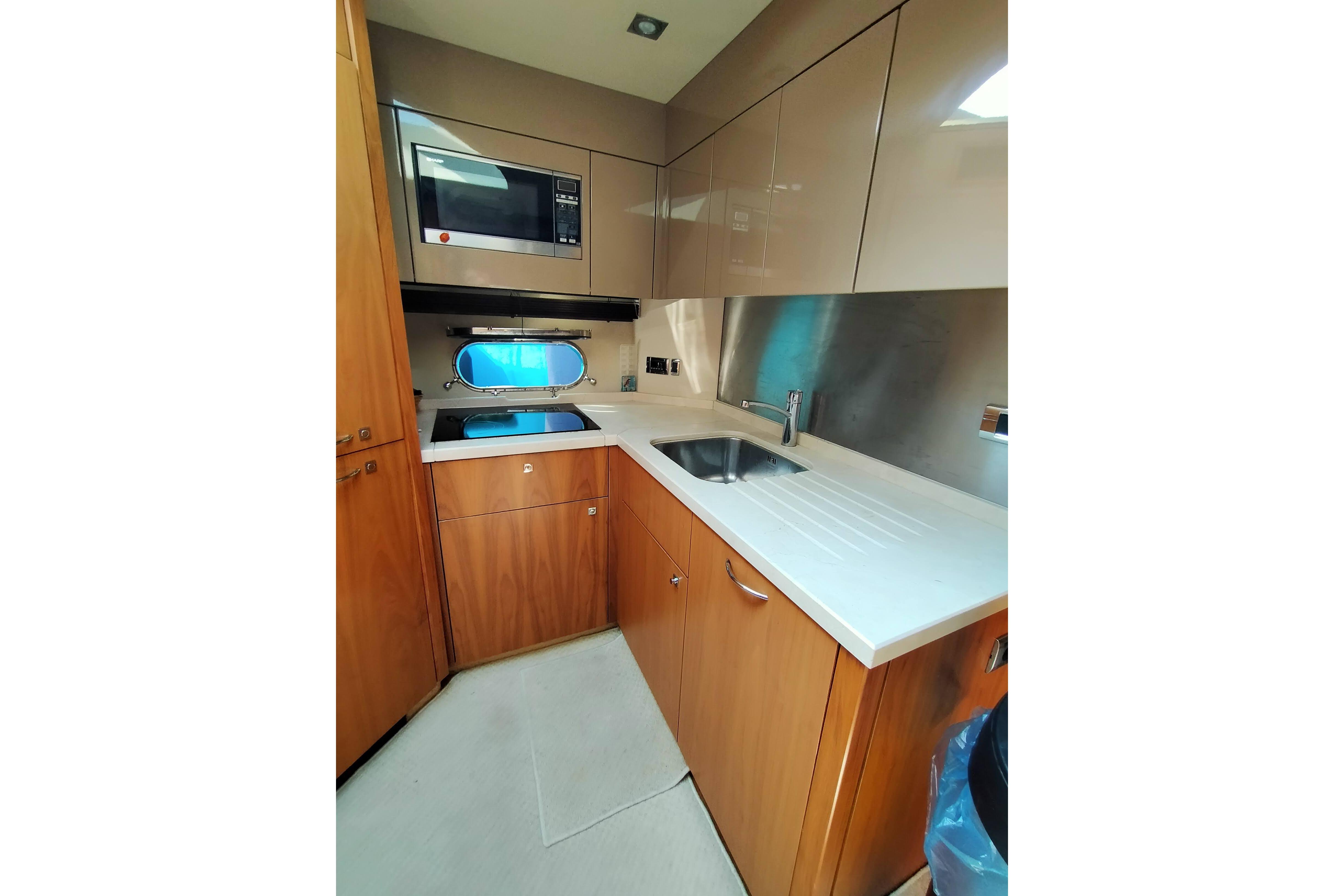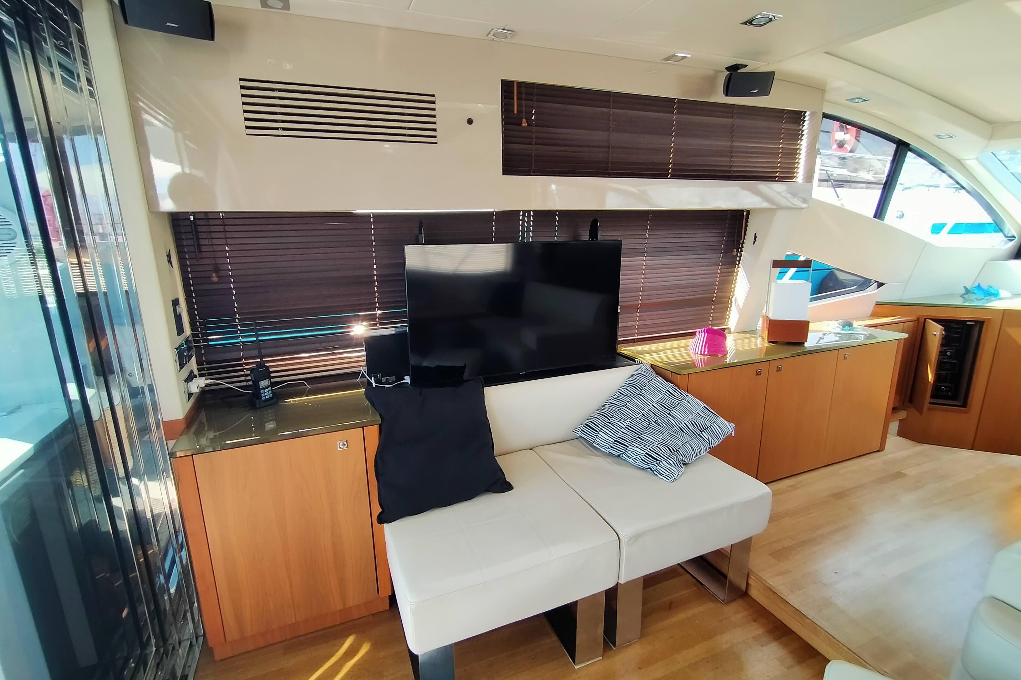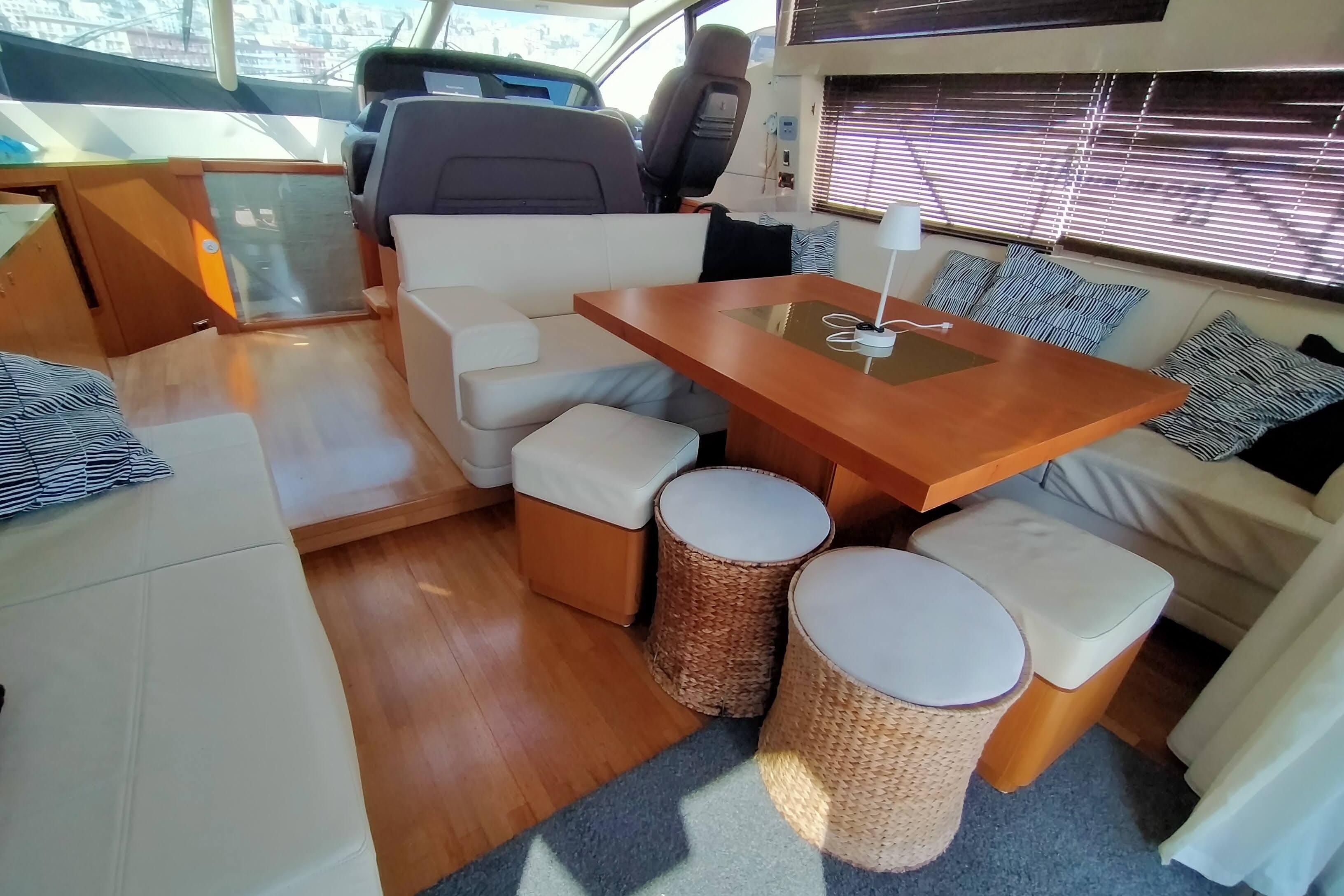 Gli interni raffinati includono una dinette spaziosa con divani in pelle color panna, mobile TV un hard top apribile e una zona guida sulla murata di dritta. Sotto coperta una cucina attrezzata e 3 cabine: una armatoriale a tutto baglio, una VIP di prua e una ospiti con letti incrociati, TV e impianto audio.