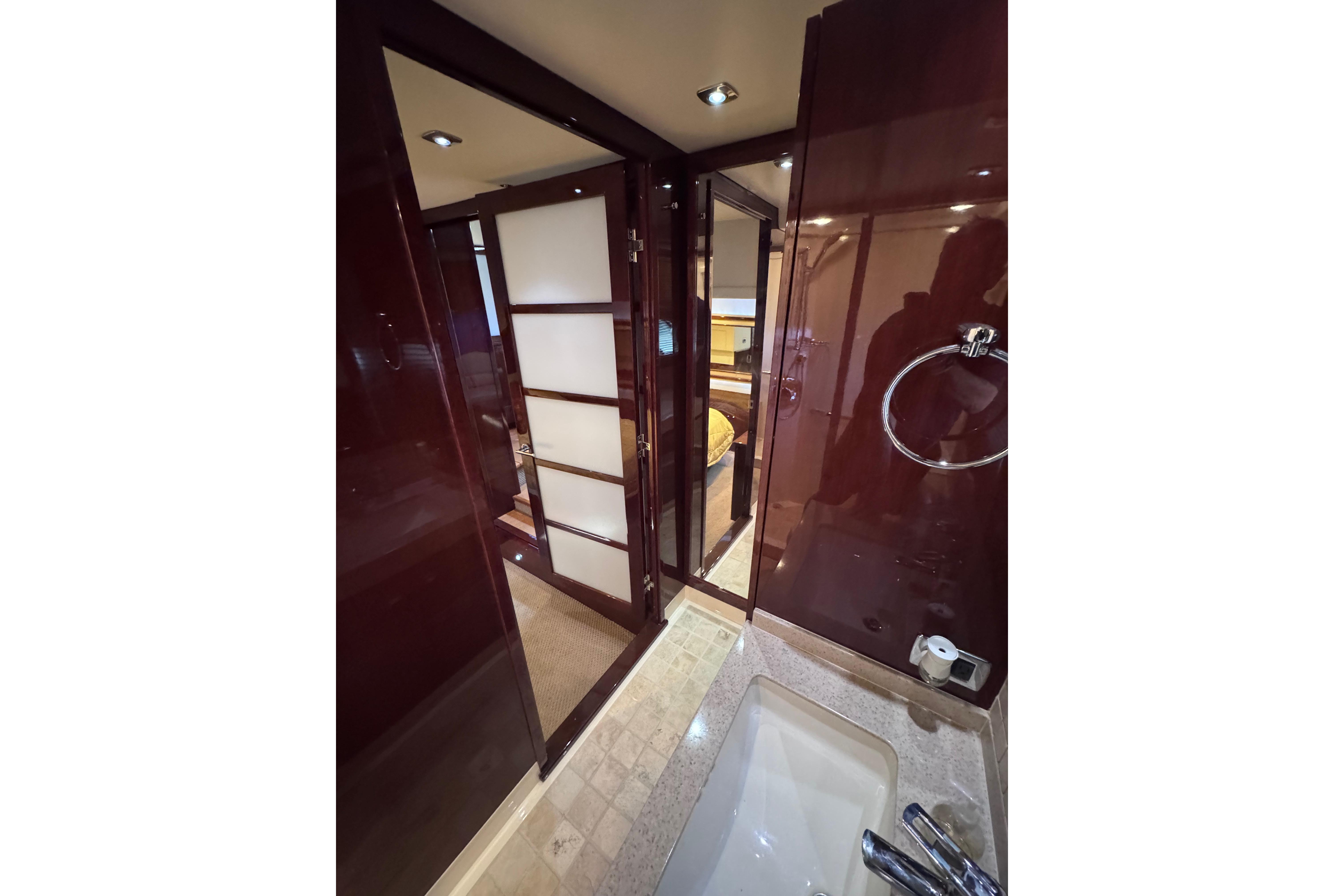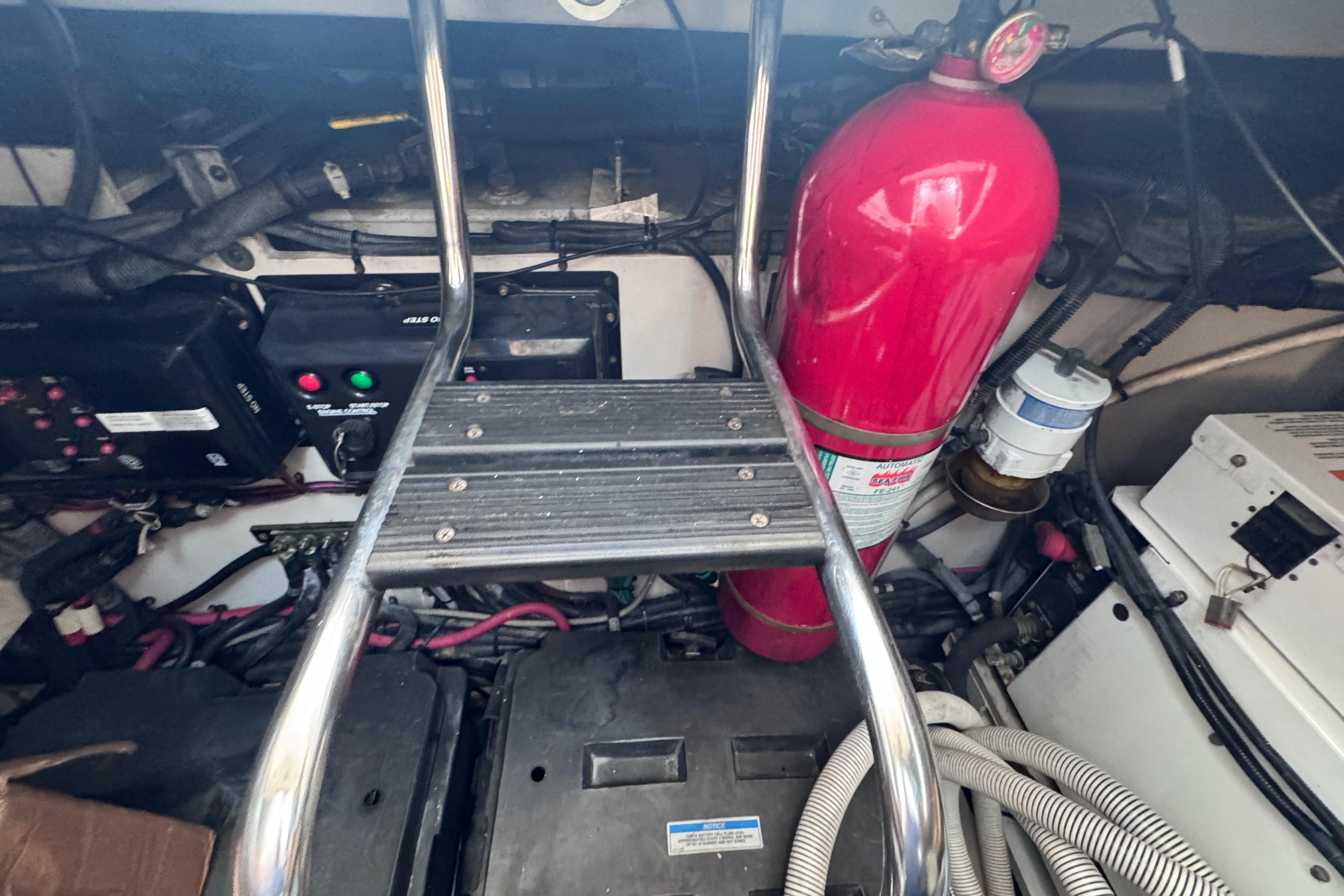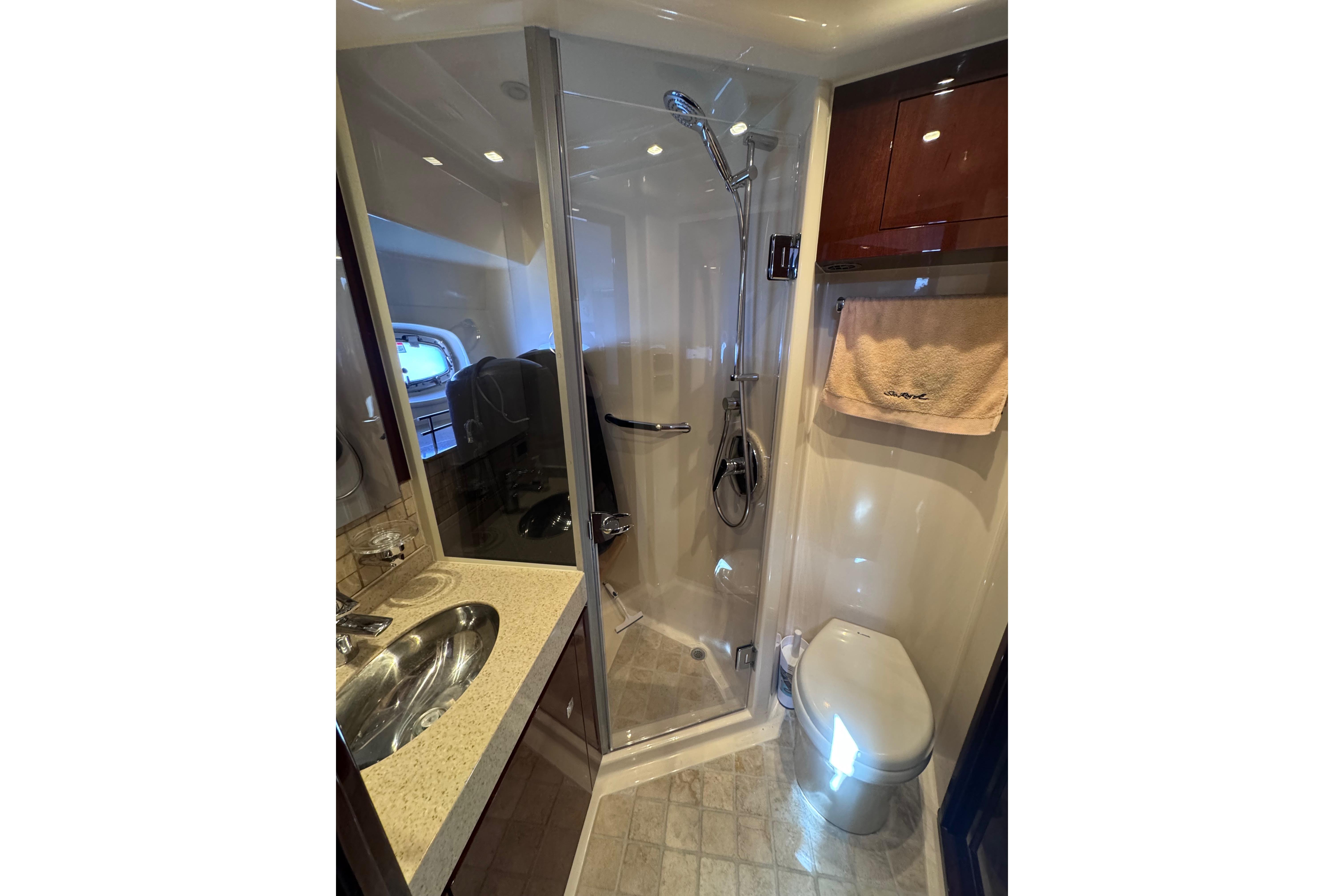 You enter the spacious cabin from the helm deck on the Port side through a sliding door. Safety being a top priority with wide steps and handrails.