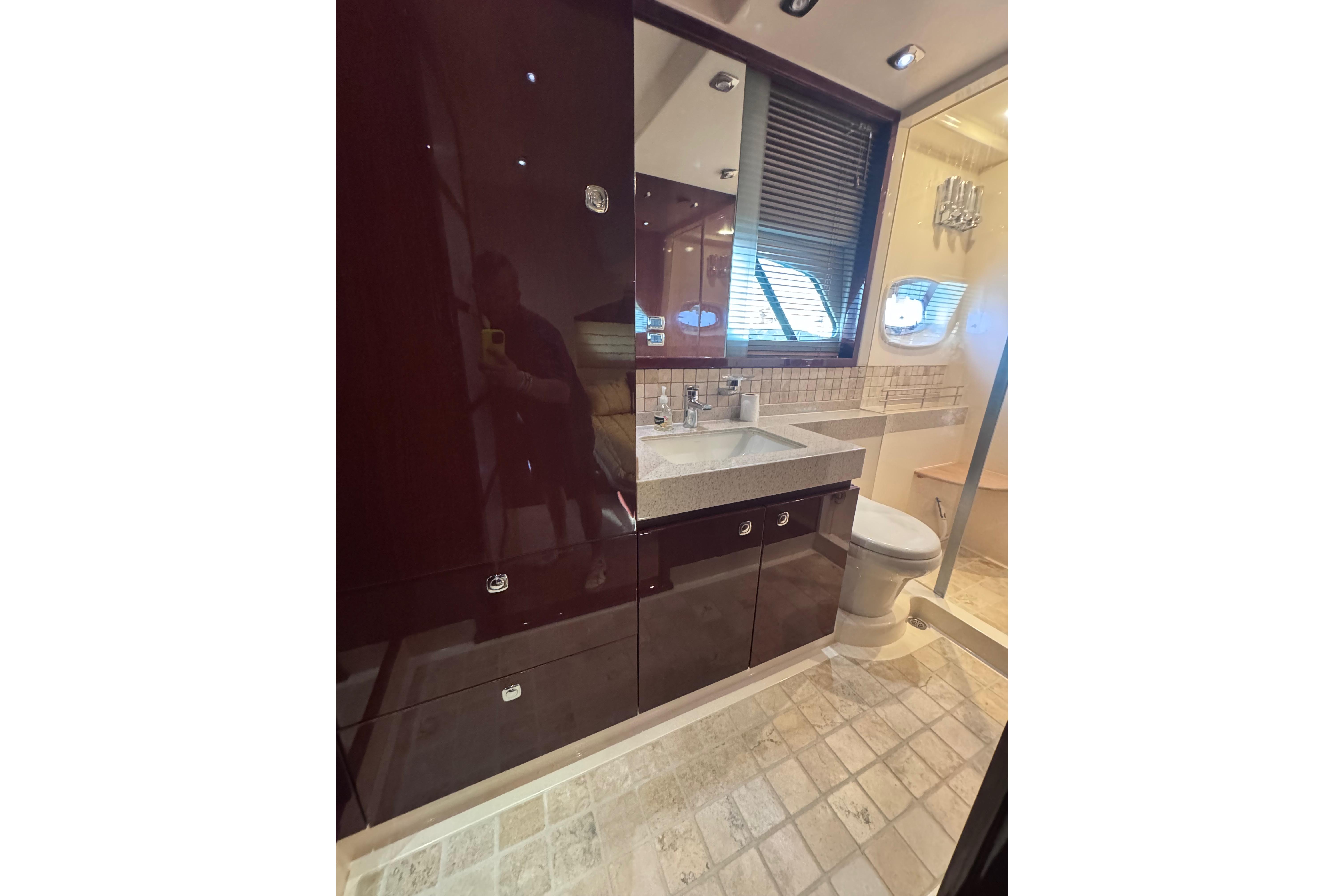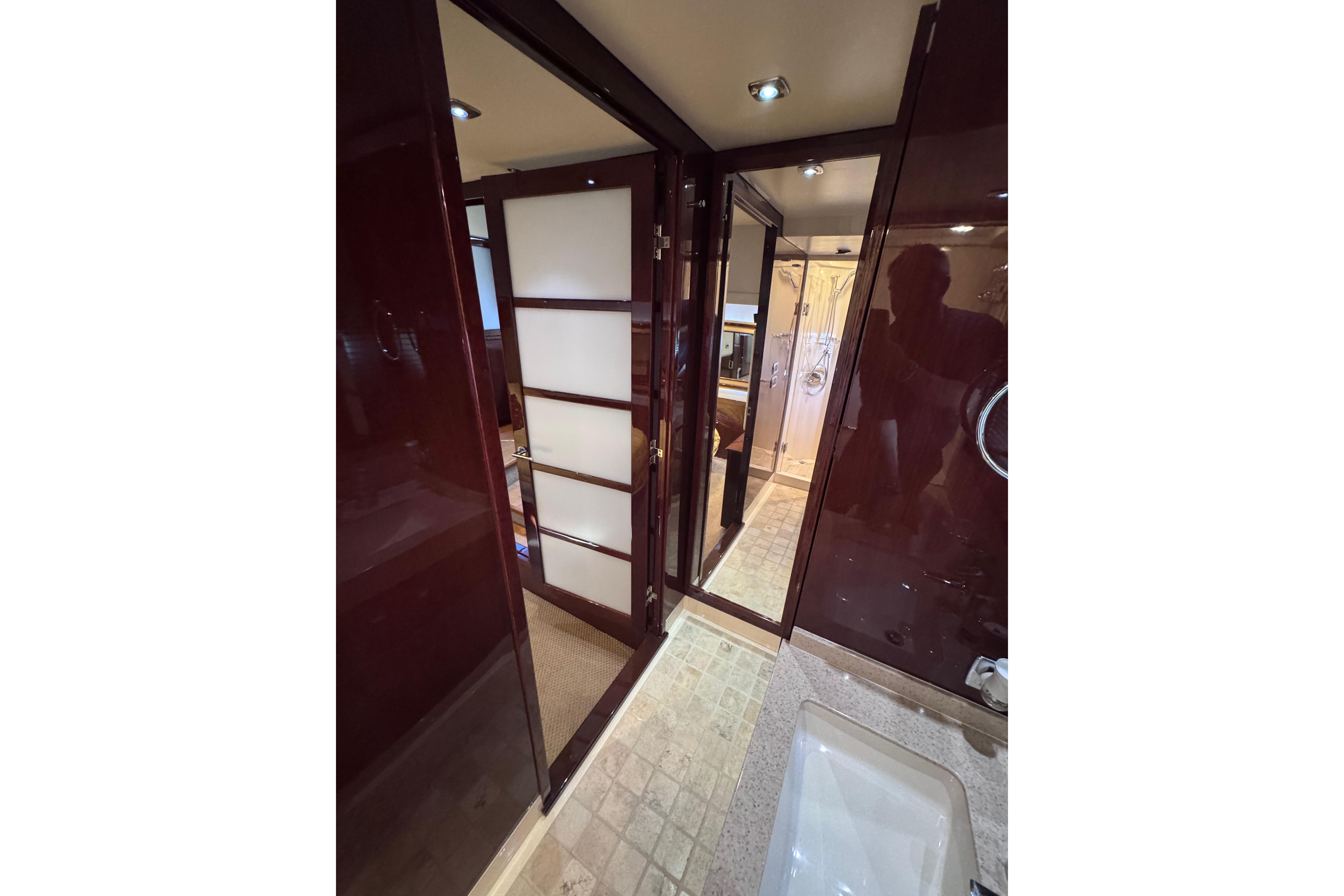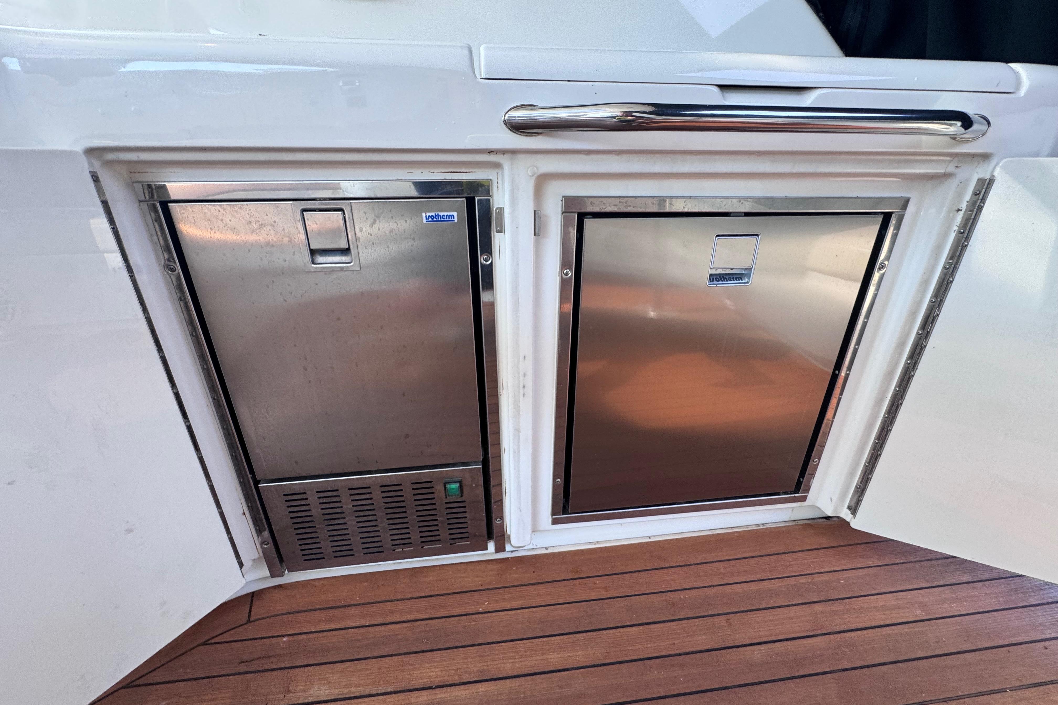You enter the spacious cabin from the helm deck on the Port side through a sliding door. Safety being a top priority with wide steps and handrails.