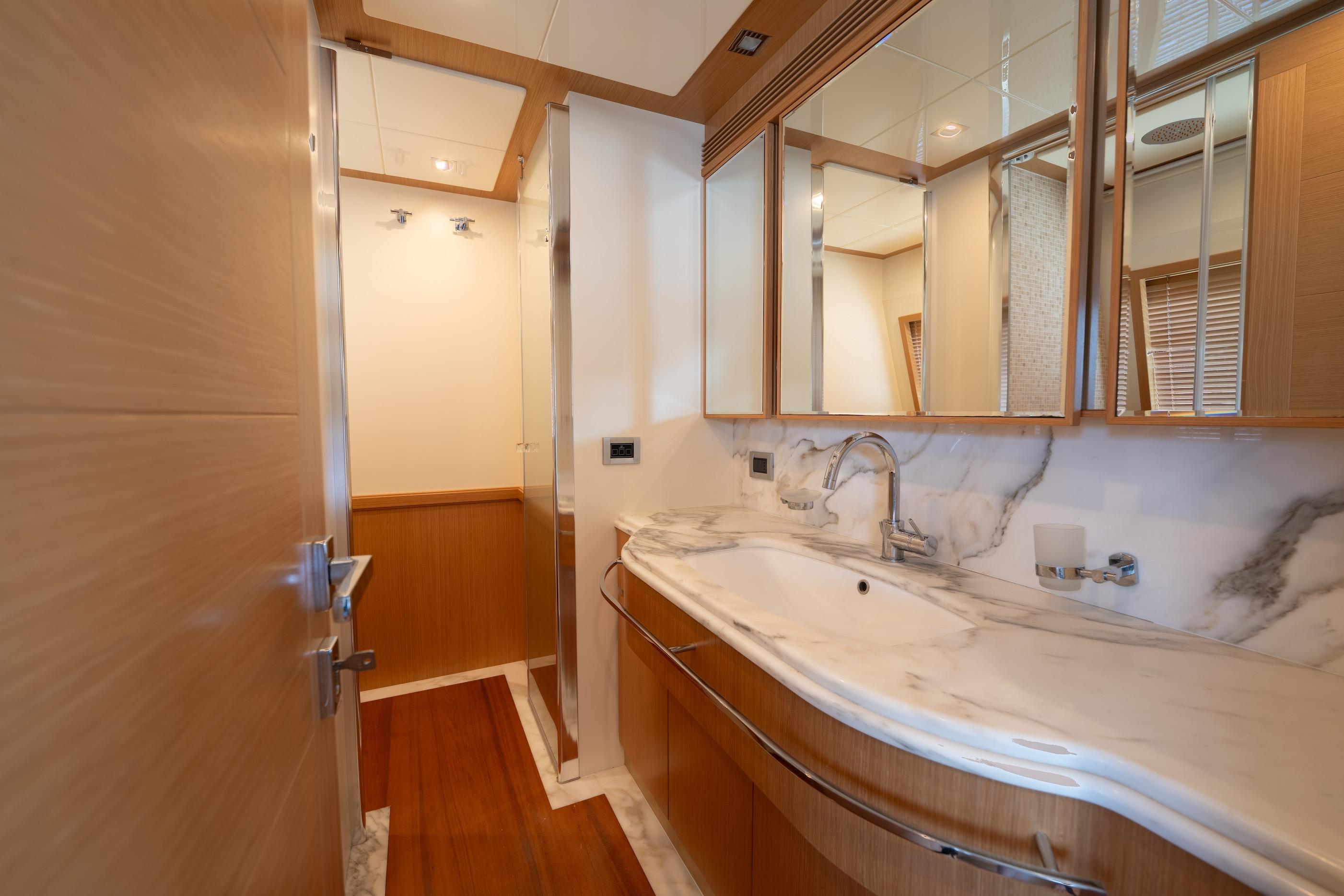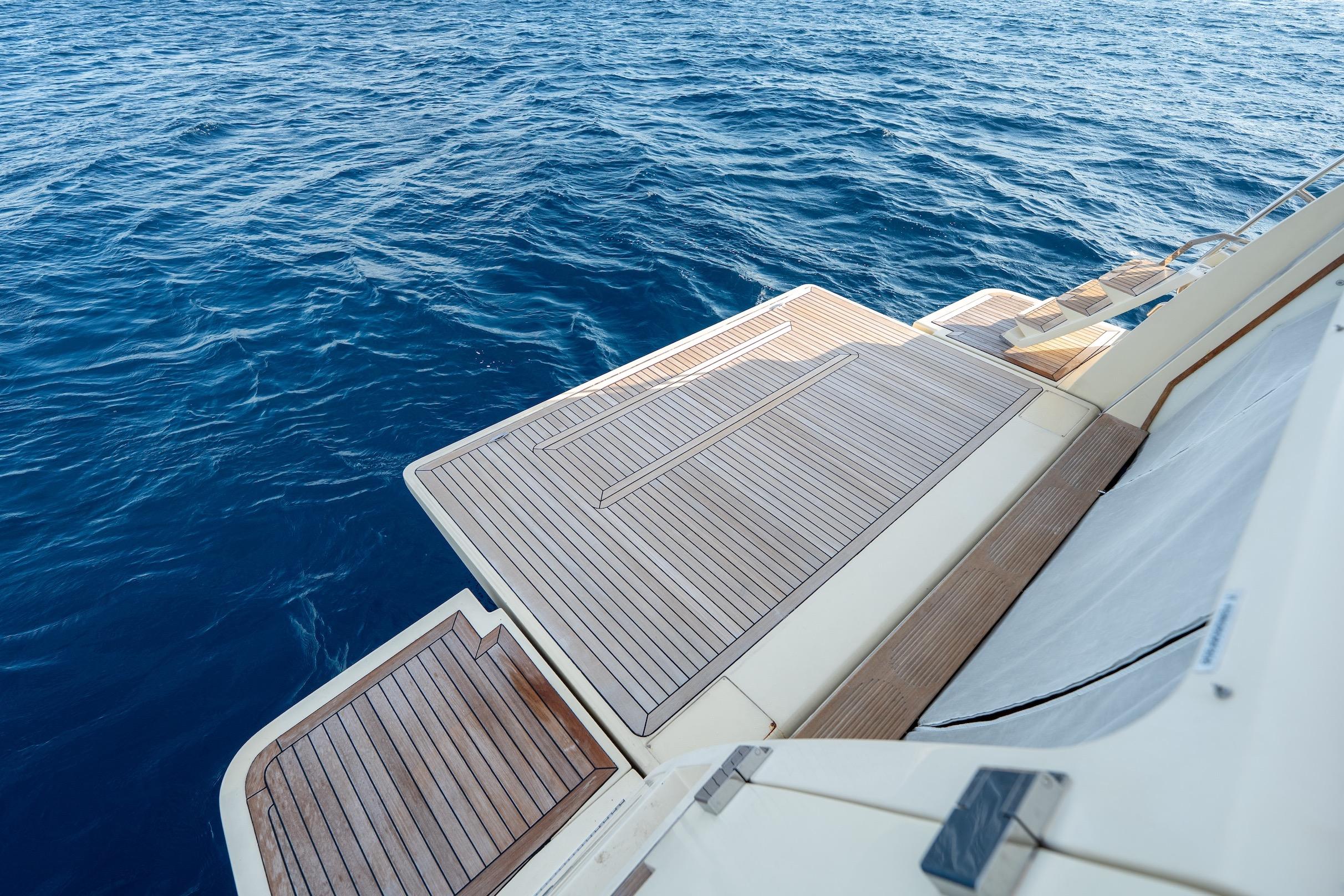 With a beach club type platform and a garage to store all the water toys, the yacht provides a maximum of entertainment for the guests. On the fore deck area, a comfortable seating settee and sunbeds are available ensuring a pleasant exterior experience.