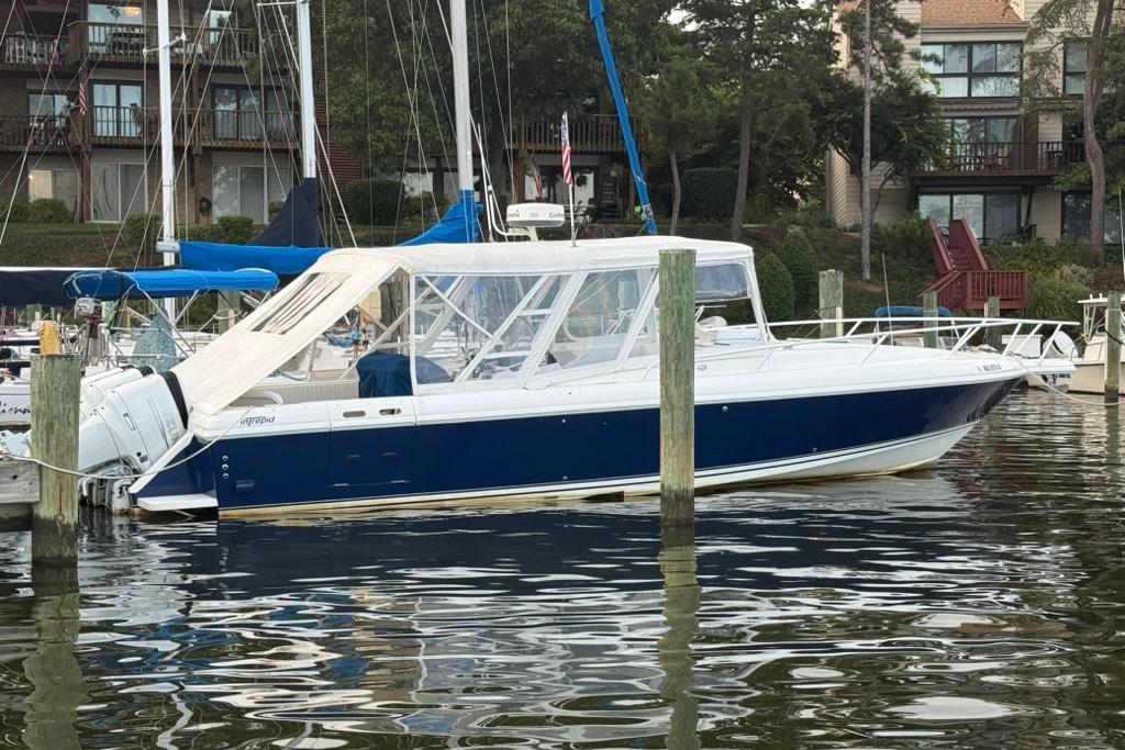 This beautiful Intrepid "Bushwacker" has been lovingly and meticulously maintained to look as good as any boat of its age can look. It's triple 300 HP Suzuki's were new in 2023, and have a factory warranty until 1/2028, with a factory option to extend. They currently have roughly 250 hours on them with the boat still being enjoyed by the current owners. Her Imron paint over a KEVLAR hull is in beautiful condition. The upholstery is in like new condition. She also received new canvas and isinglass enclosure in 2025.