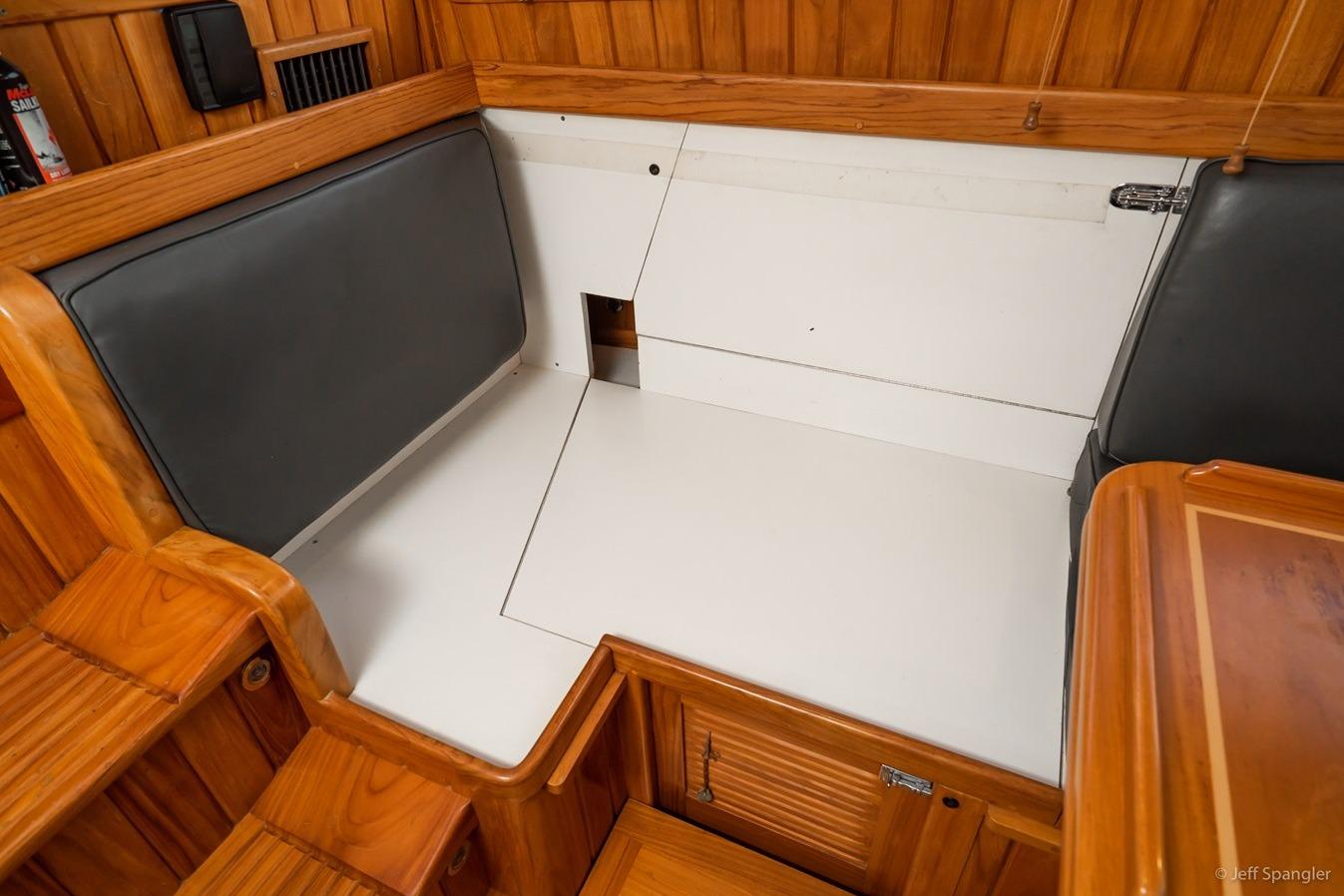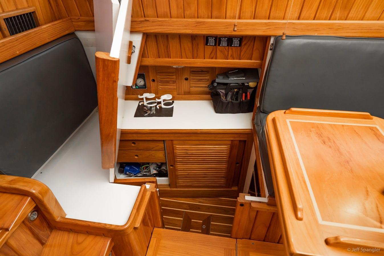 Forward is the master stateroom with a Queen innerspring mattress centerline bed. A large head with excellent headroom and a separate shower can be accessed from both the master stateroom and the salon. There is a spacious galley with an abundance of storage and usable counter space. Opposite the galley is a seating area with an entertainment-sized table. The seating area can also be used as a good sea berth. There is a washer/dryer and a separate freezer. The wonderful pilothouse salon provides excellent 360-degree visibility from a very comfortable Stidd helm chair. Some of the unique features of this area include a comfortable helm seat with full instrumentation, large windows with custom wood blinds for privacy. The convertible table provides an additional single berth, a custom flat screen TV in the ceiling, and large Nav-Table behind the helm. There is easy access to the aft cabin with a double berth and more storage. Her interior is Costa Rican teak woodwork and is built to a standard rarely seen today, and is in fantastic condition, creating a warm, dry, and inviting place to seek shelter from the elements. The aft cabin is built for the cruising couple with plenty of storage and a great workshop.