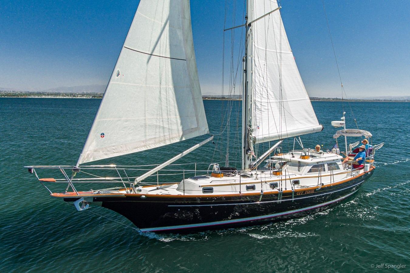 The cutter rig configuration keeps the sail size modest. With the Genoa and Staysail all on furlers, all foresails can be doused without going forward. The in-boom furling allows infinite adjustment of the mainsail size again without leaving the security of the cockpit. There is an electric halyard winch. While this is a heavy, powerful boat, sail handling will not require much in the way of brawn. This vessel is equipped with an aluminum double spreader mast with oversized wire rope rigging. It features a clipper bow with furling headsail, furling staysail and a second removable staysail (in storage); hank on staysail, running backstays; and a boom furling main. All control lines lead aft to the cockpit.