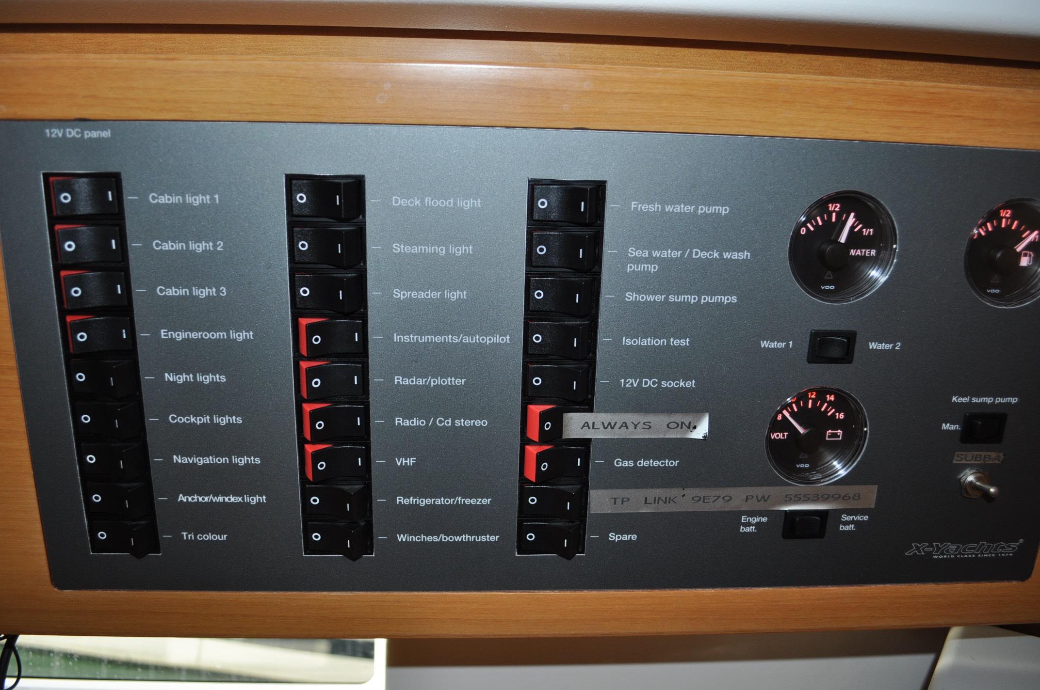 - X-Yachts main switch board with 27 automatic fuses and 3 analogue VDO meters for fuel, water and battery voltage