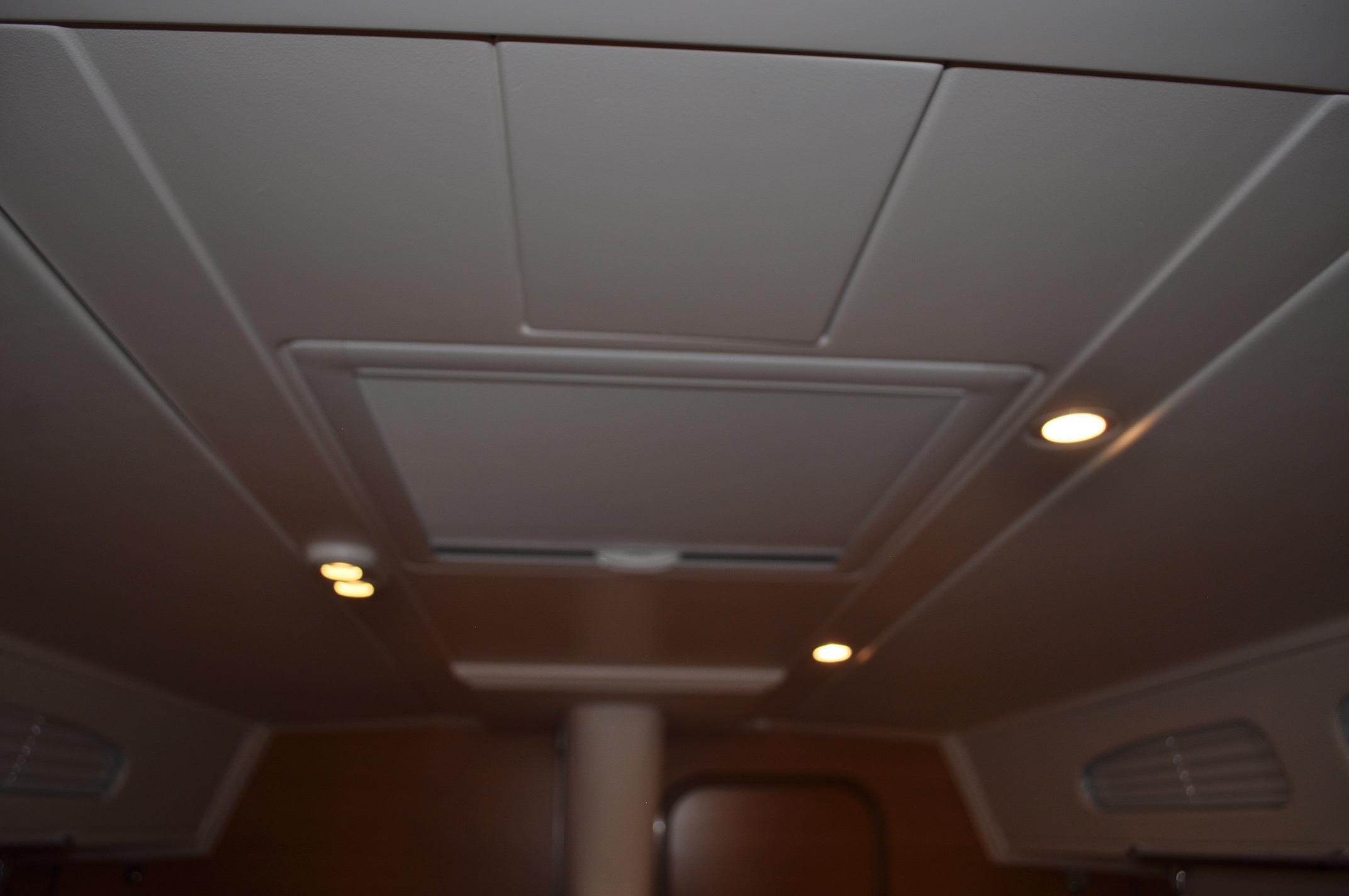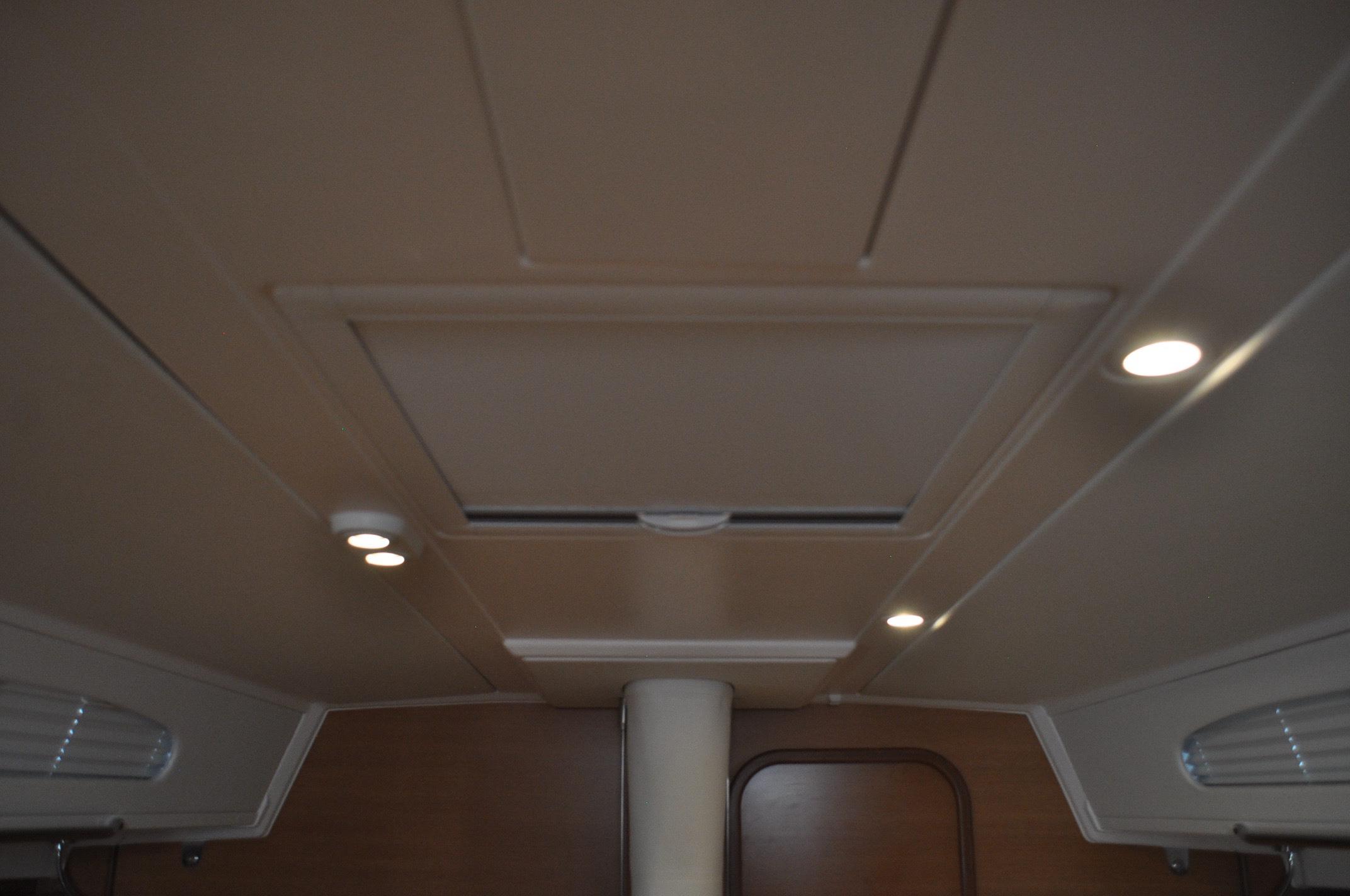 - GRP deck head liner with integrated light fittings. Pleated blinds hidden behind soft panneling on coachroof side