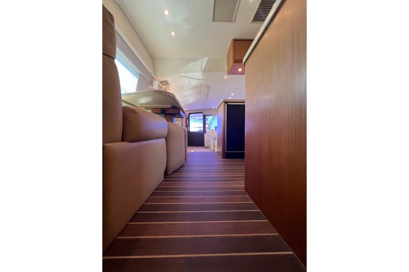 SalonEntering the Salon thru the electric automatic operated salon door (Marine Power Door) you are greeted by a Wide Open area that rivals much larger Yachts. There is a U-shaped sofa with plenty of storage underneath. TV/Surround Sound system