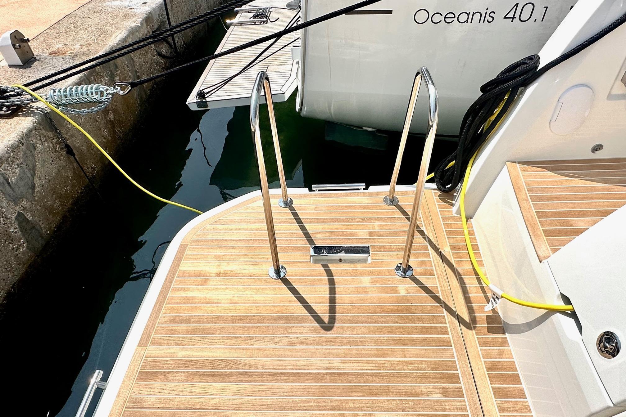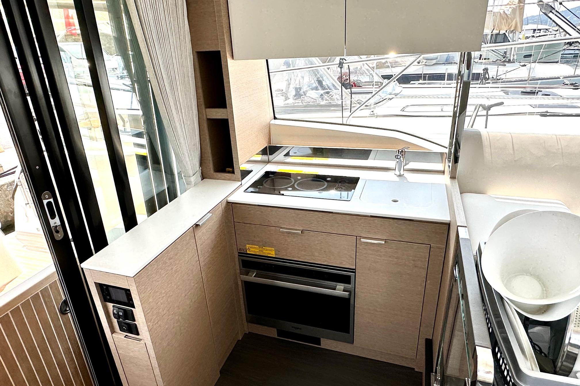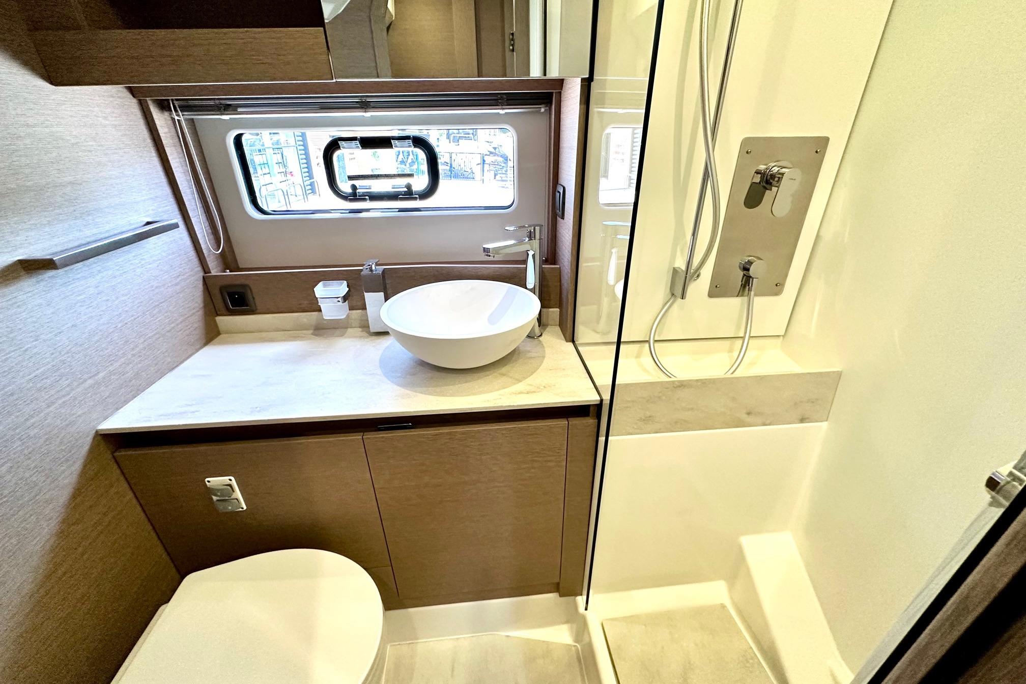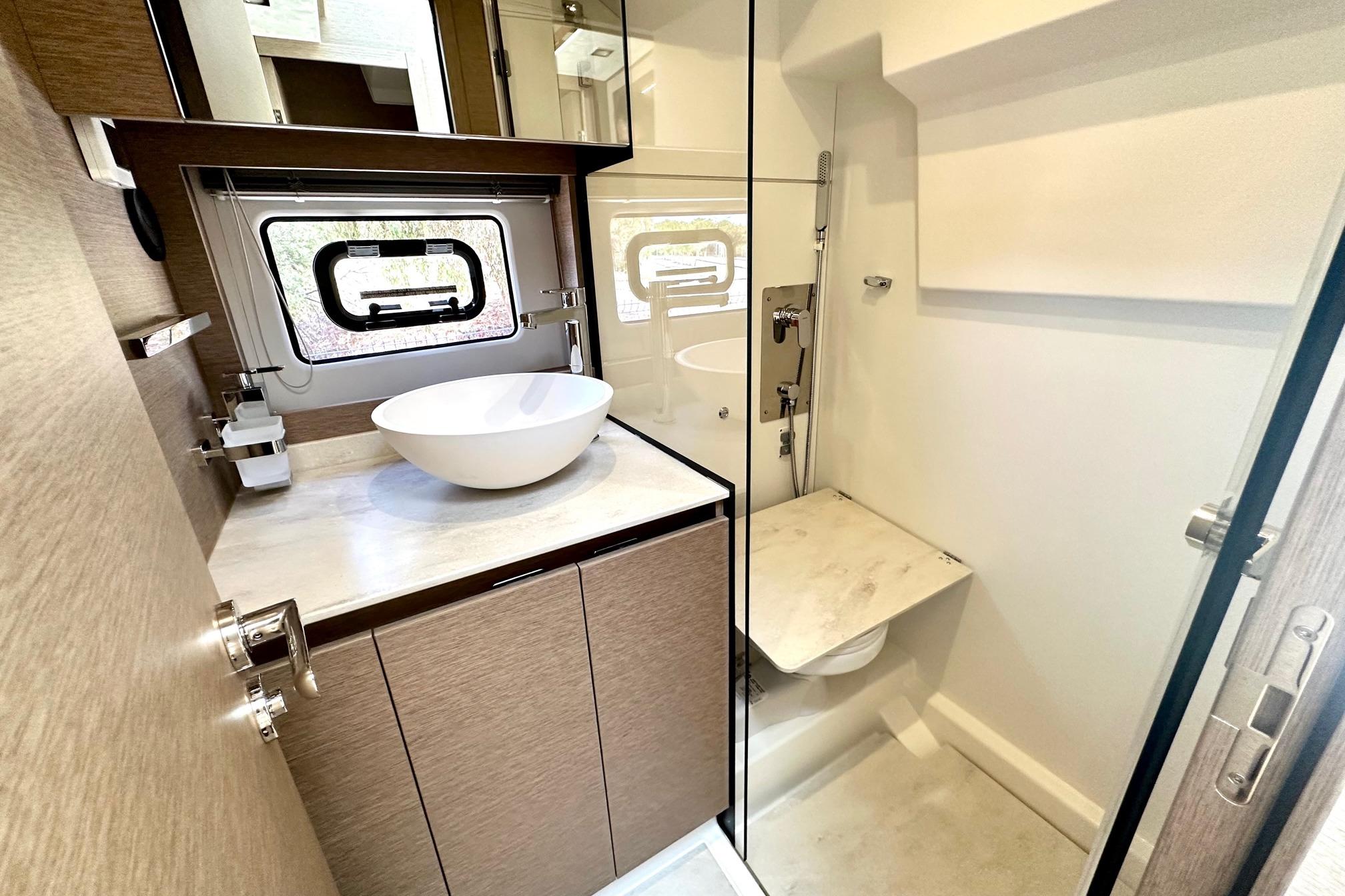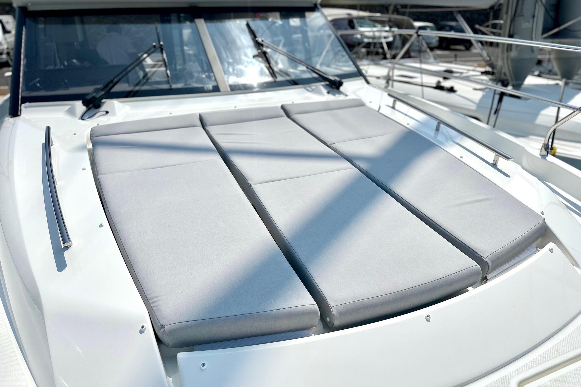 L’intérieur propose 2 cabines, 2 salles d’eau, un salon lumineux, une cuisine avec plan de travail en Corian blanc, et des finitions haut de gamme. Le pack électronique Garmin, la passerelle hydraulique, la climatisation tropicale, le teck sur cockpit et plateforme, ainsi que le pack TV et audio Fusion offrent un niveau d’équipement haut de gamme, pensé pour le confort et la convivialité à bord.