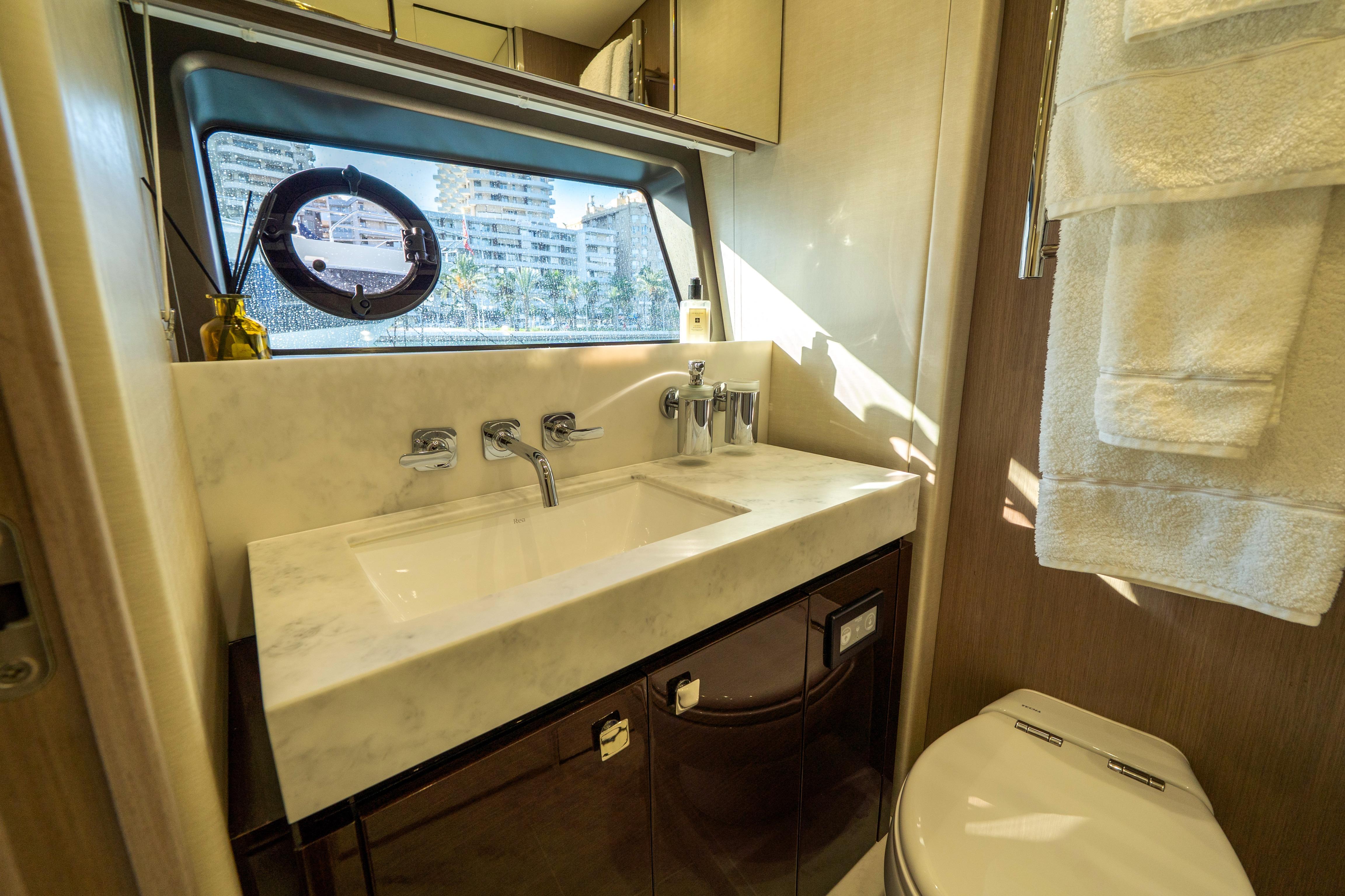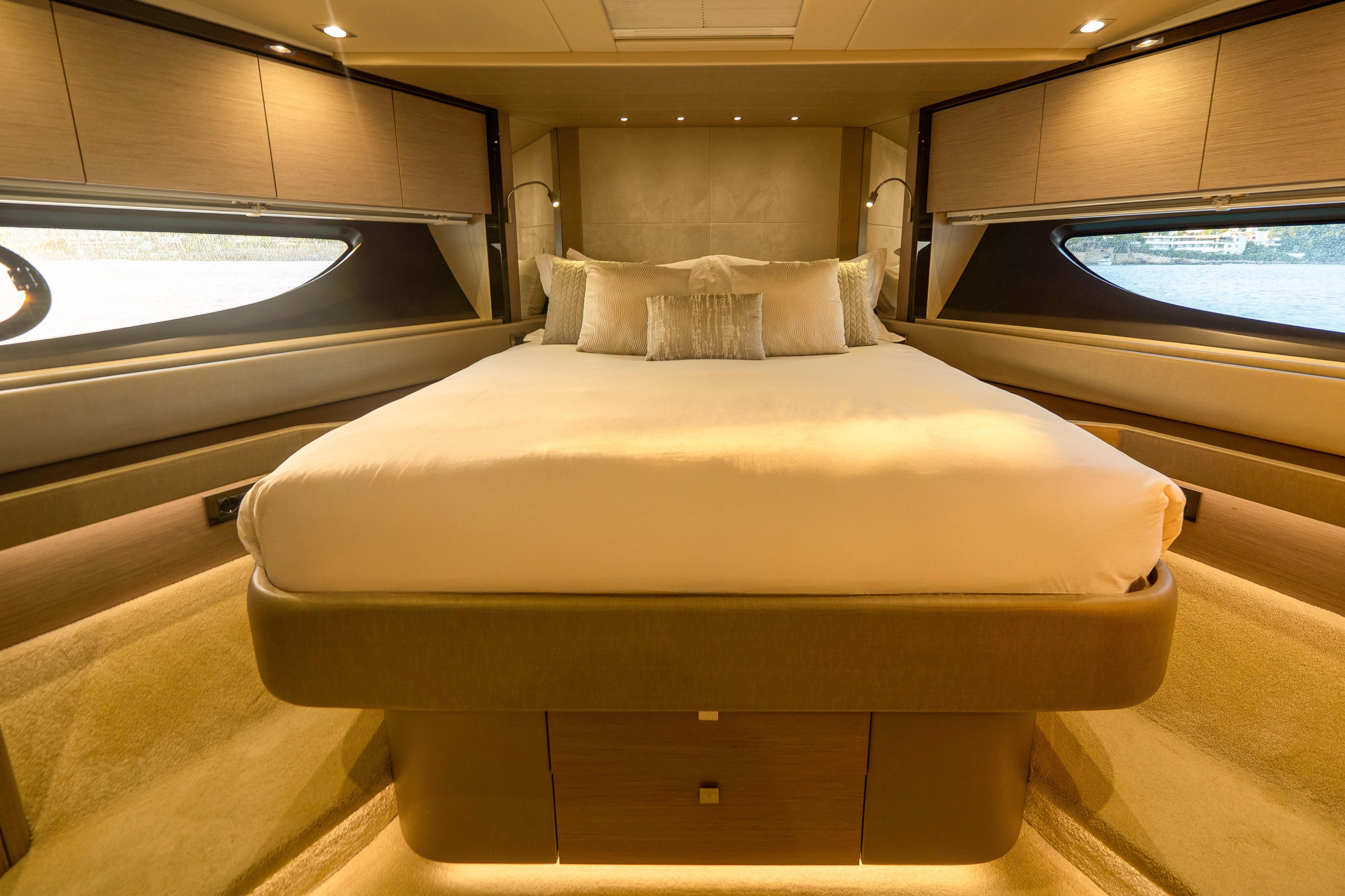 - Flybridge: Lavish bar, grill, and seating area for al fresco dining; accommodates up to 10 guests with two sunbathing zones