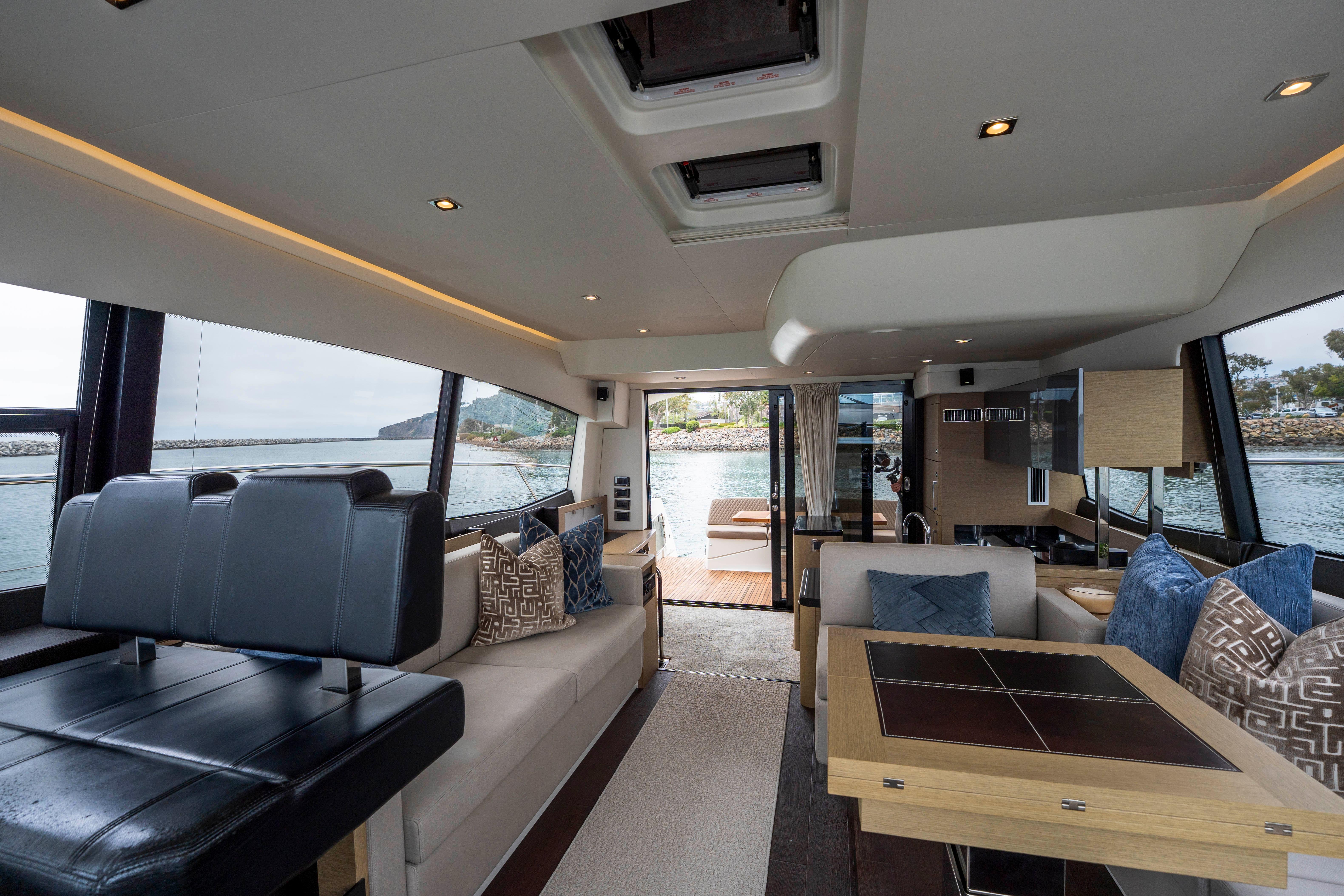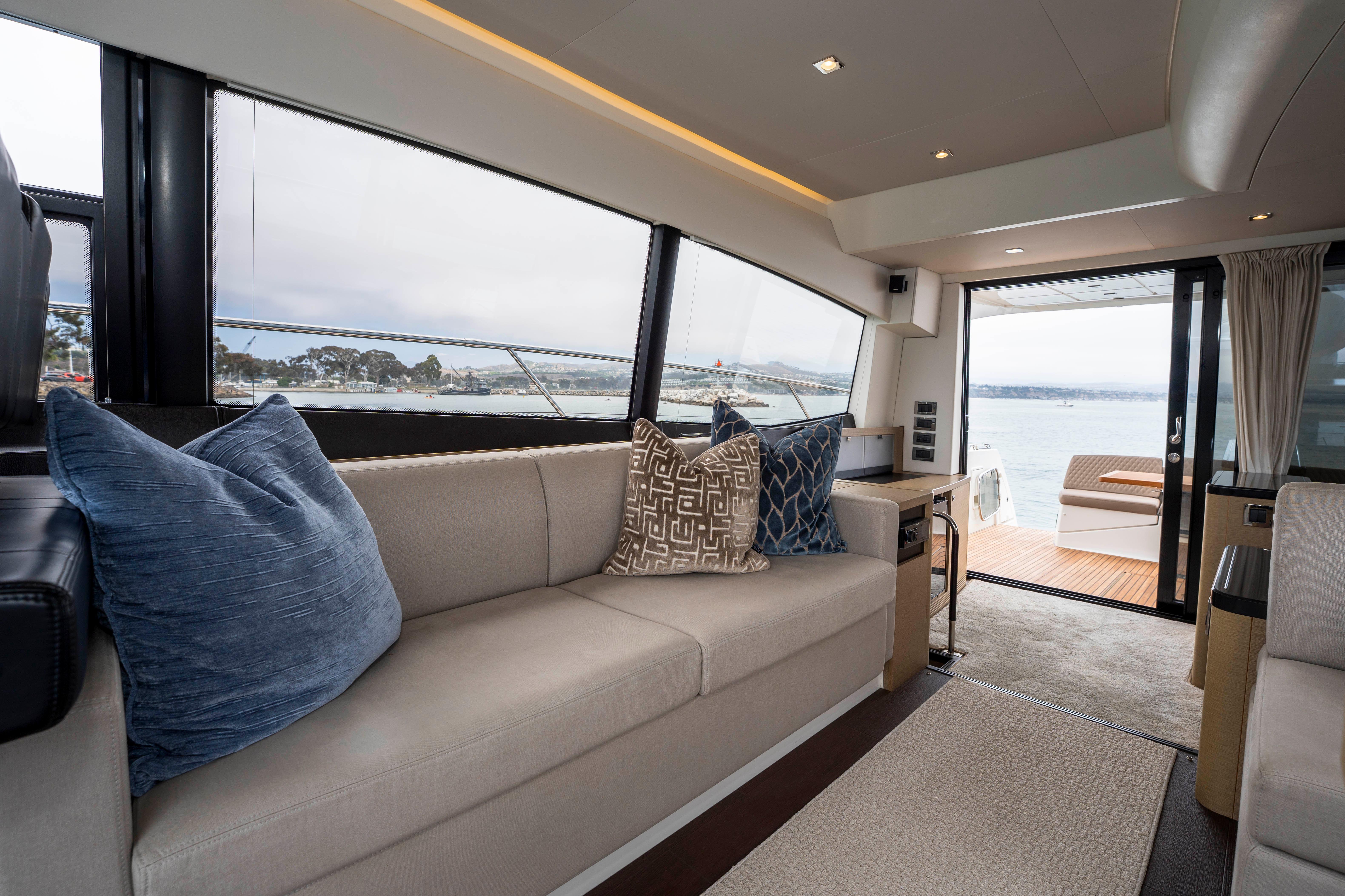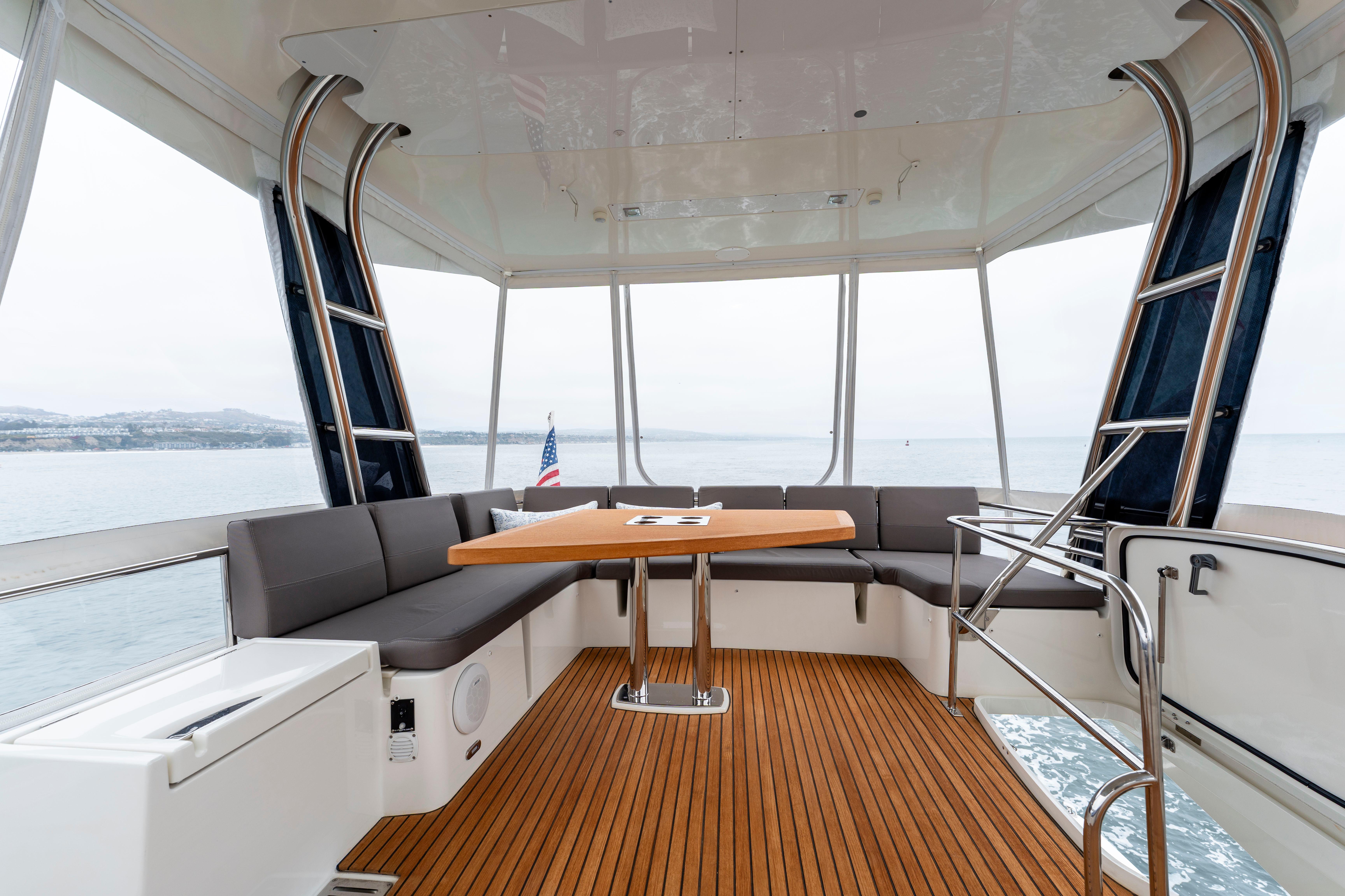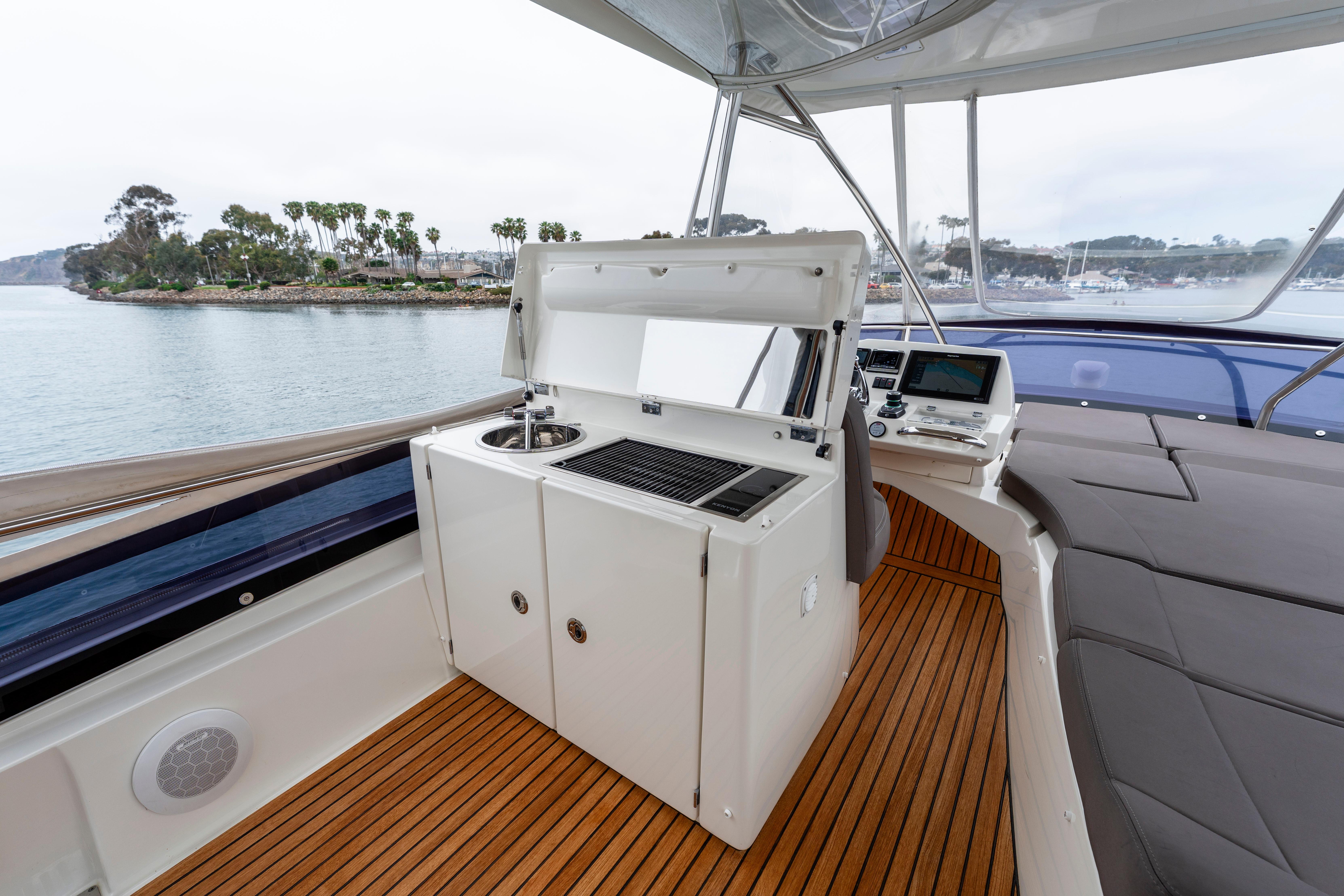 Host the ultimate sunset cocktail hour with a large U-shaped dinette, sunpad, upper helm, grill, wet bar, and fridge.