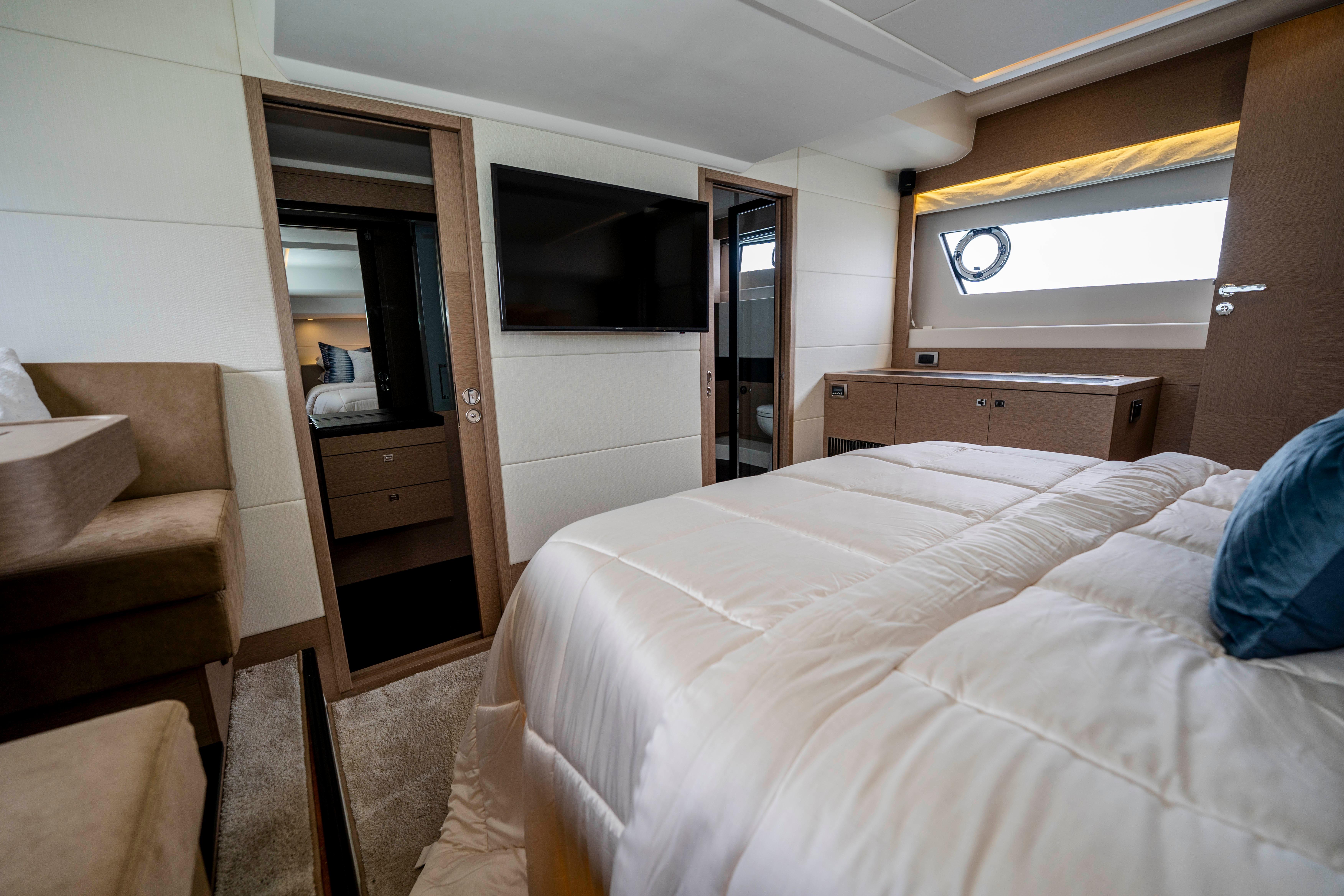 Centerline queen berth, overhead skylight, and shared en-suite access.