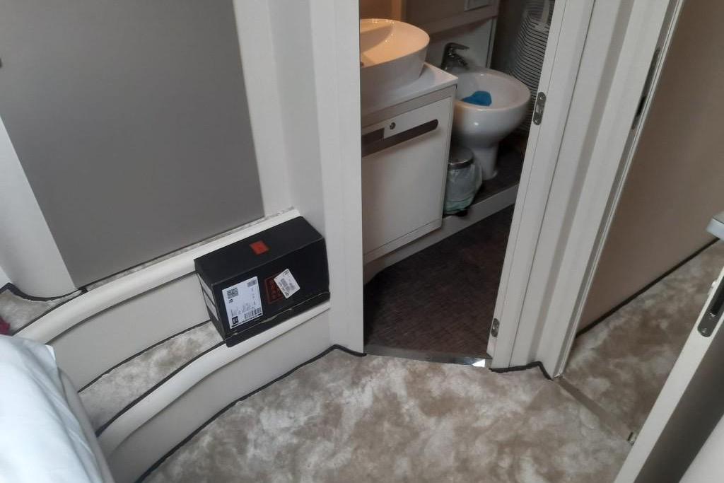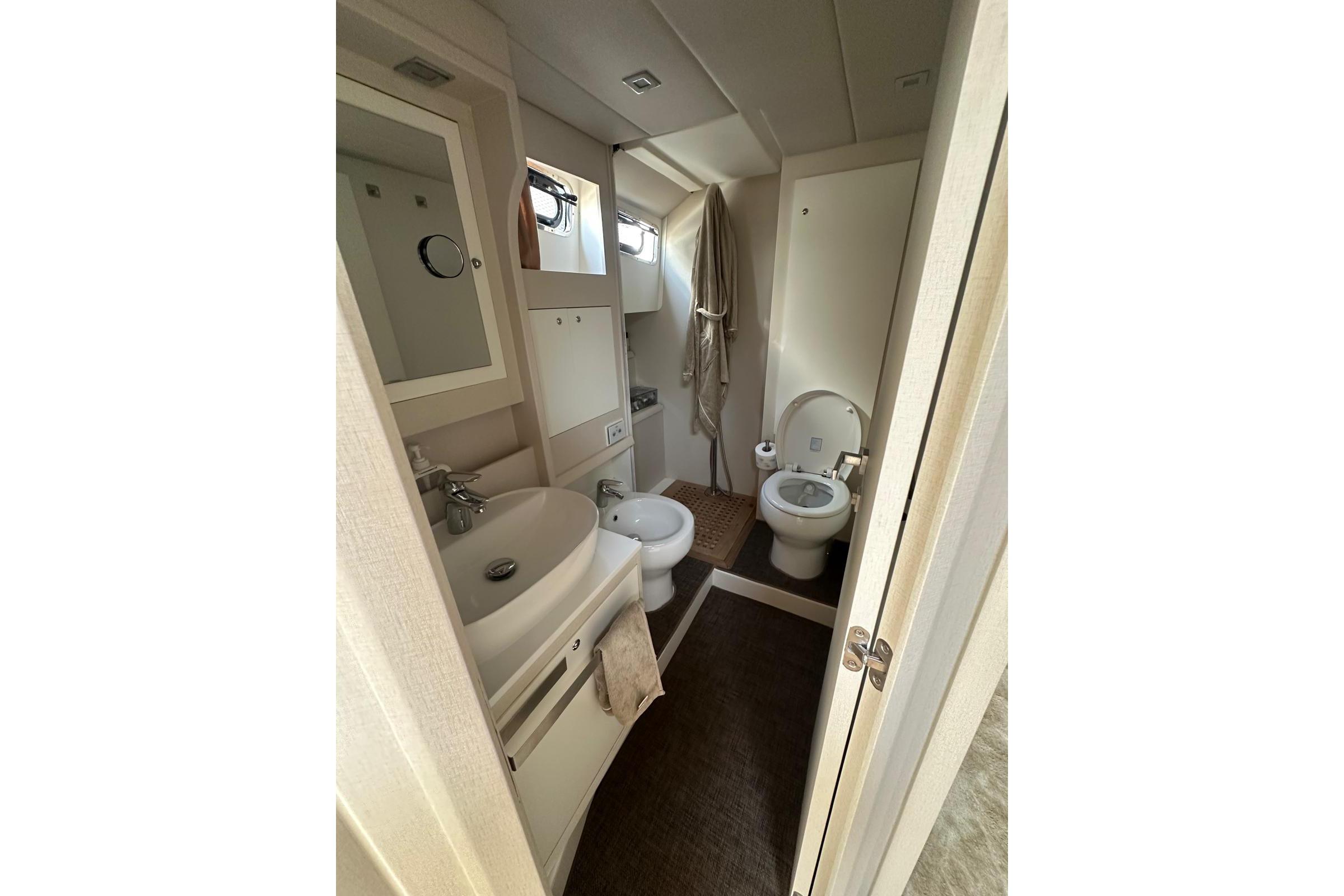 Layout with Master cabin and big bathroom with separate shower, twin cabin with two beds and bathroom, crew cabin with bathroom.
