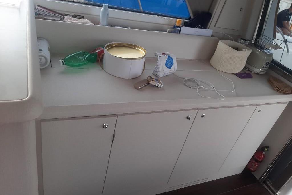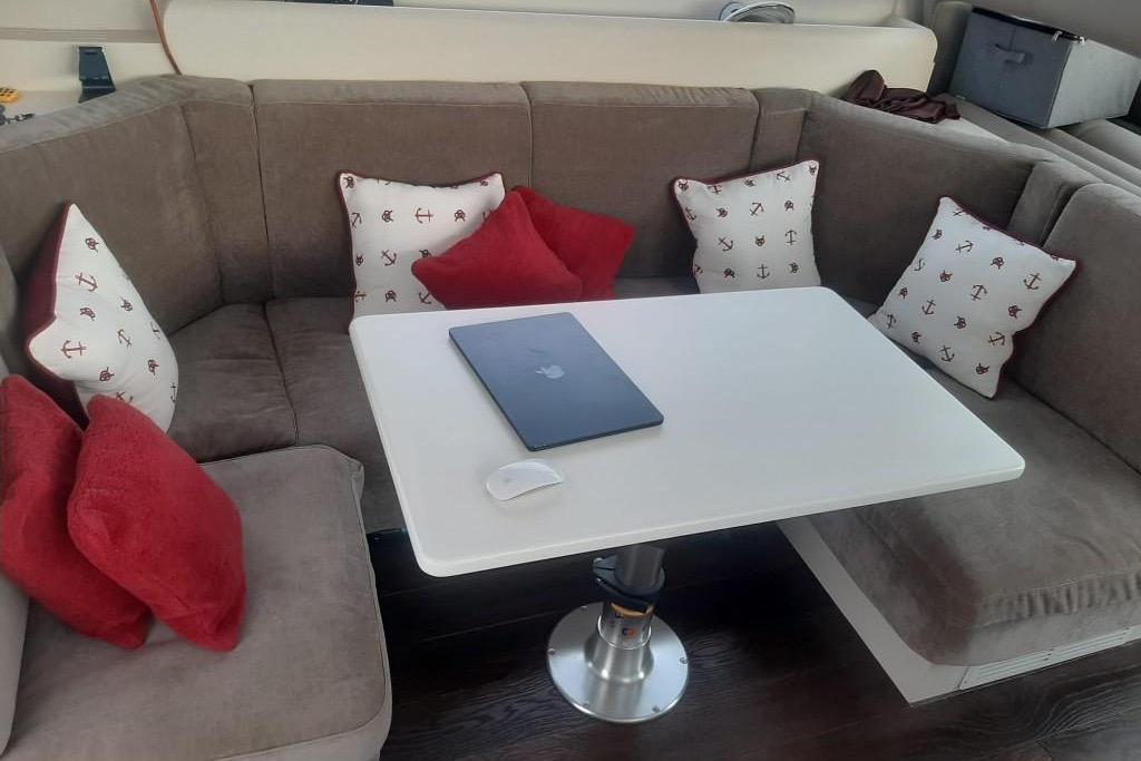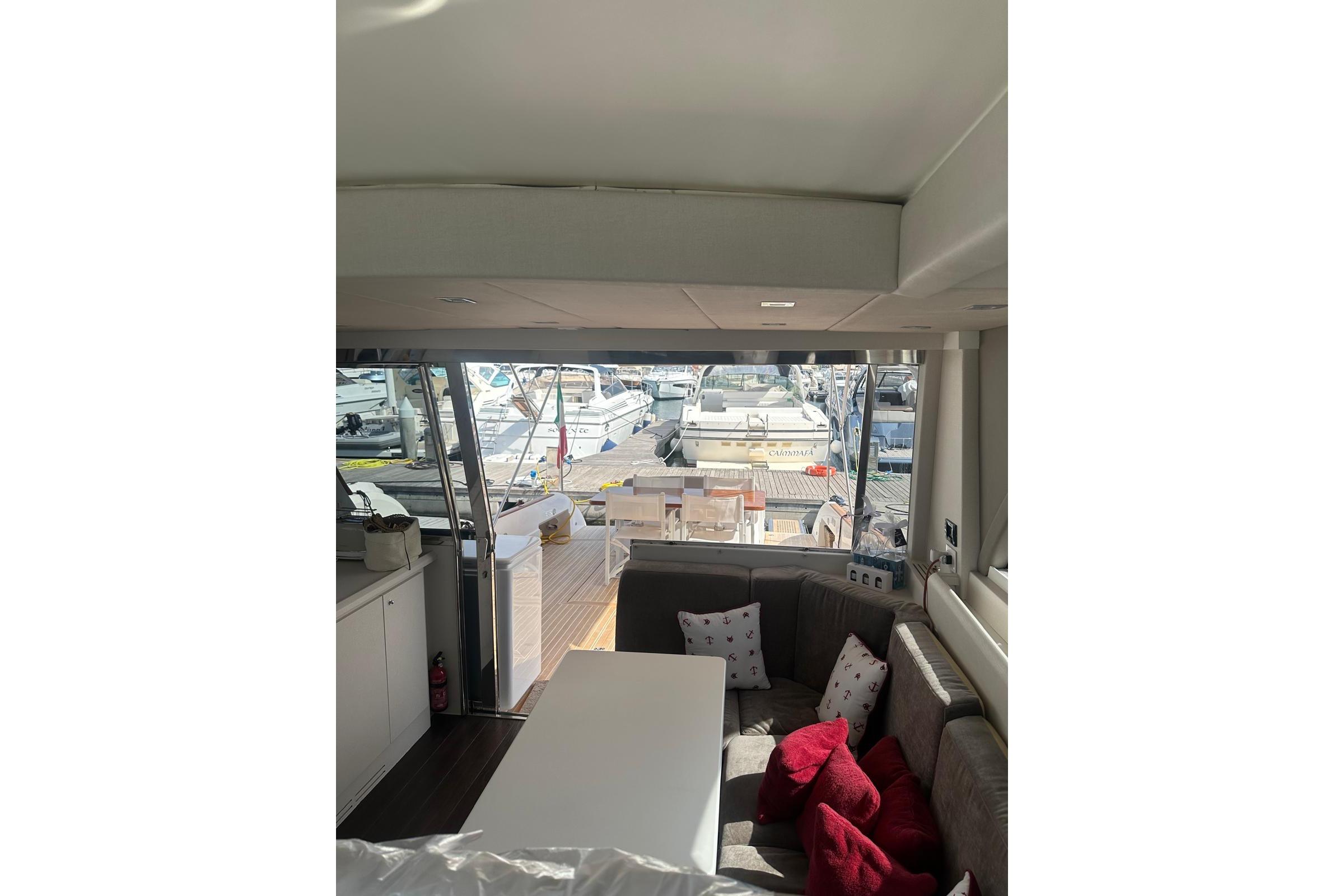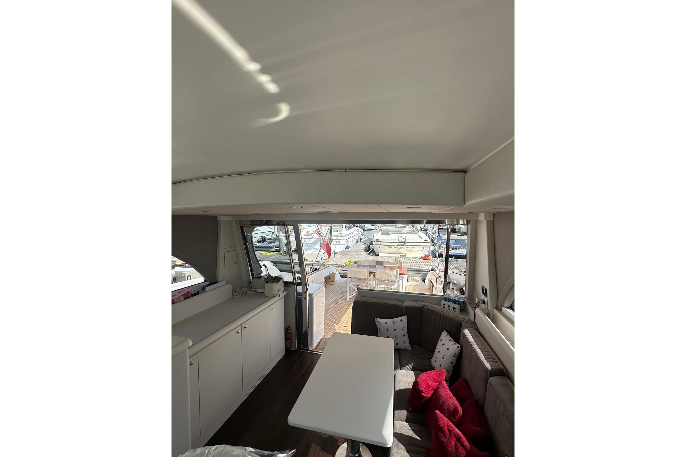 Interior dinette with C shaped sofa, central positioned table, TV furniture, navigation area and interior galley with stainless steel sink, induction hobs, fridge and electric oven.