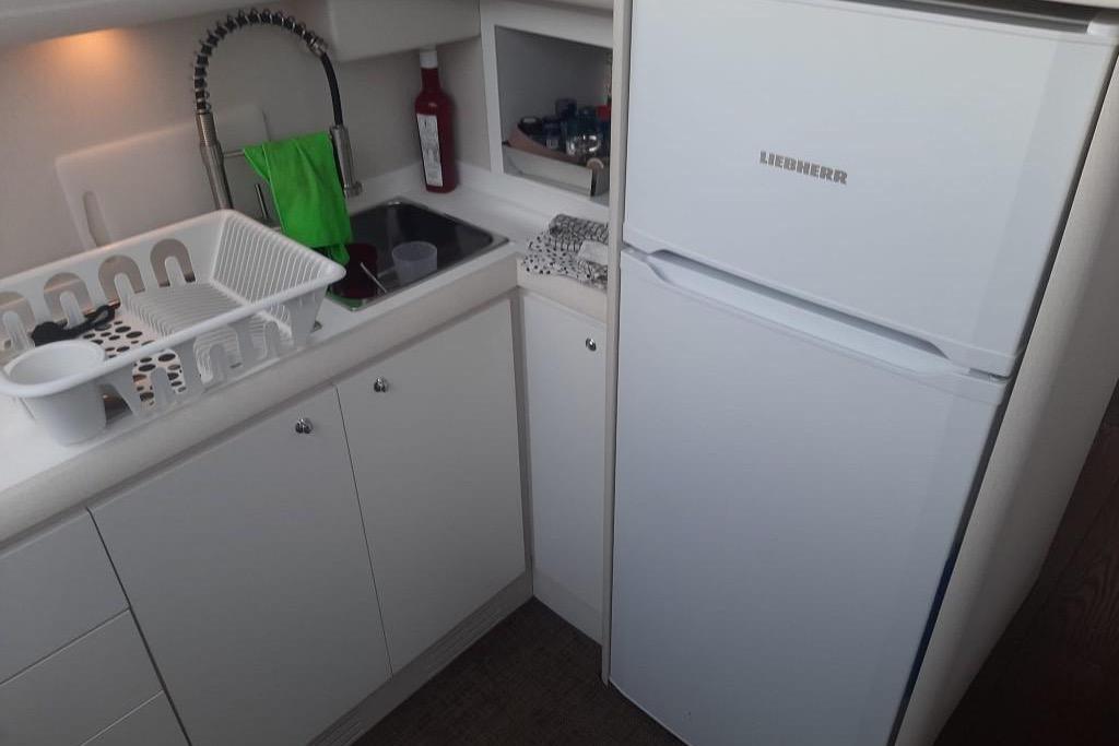Boiler for hot water. Galley with sink, hobs, oven, grill, fridge, washing machine.