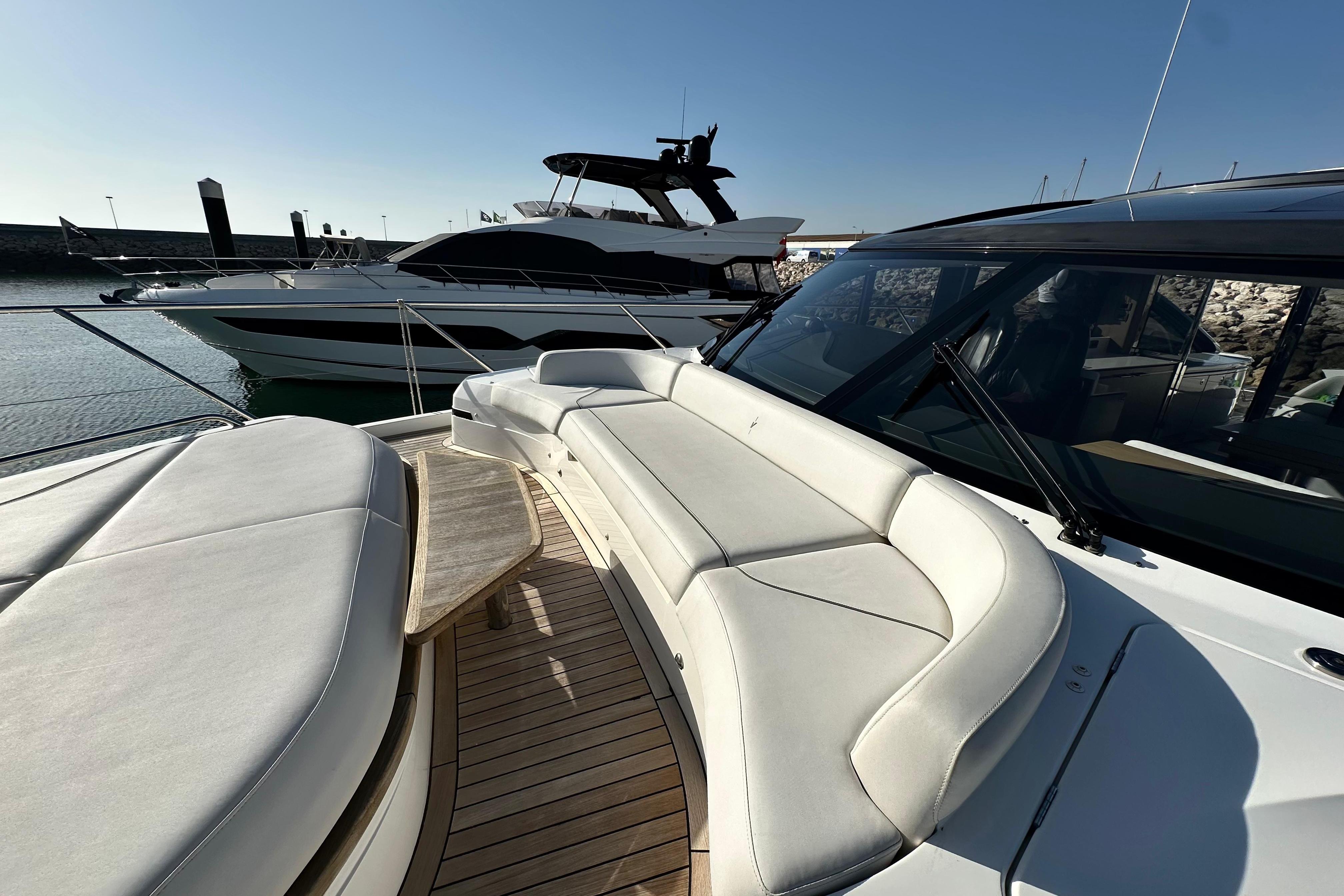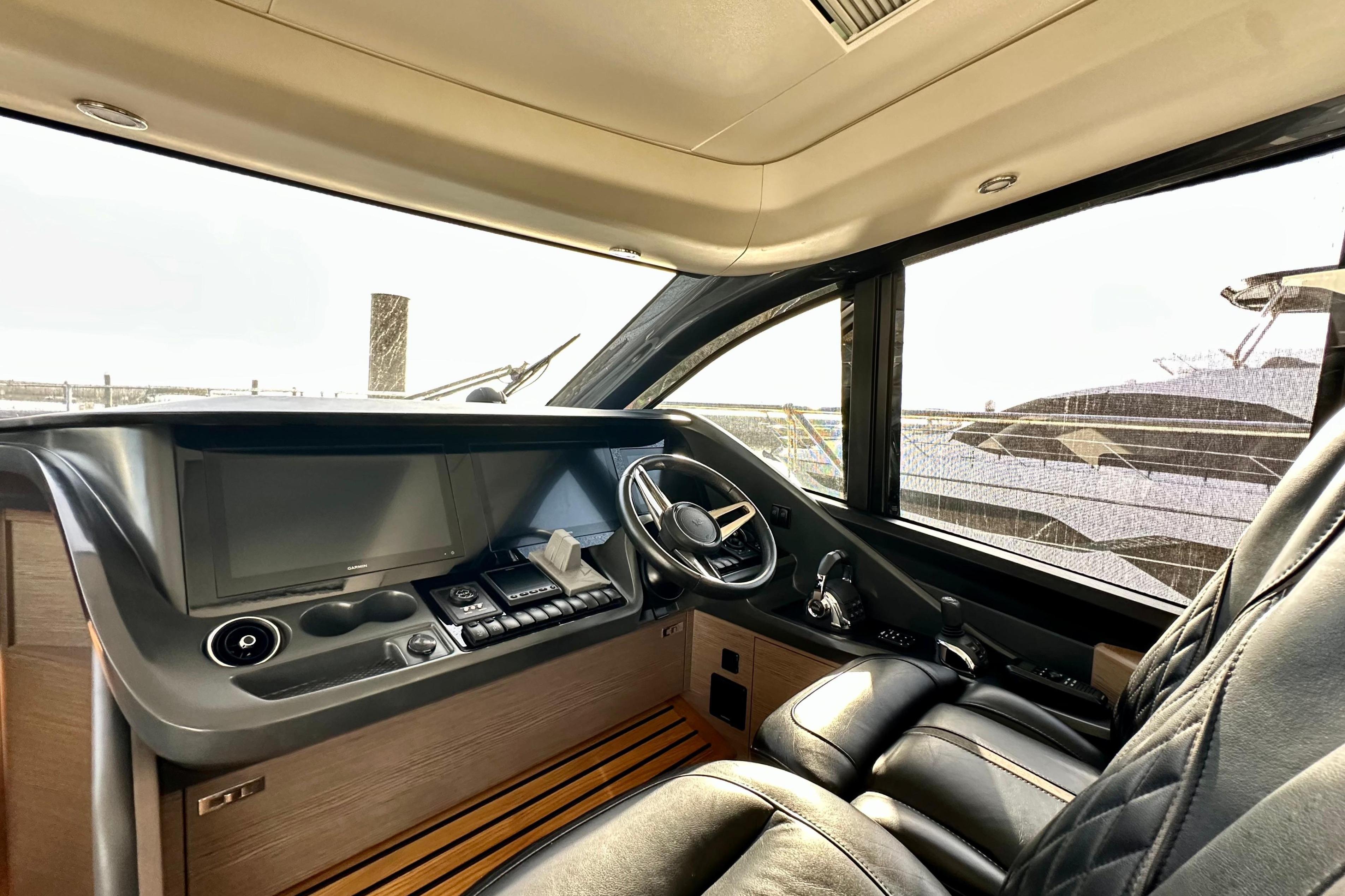 Clearly distinct of the V Class range are the clear sweeping lines, accentuated by the panoramic knife-shaped hull windows drawing in natural light and opening the interior out to the world around. The dynamic profile of the V55 conceals a spacious interior, perfect for relaxing or making longer journeys in supreme comfort. Access to the interior is via the hydraulic bathing platform, leading to a teak deck which runs throughout the living area. The cockpit connects to the main saloon via a cleverly concealed drop-down sliding patio door, seamlessly integrating both living areas. Plus, with the electric opening sunroof over the main deck, you can truly open yourself up to the elements.